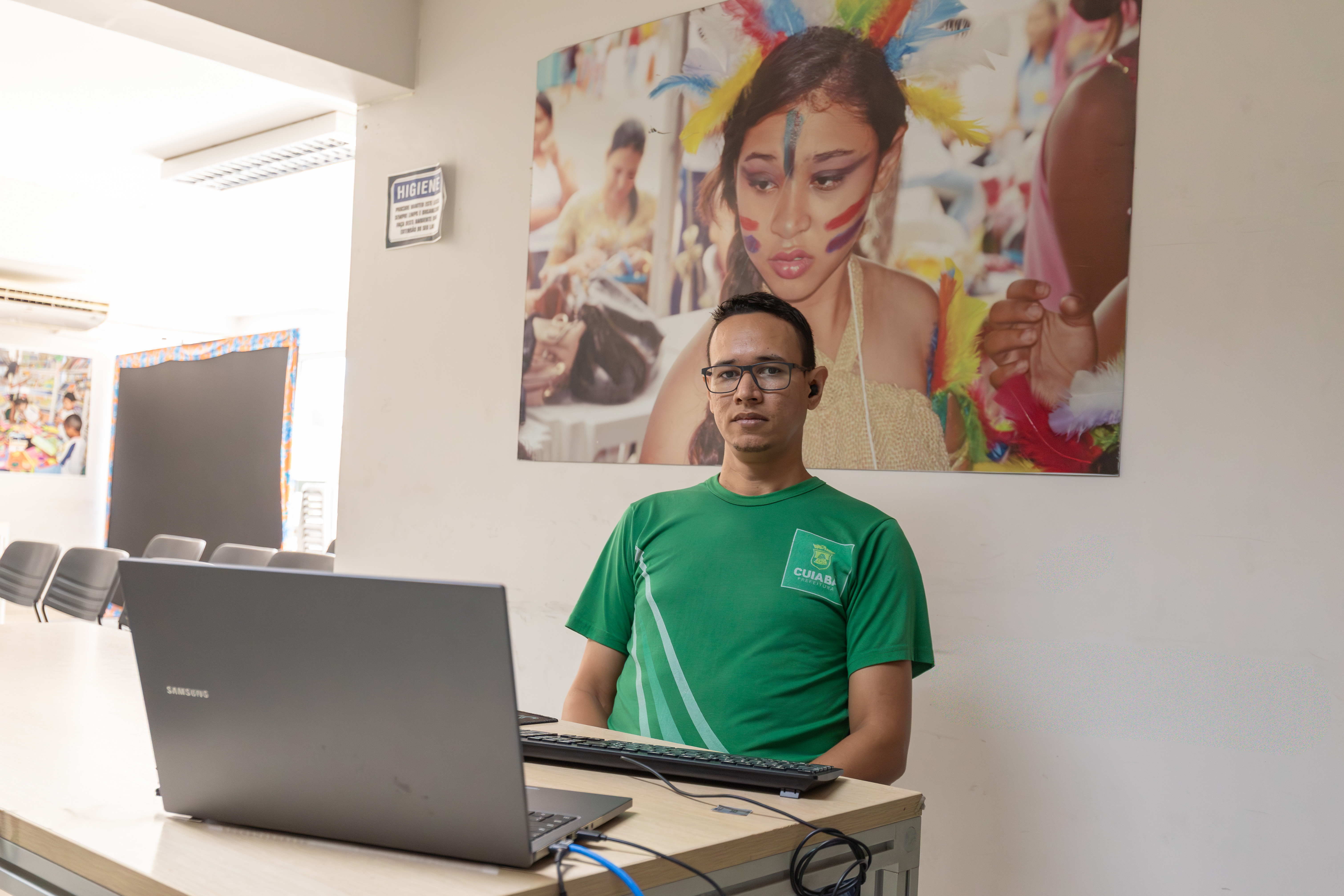 Nas proximidades do auditório Maestro China, localizado no espaço interno da Secretaria Municipal de Educação, um servidor está disponível para auxiliar no processo de matrícula dos novos alunos.