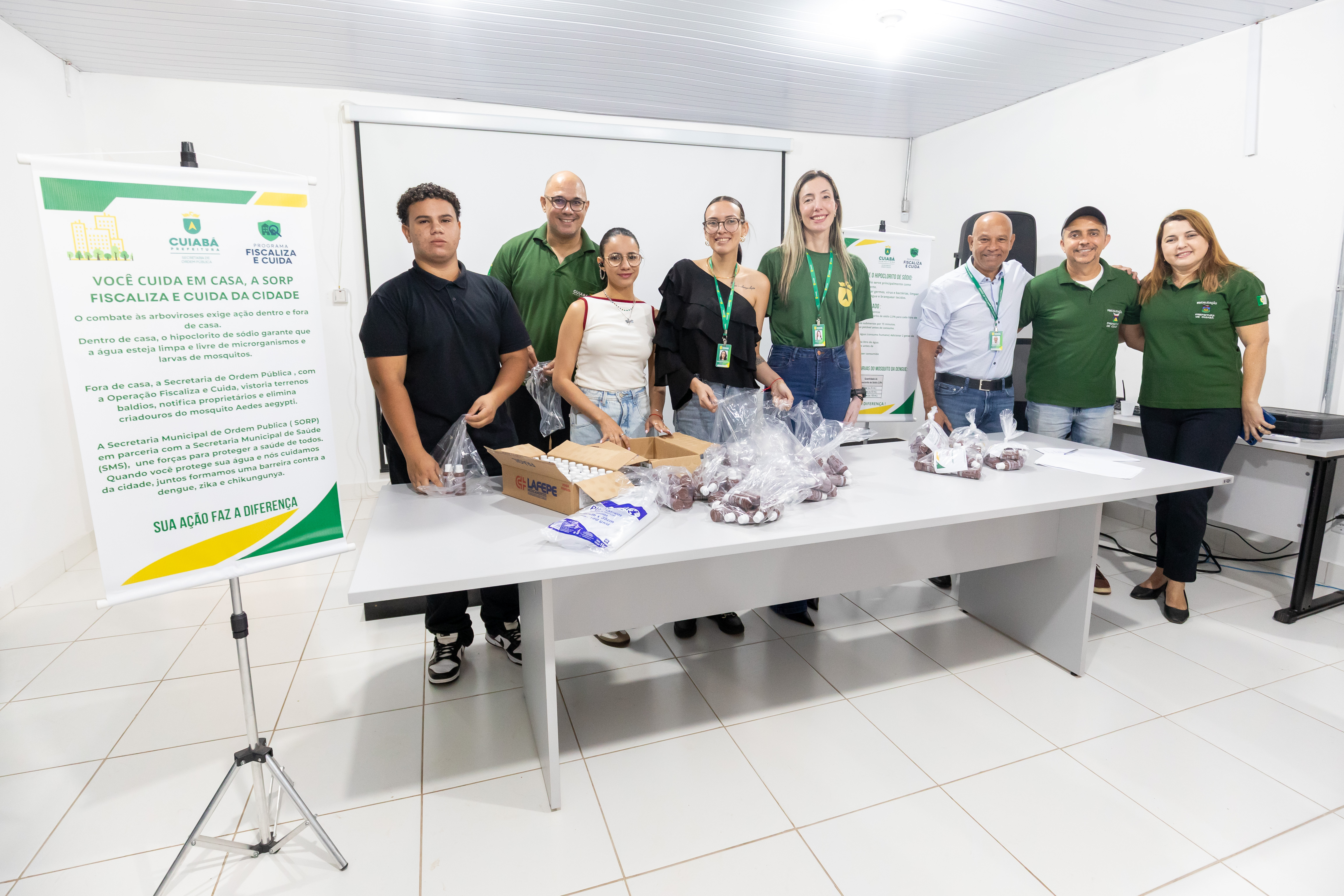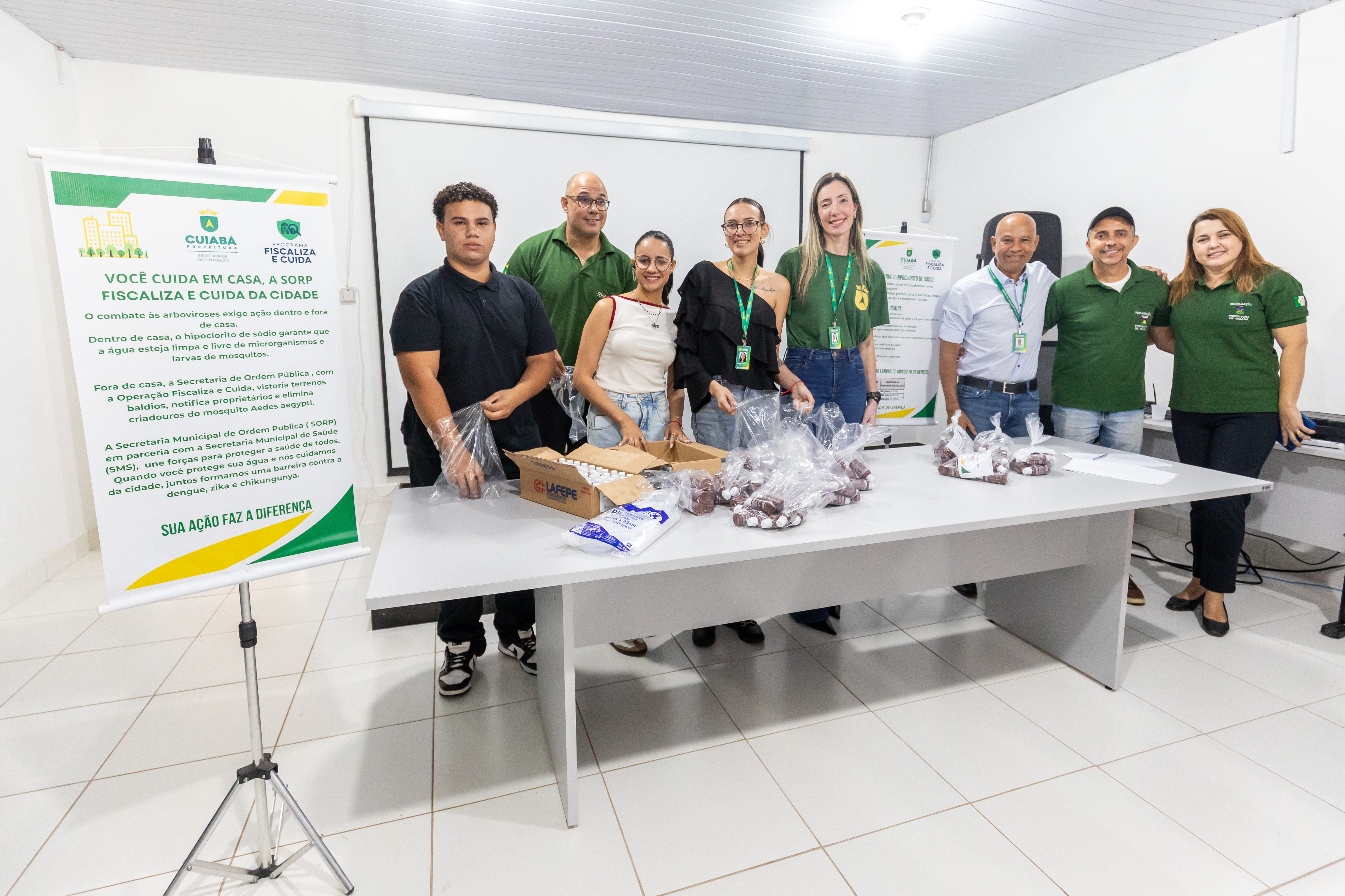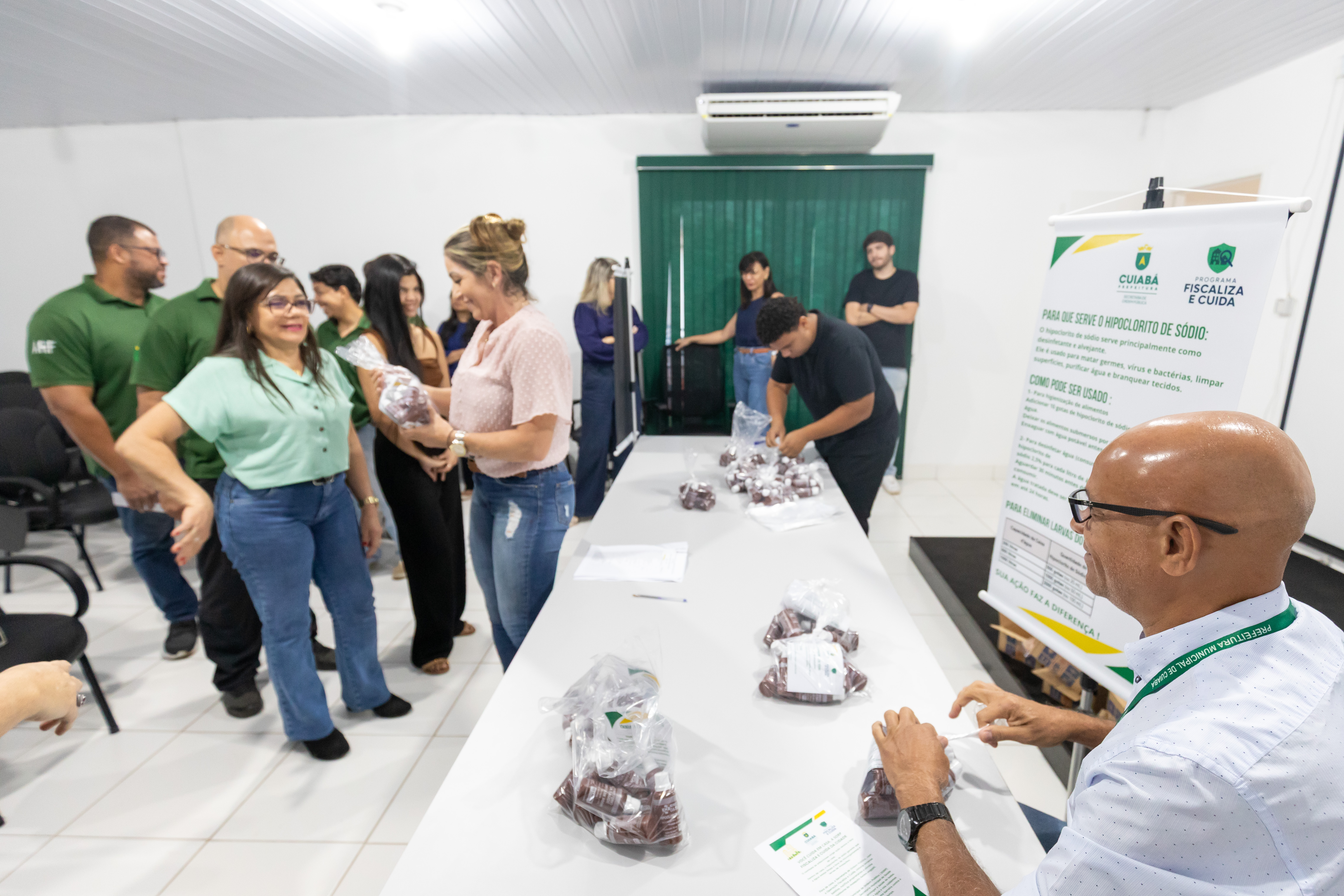 A foto ilustra o momento da entrega gratuita de hipoclorito de sódio e folders informativos aos servidores da Secretaria de Ordem Pública de Cuiabá.