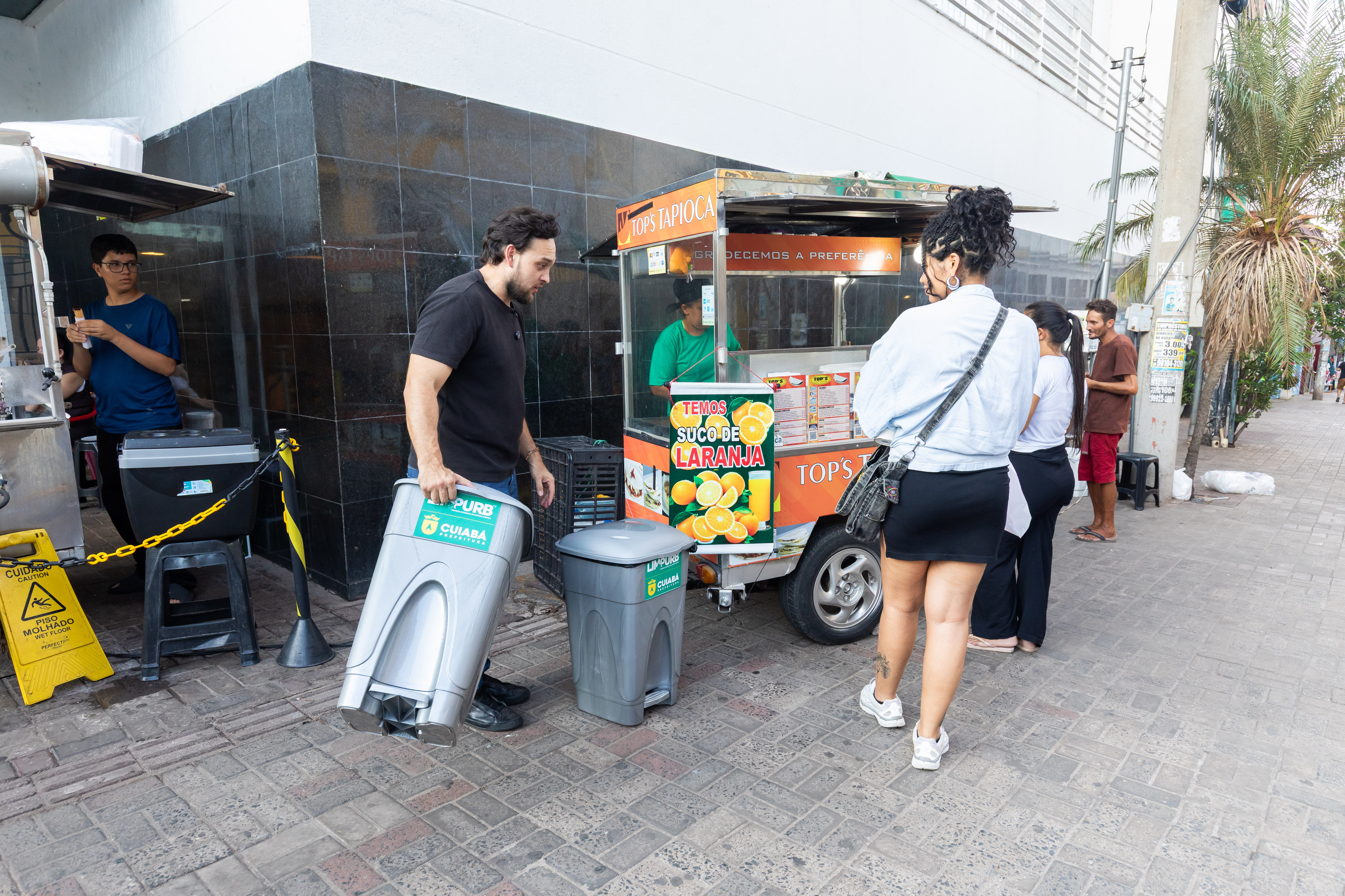 Confeccionadas em plástico e equipadas com pedal, as lixeiras foram distribuídas entre trabalhadores de barracas, trailers e pontos de venda de alimentos e bebidas, com o objetivo de fortalecer as ações de limpeza urbana e incentivar o descarte correto dos resíduos.