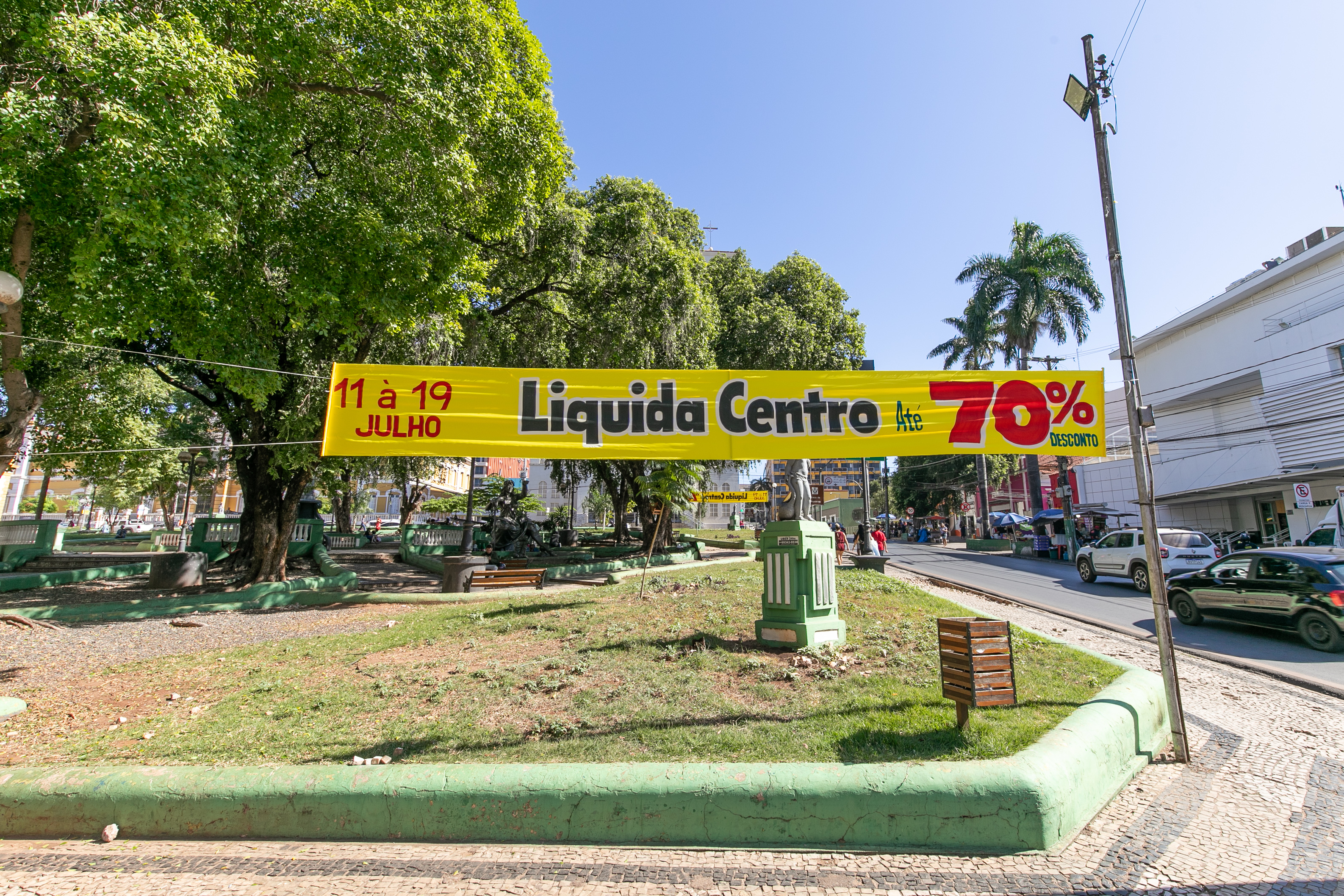 A foto mostra uma parte da Praça Alencastro, com uma faixa informando sobre os dias e percentual de desconto do Liquida Centro. Ao fundo do cenário está a Igreja Matriz de Cuiabá, com toda sua exuberância.