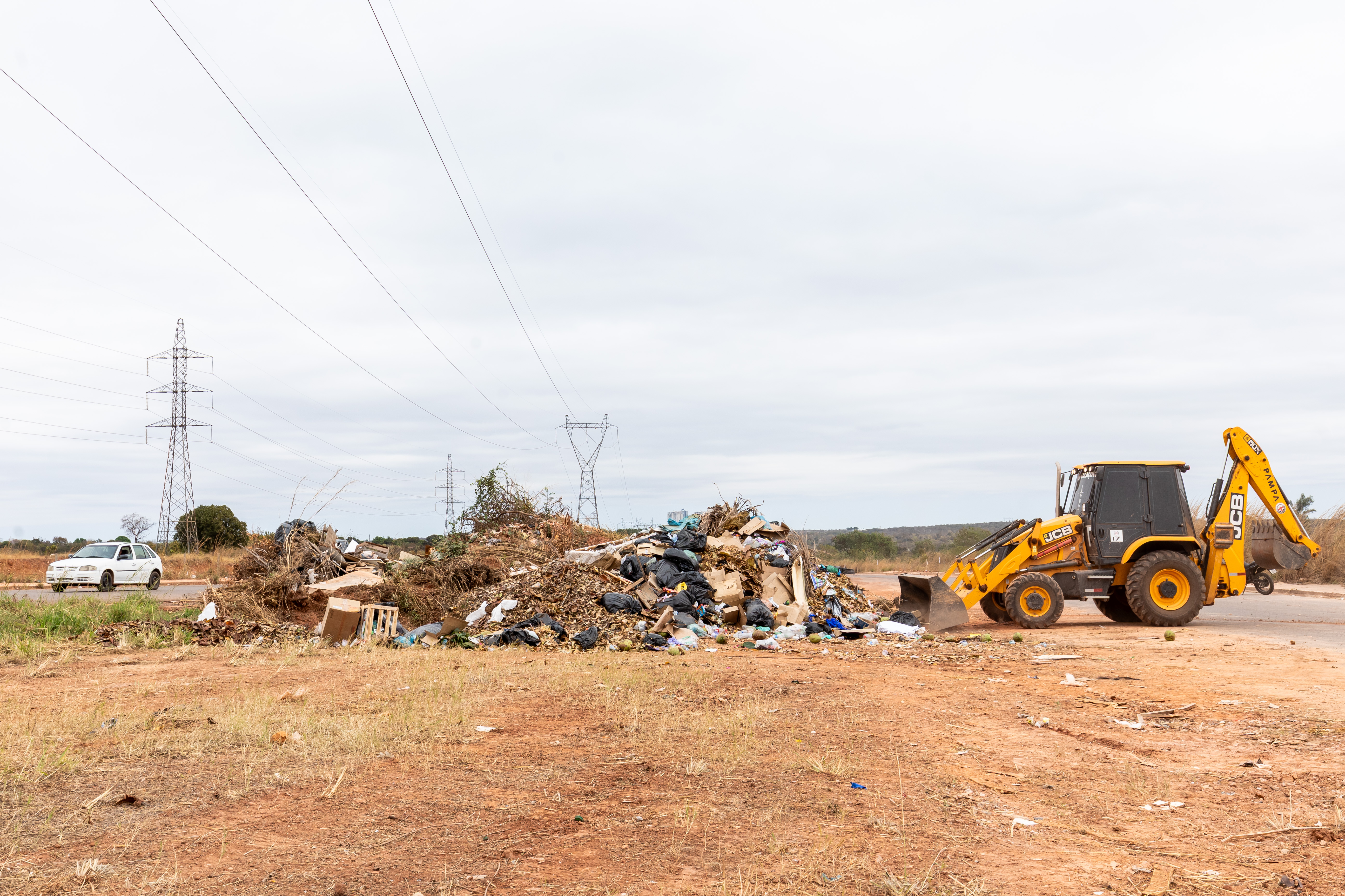 A imagem mostra um bolsão de lixo na avenida Contorno Leste. Ao fundo, uma pá carregadeira executa os serviços de recolhimento do material irregular.