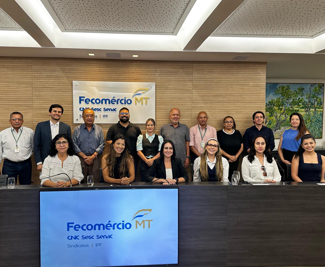 A imagem mostra representantes do setor de eventos, autoridades municipais e entidades reunidos no auditório da Fecomércio-MT durante a reunião.