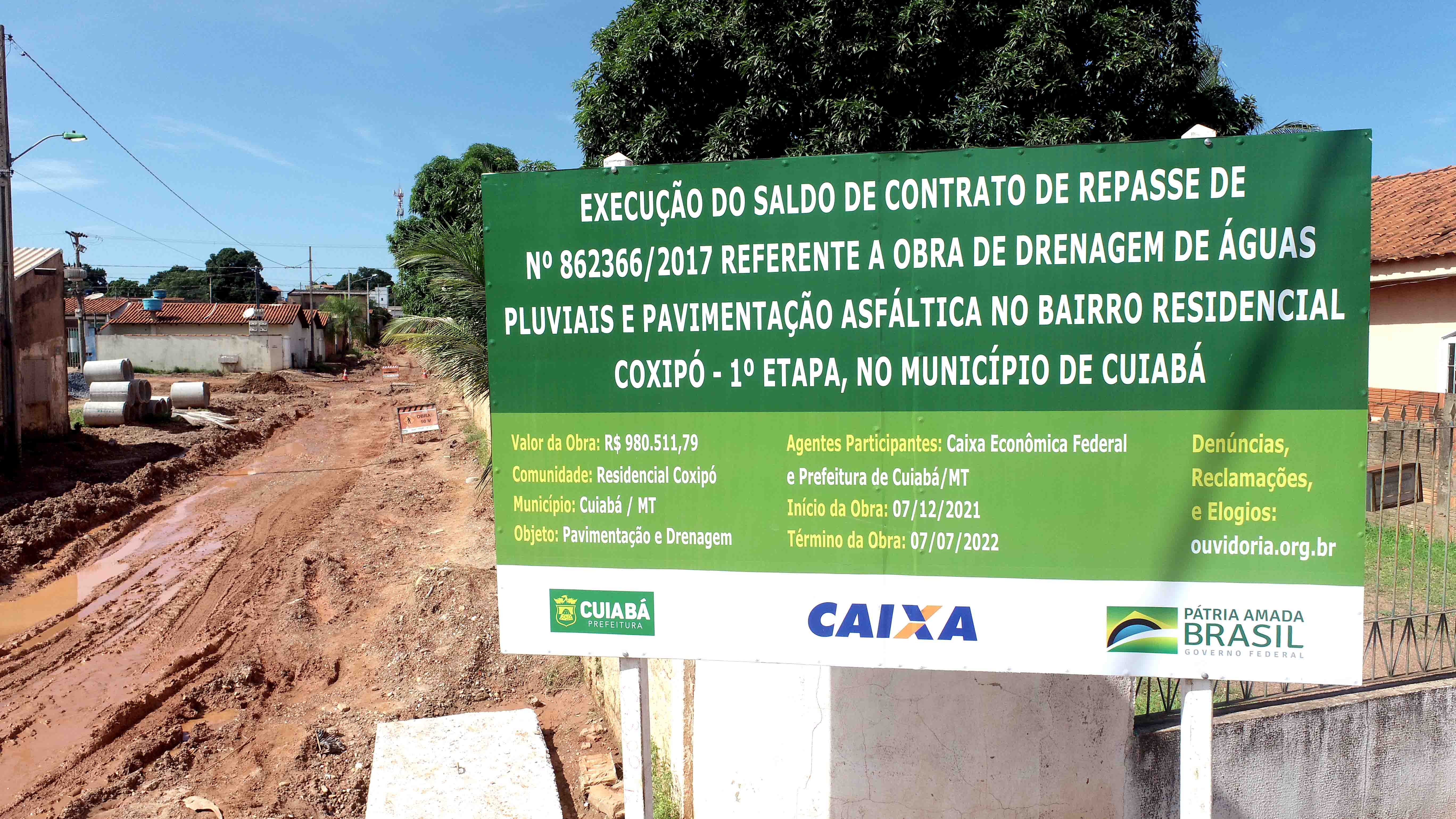 A obra no Residencial Coxipó está dividida em duas fases. Neste momento, o trabalho está concentrado na 1ª etapa, onde R$ 980.511,79 é aplicado para pavimentação da Rua 19, considerada uma das principais do bairro. O recurso é oriundo de um convênio de repasse firmado entre o Município e a Caixa Econômica Federal (CEF).