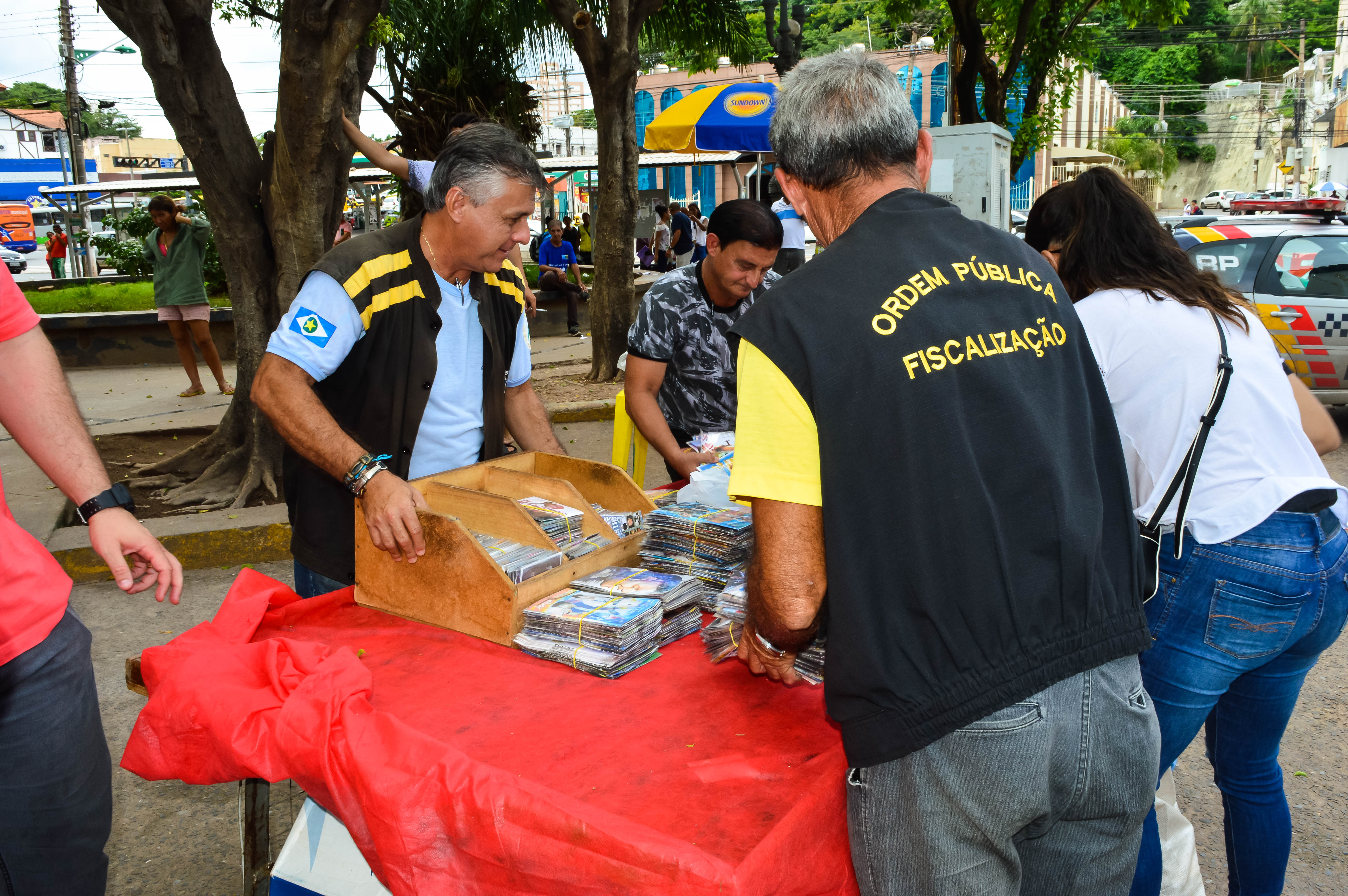 A reincidência do comércio ambulante nas ruas da Capital tem levado a Prefeitura a atuar de forma mais eficaz. Na última quinta-feira (22) os agentes de regulação e fiscalização da Secretaria Municipal de Ordem Pública fizeram uma operação rápida, na Rua 13 de Junho, em conjunto com o Procon Municipal e a Delegacia Especializada do Consumidor e recolheram 5.489 cd’s e Dvd’s piratas.