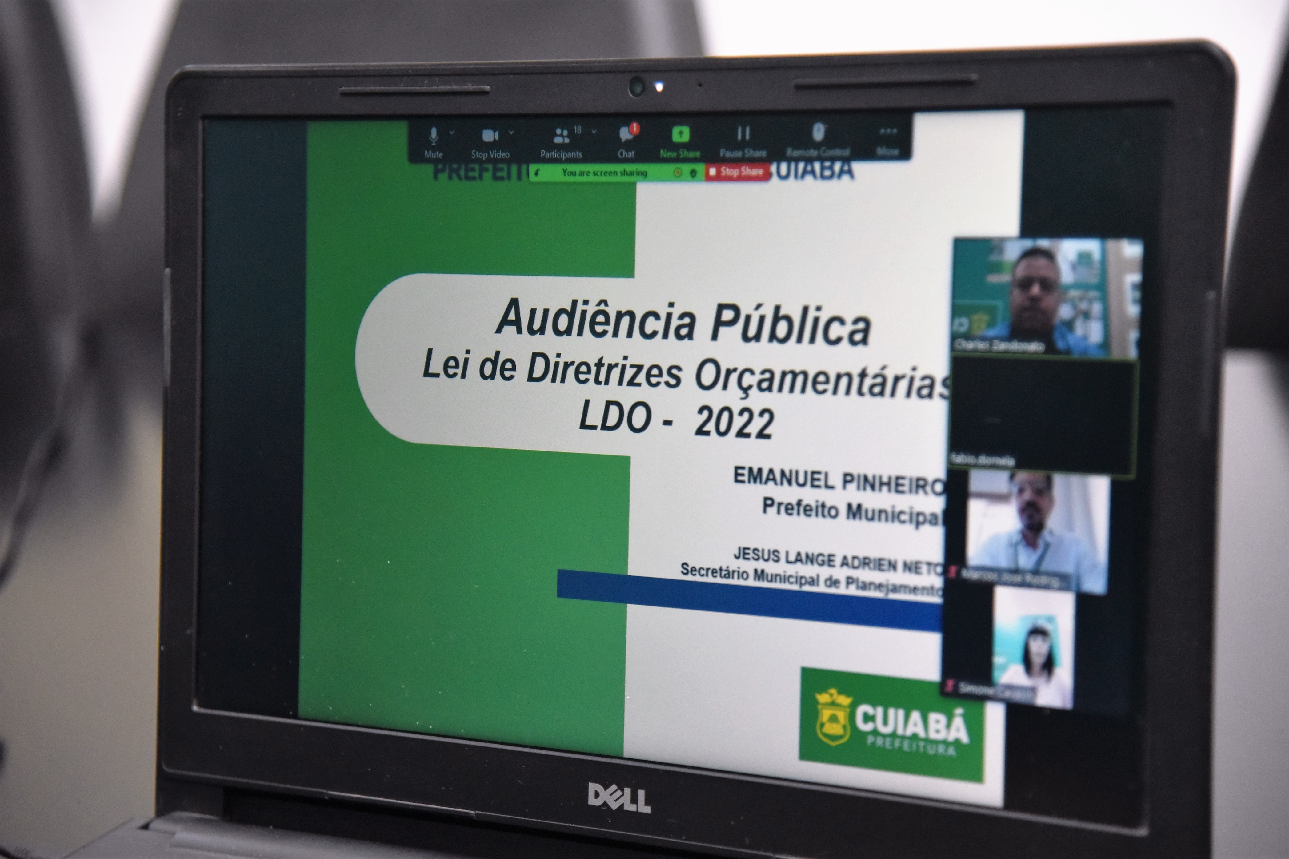 A Prefeitura de Cuiabá por meio da Secretaria Municipal de Planejamento apresentou na tarde desta quinta-feira (08), durante a 1ª Audiência Pública realizada pela Câmara Municipal, as metas e ações previstas para o próximo exercício, contidas no Documento Oficial da Lei de Diretrizes Orçamentárias- LDO 2022. Ao todo, serão três encontros, sempre às quintas-feiras e de forma remota, para evitar a propagação da Covid-19, pelo aplicativo Zoom. A condução dos debates é feita pela Comissão de Fiscalização e Acompanhamento da Execução Orçamentária.