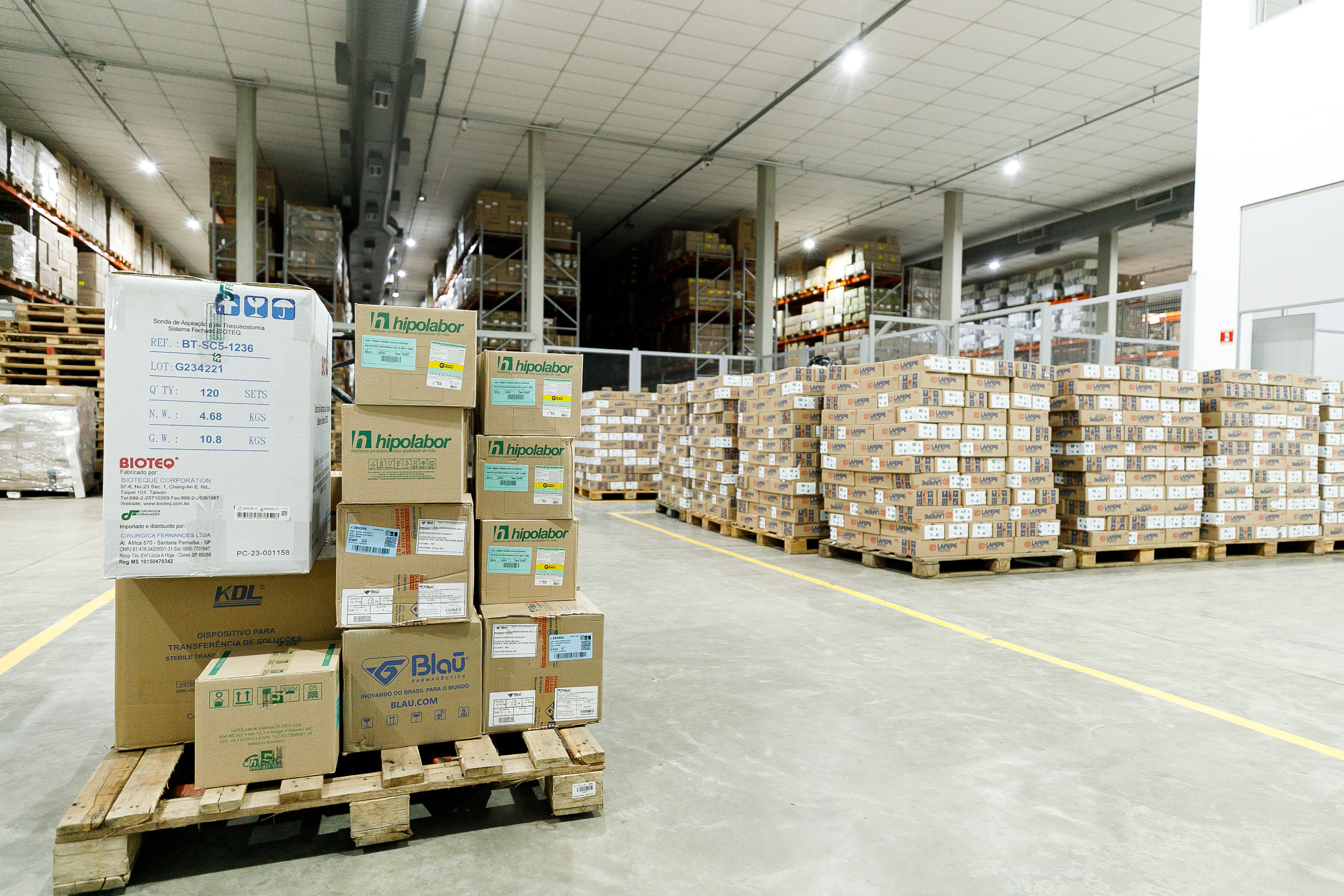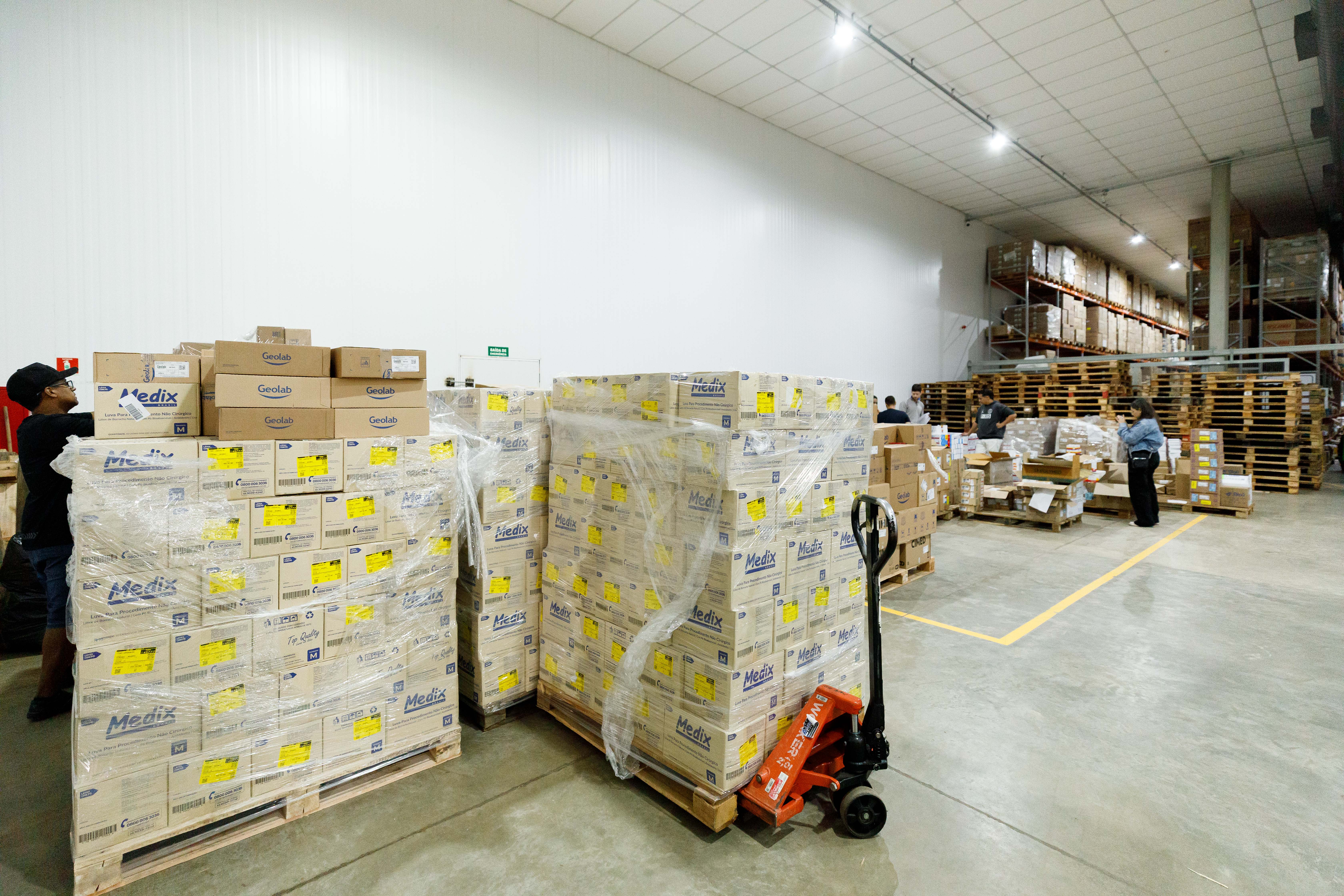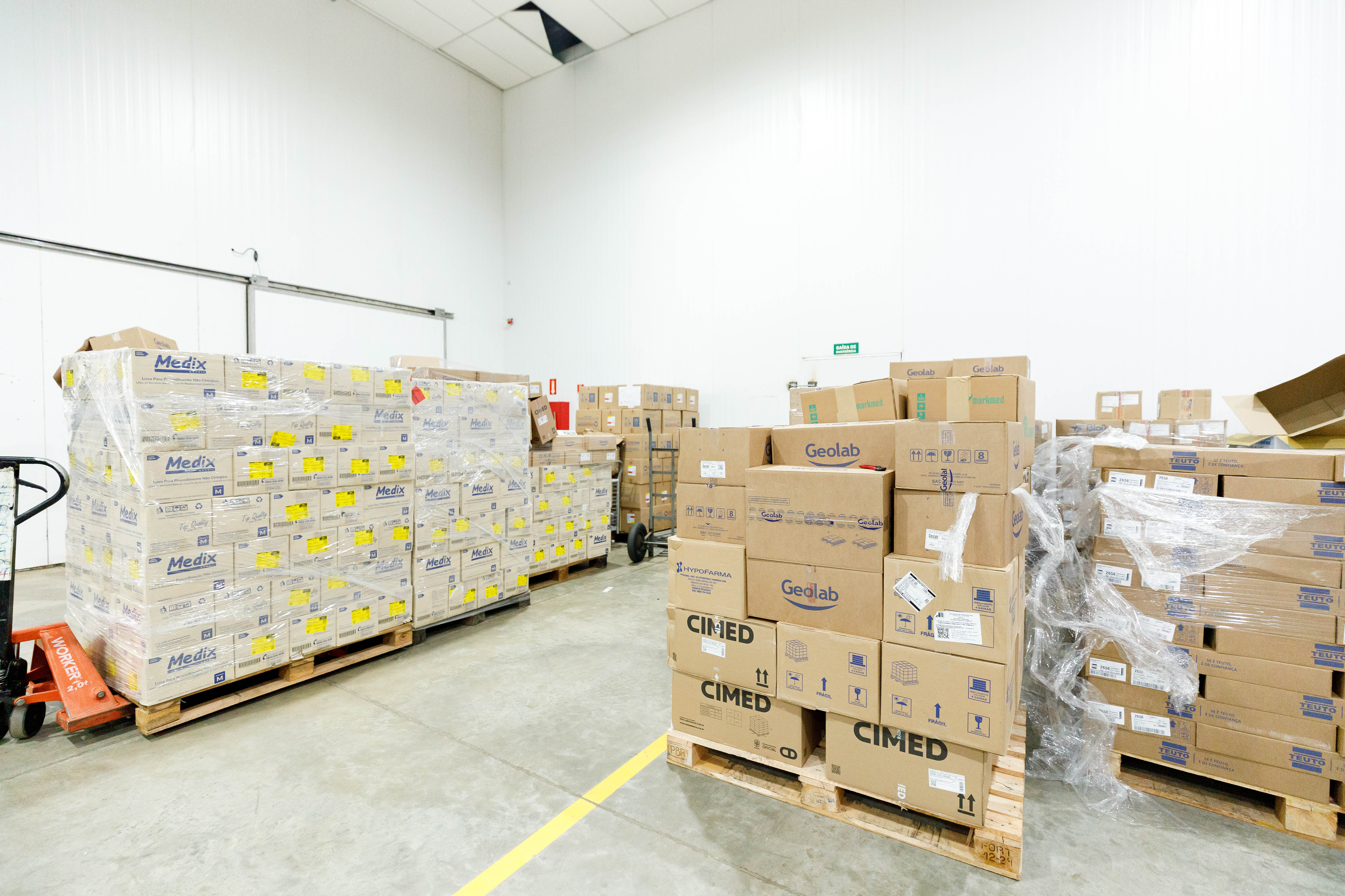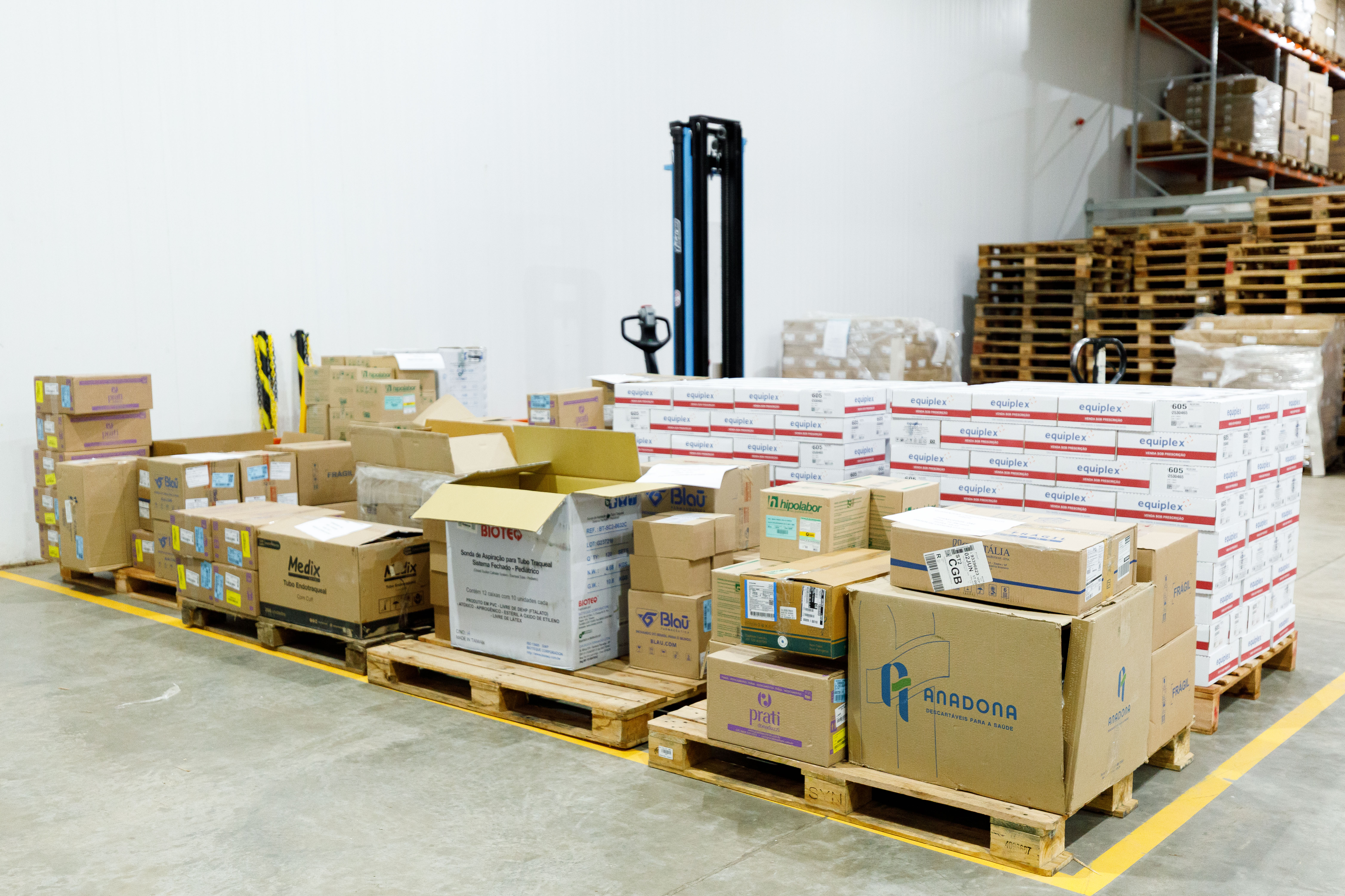 A imagem mostra parte dos medicamentos recebidos no Centro de Distribuição de Medicamentos e Insumos de Cuiabá (CDMIC).