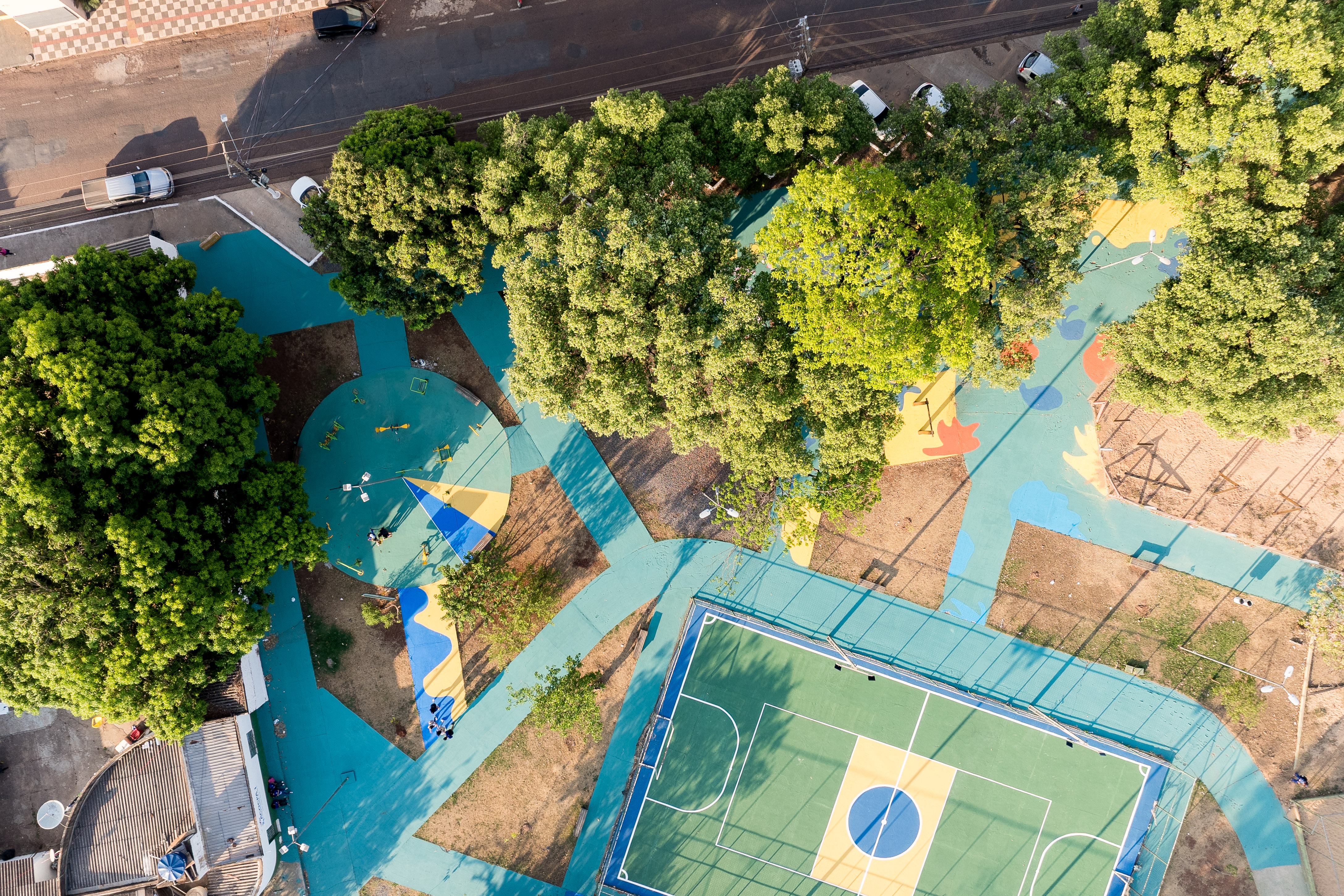 A foto mostra a vista aérea do Complexo do CPA I, onde a primeira-dama e vereadora de Cuiabá, Samantha Iris, promoveu mutirão de pintura e melhorias em quadras poliesportivas.