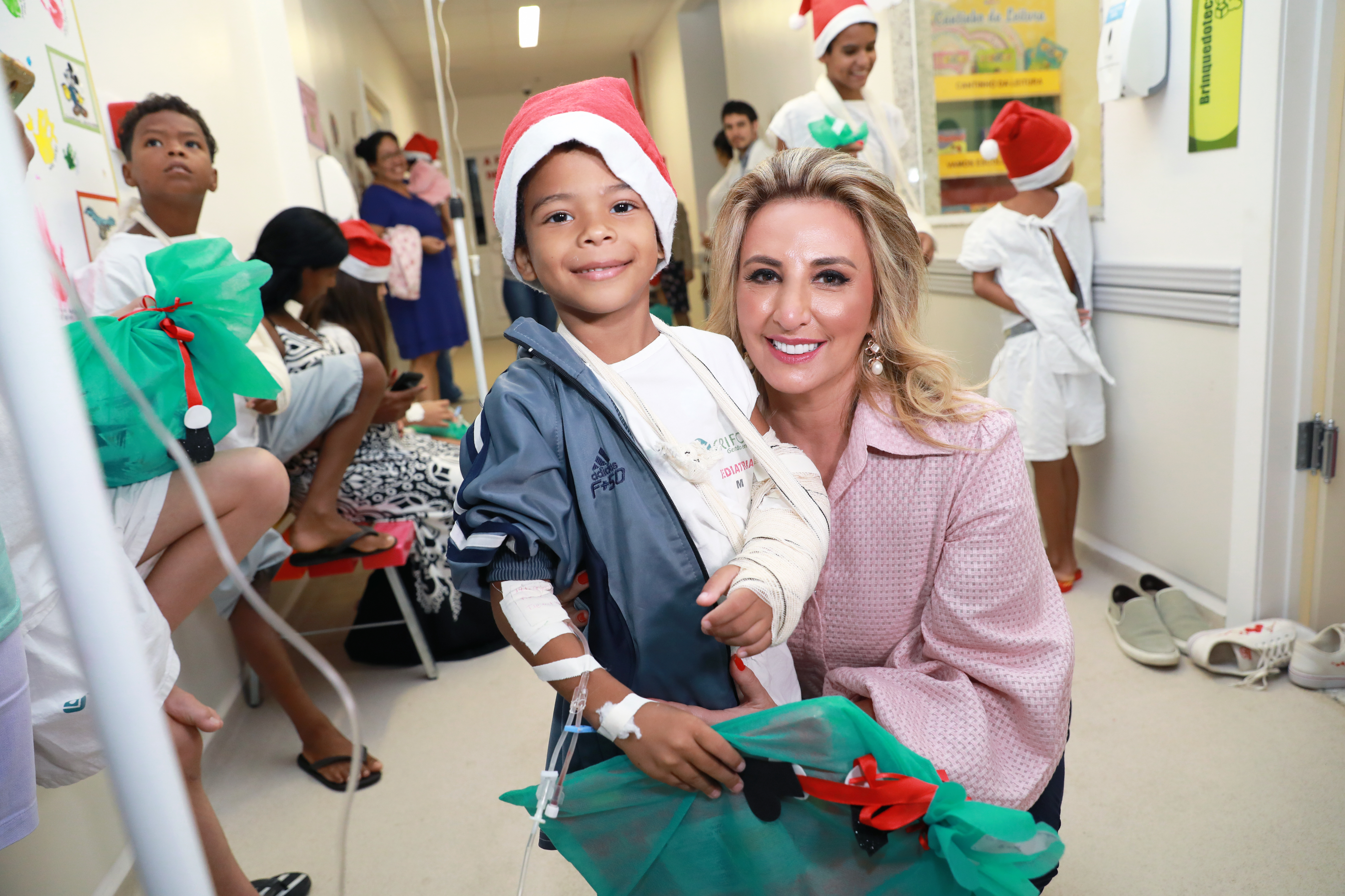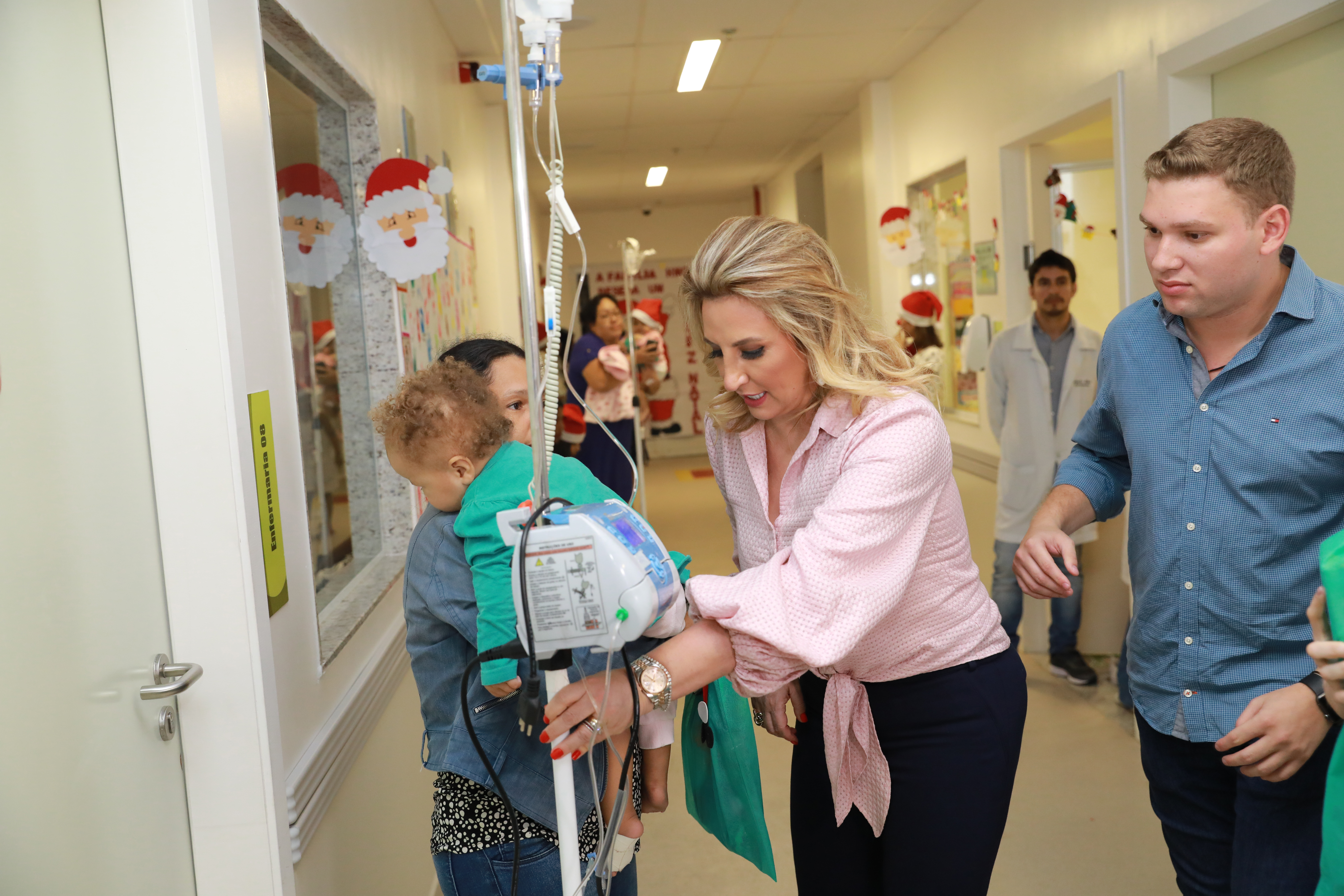 A primeira-dama Márcia Pinheiro realizou, juntamente com os voluntários do Núcleo de Apoio à Primeira-dama e o apoio institucional de profissionais da Secretaria Municipal de Saúde, a entrega de brinquedos de Natal para crianças internadas na ala pediátrica do Hospital Municipal de Cuiabá (HMC).