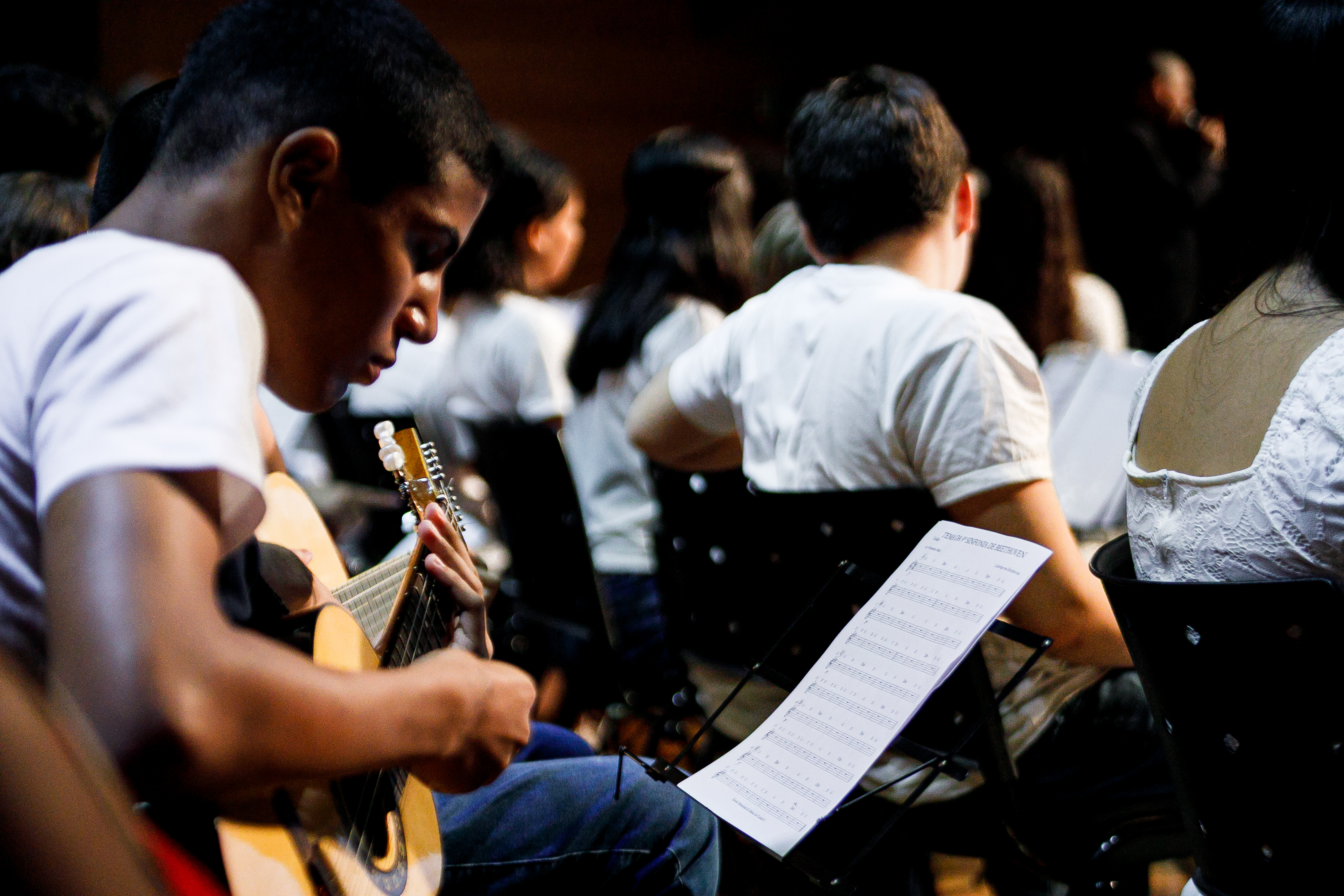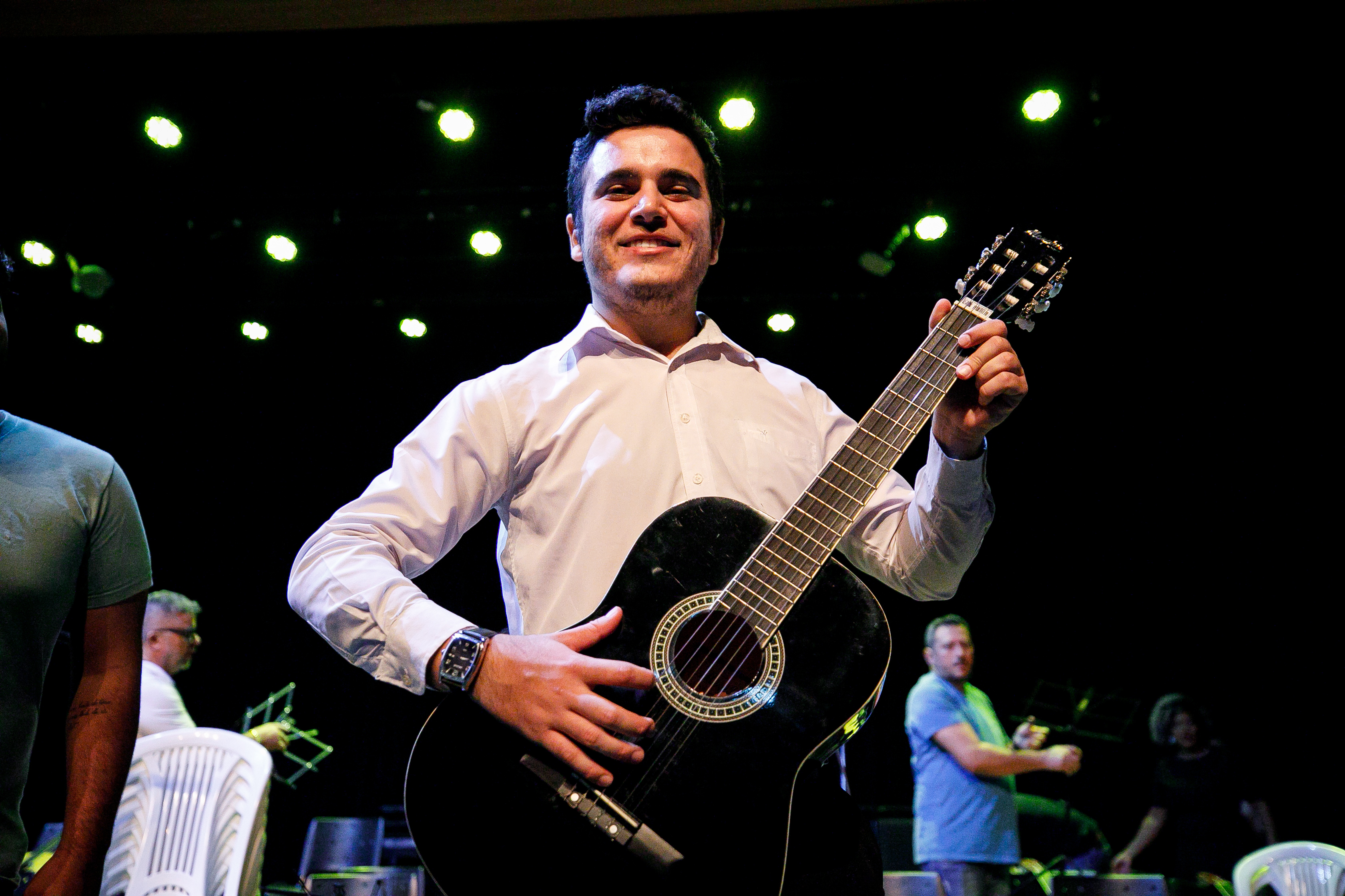 Marcos Gabriel subiu em um palco de teatro pela primeira vez, mas experiência com instrumentos ele tem. Ele toca bateria e flauta, e na Escola de Música aprendeu a tocar violão. “Eu gosto de música, é muito bom. No primeiro tempo a gente fica nervoso, mas depois passa e não tem mais nervosismo. É só se entregar para a música”.