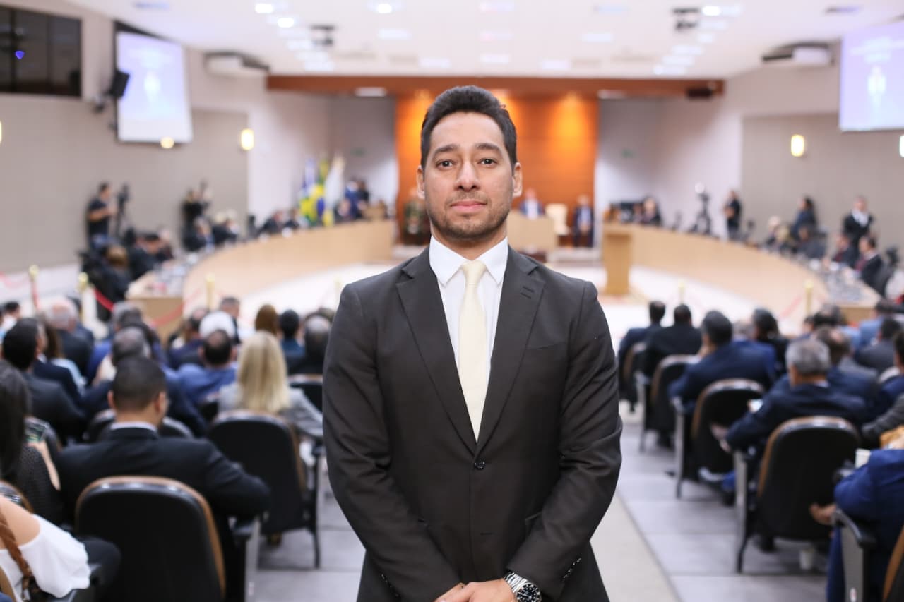 A foto ilustra o Procurador Geral do Município, Luiz Antônio Araújo Júnior, vestido de terno e gravata dourada. No fundo, é possível visualizar o pleno do Tribunal de Justiça no qual desembargadores marcam presença. Do lado esquerdo e direito, estão advogados e autoridades prestigiando uma solenidade de posse.