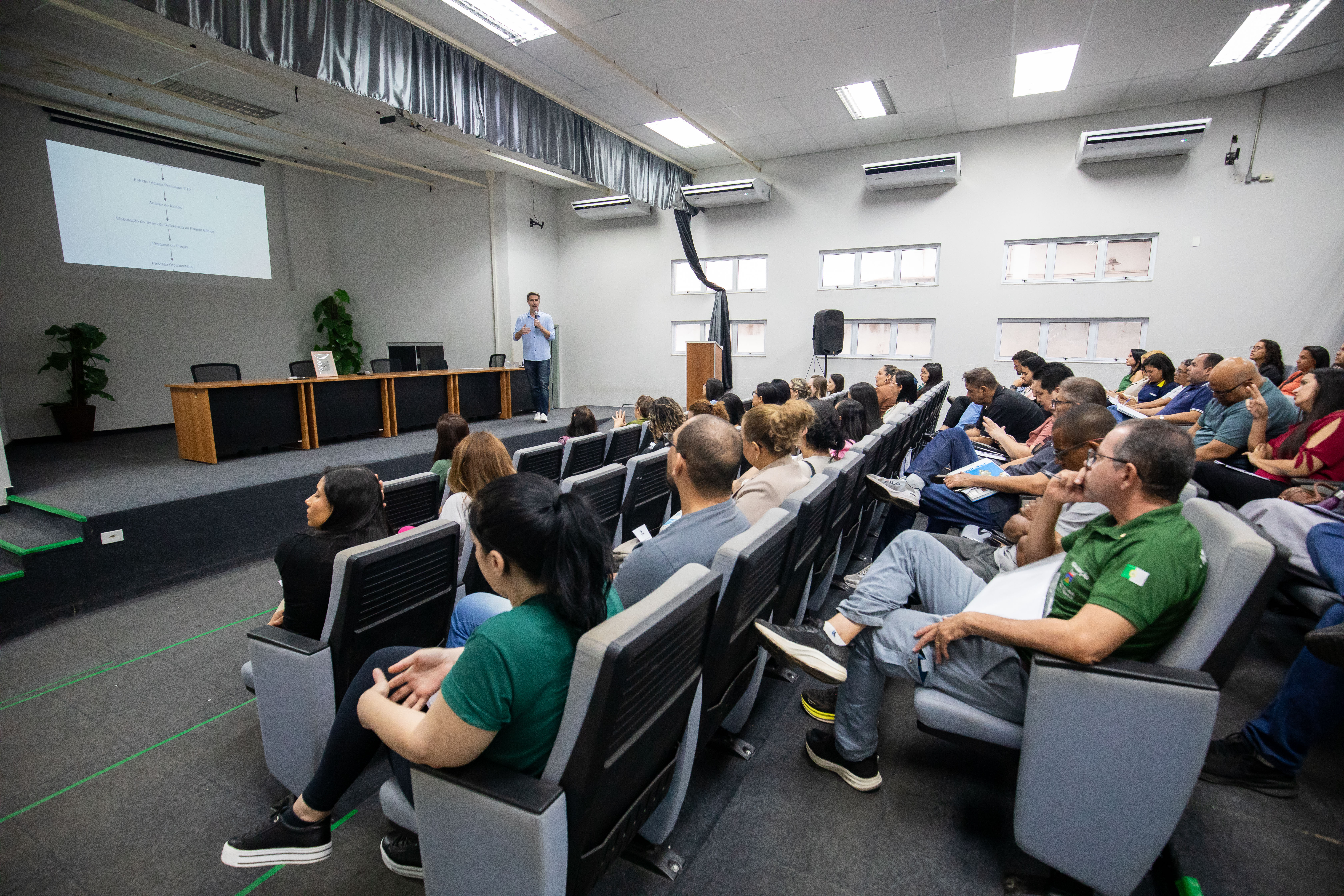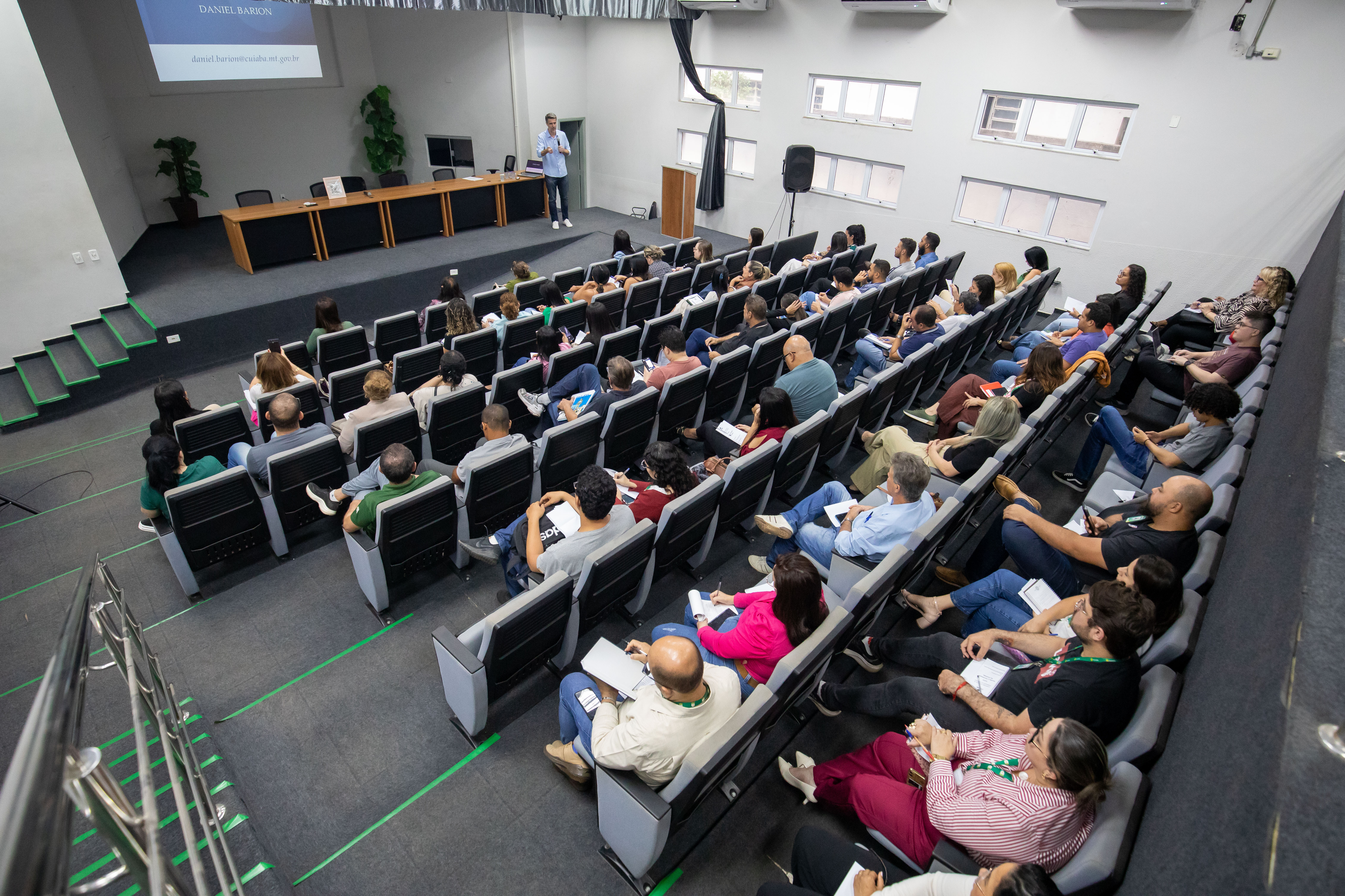 A foto ilustra o procurador do município, Daniel Barion, vestido com traje social e falando ao microfone para uma plateia de servidores. Todos estão sentados em cadeiras almofadas de cor cinza em um espaço que remete a um auditório.