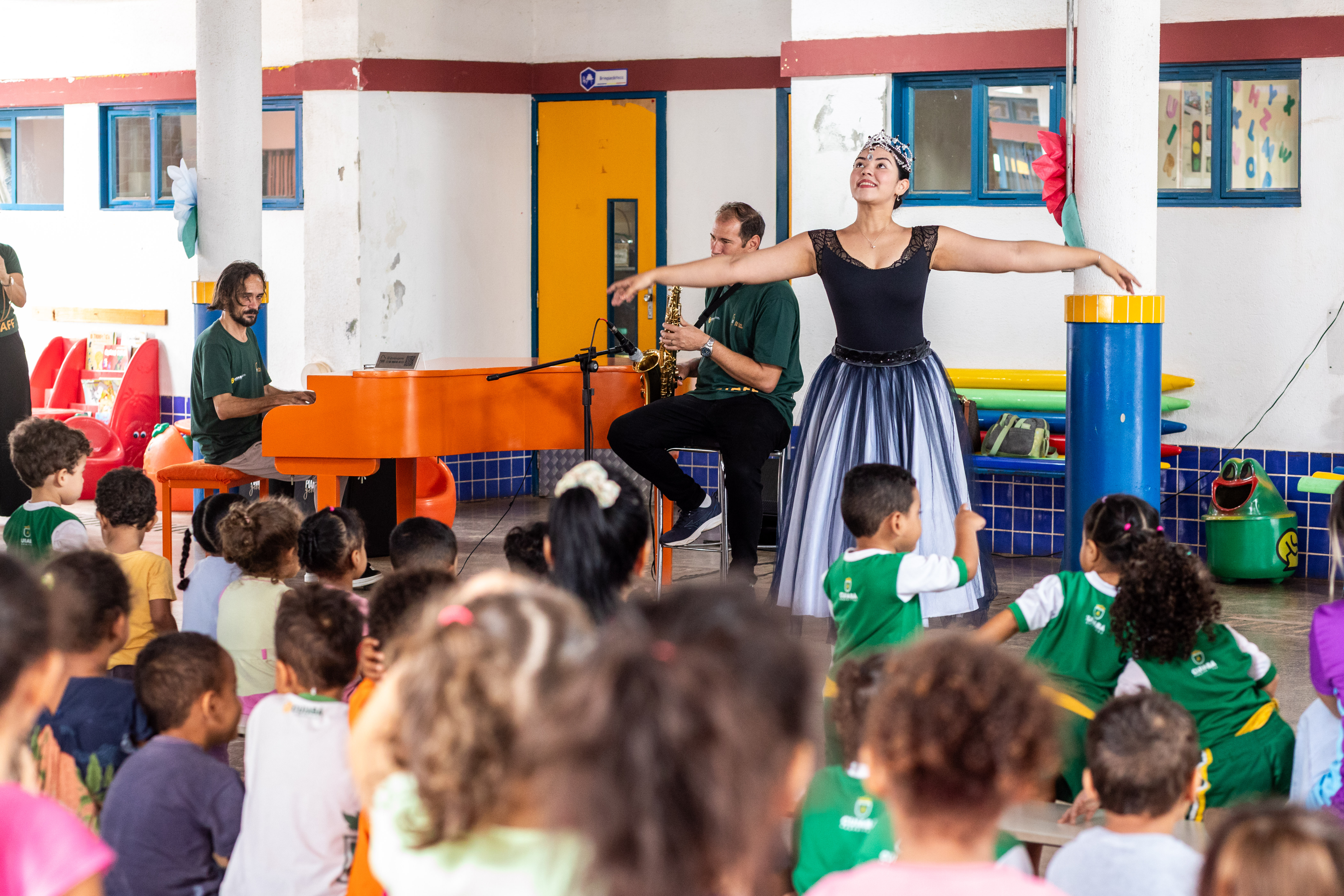 Em determinado momento do espetáculo, os estudantes interagiram com a bailarina, abraçando-a em meio à emoção durante a apresentação. “Fico encantada a cada ida nas escolas. As crianças ficam emocionadas e é um momento muito especial”, comenta a bailarina Julia Fernandes.