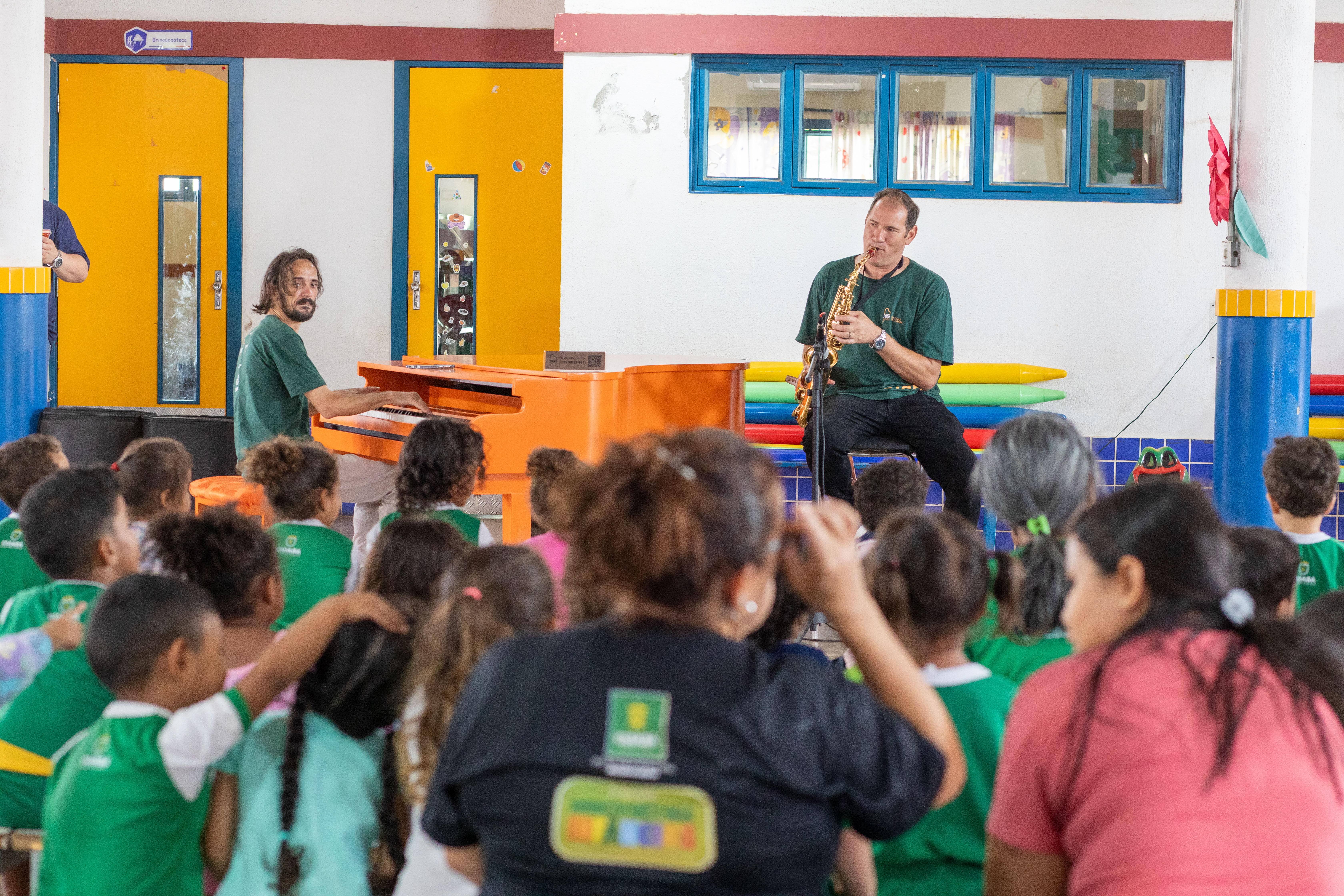 A foto ilustra um piano de cor laranja no pátio de uma escola. Um homem de camisa verde, do lado esquerdo, toca saxofone. À frente, está uma bailarina de blusa preta. Diversas crianças estão sentadas e em pé prestando atenção na apresentação.