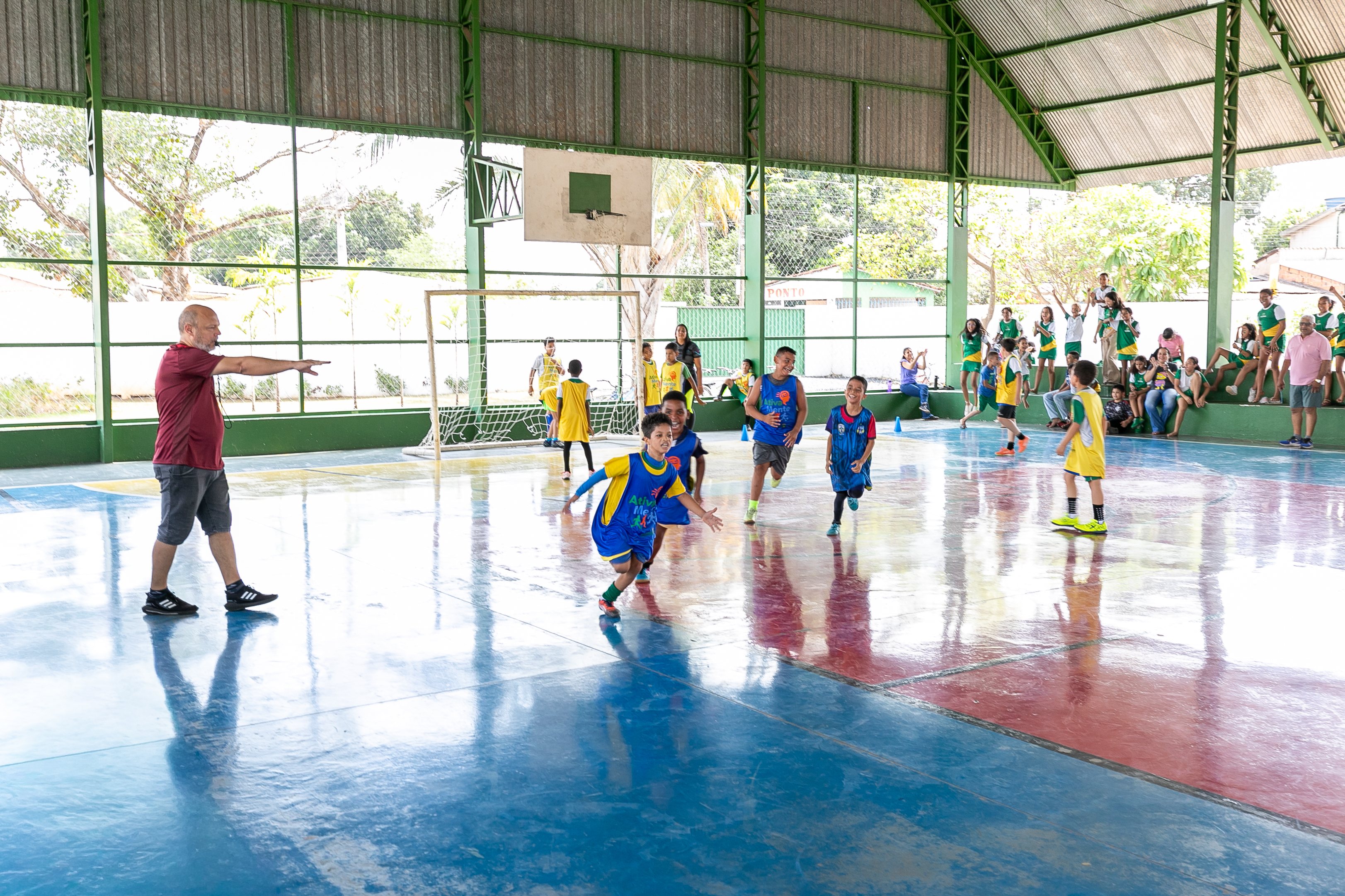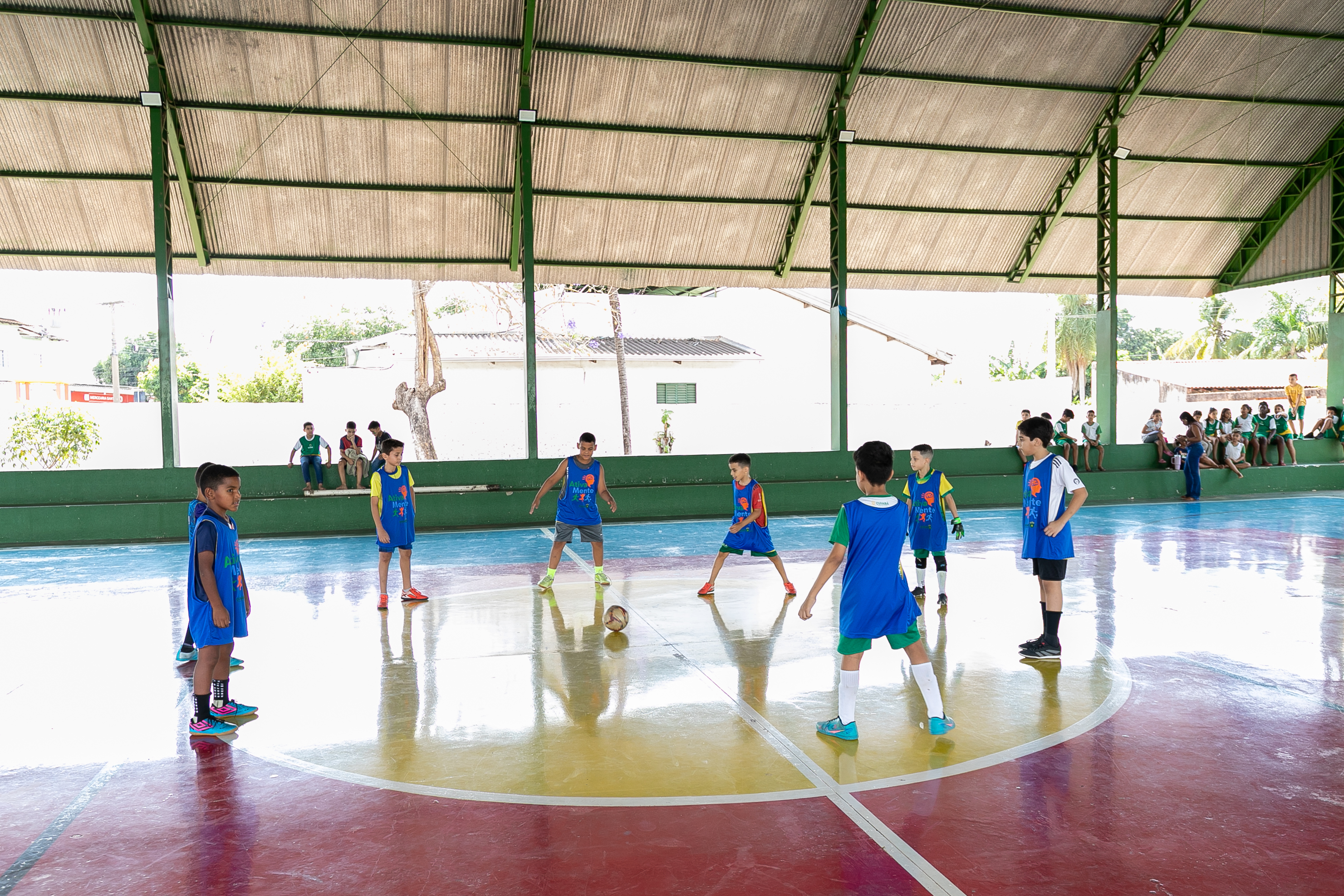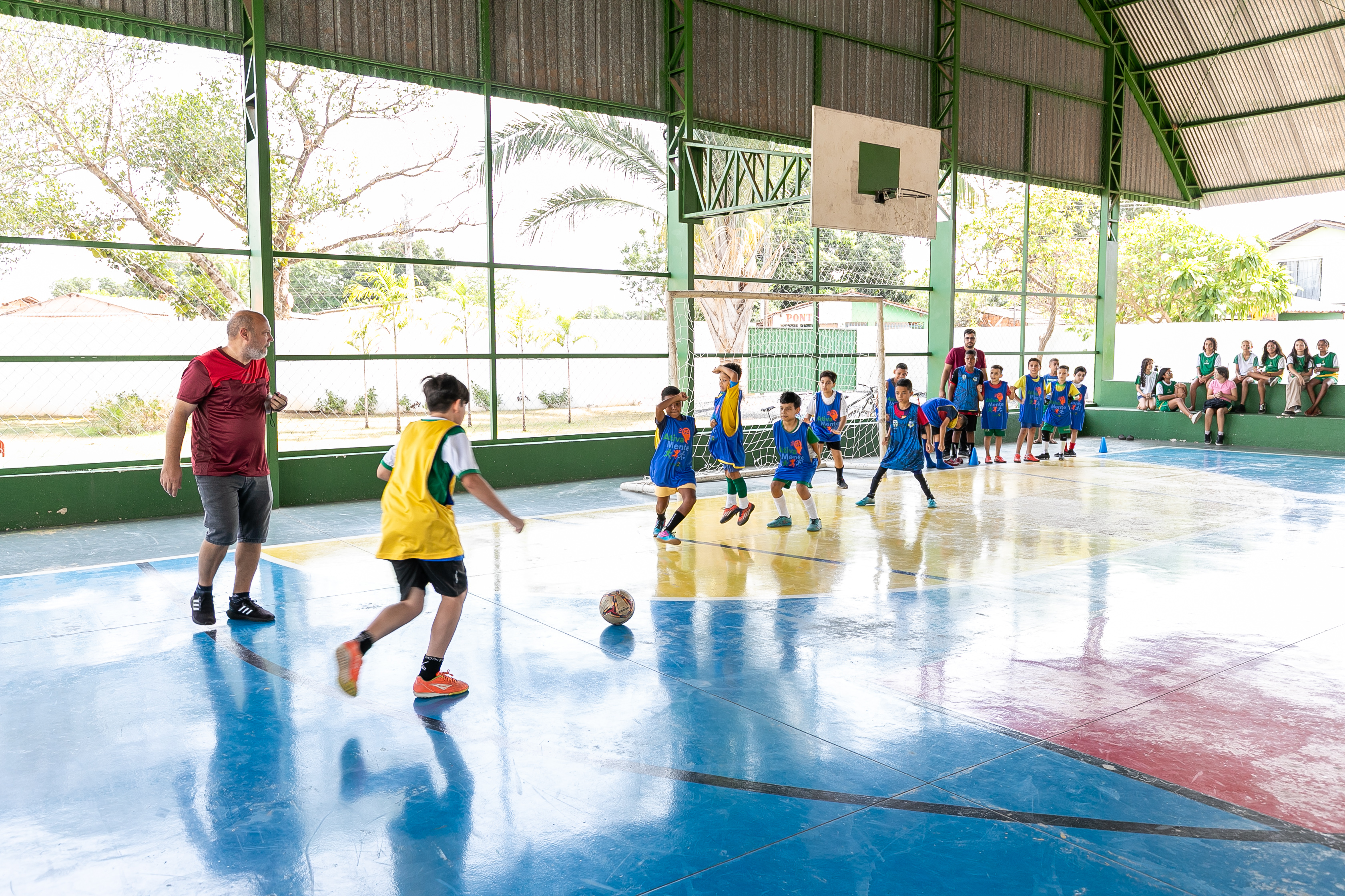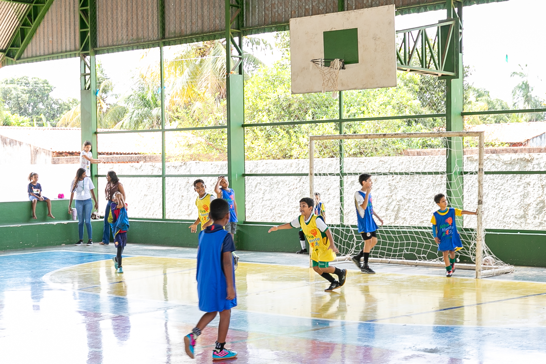 A foto mostra crianças em uma quadra esportiva disputando futsal. Um time veste uniforme azul e o outro uniforme amarelo. O piso da quadra, de cor amarela, também se destaca.