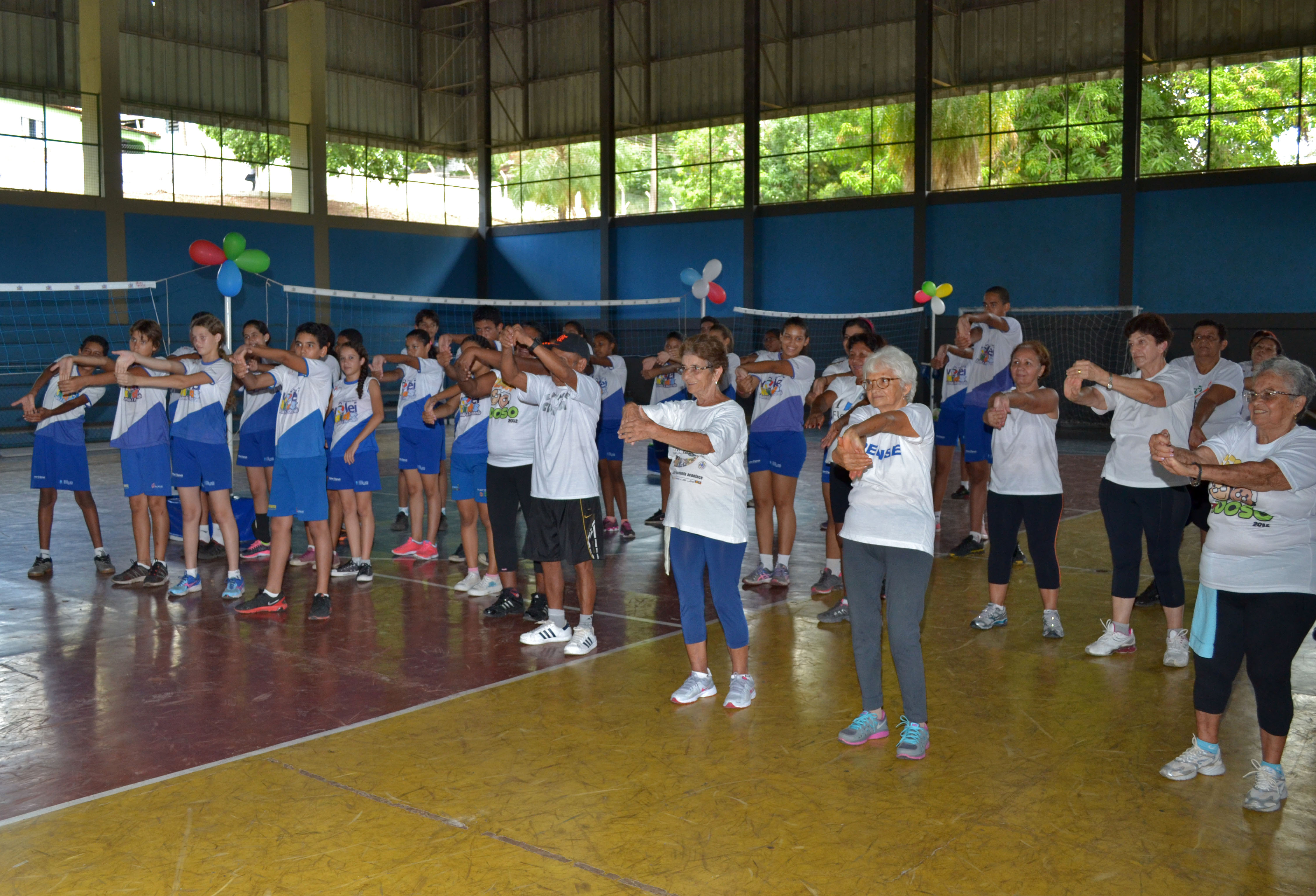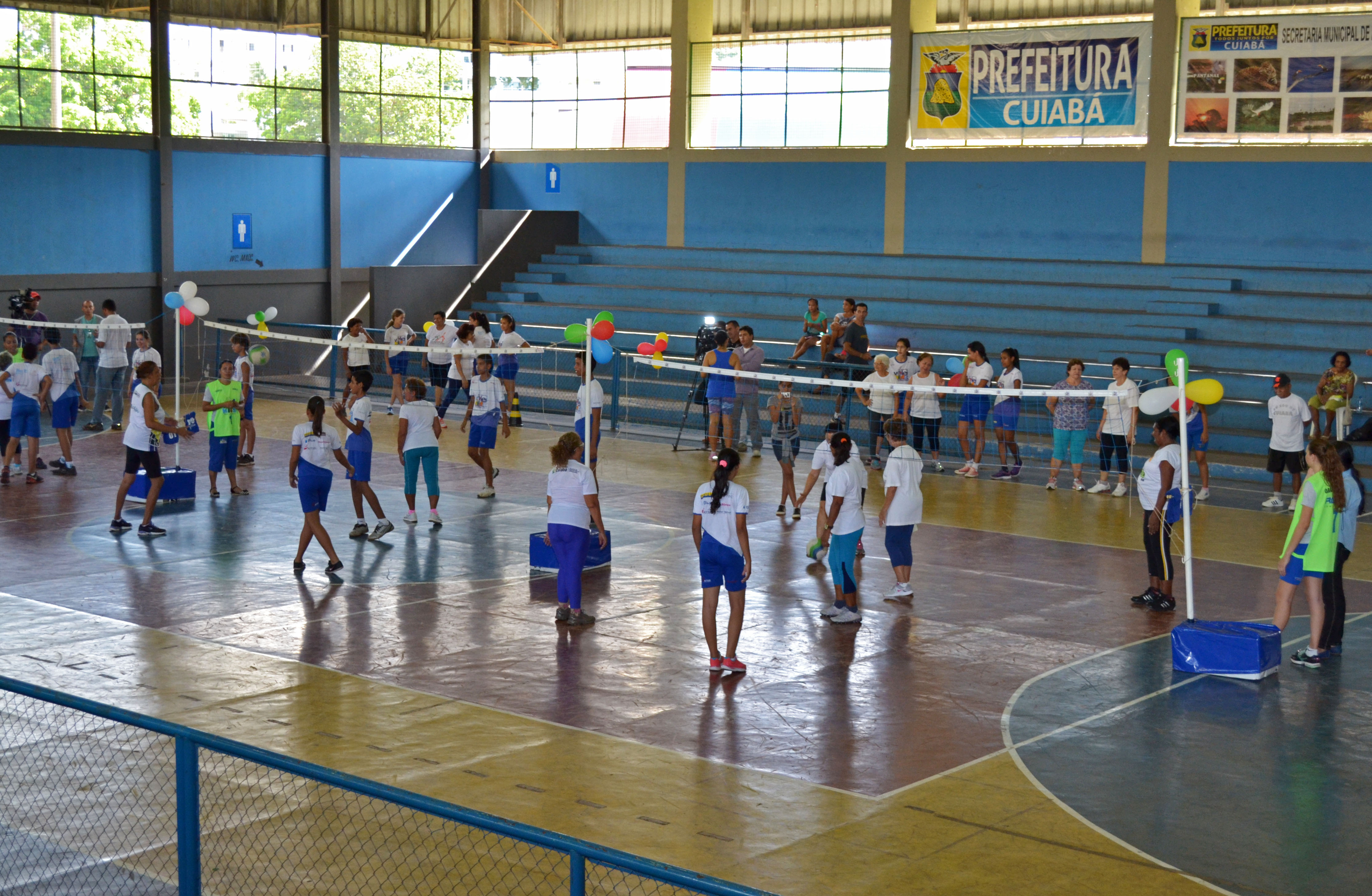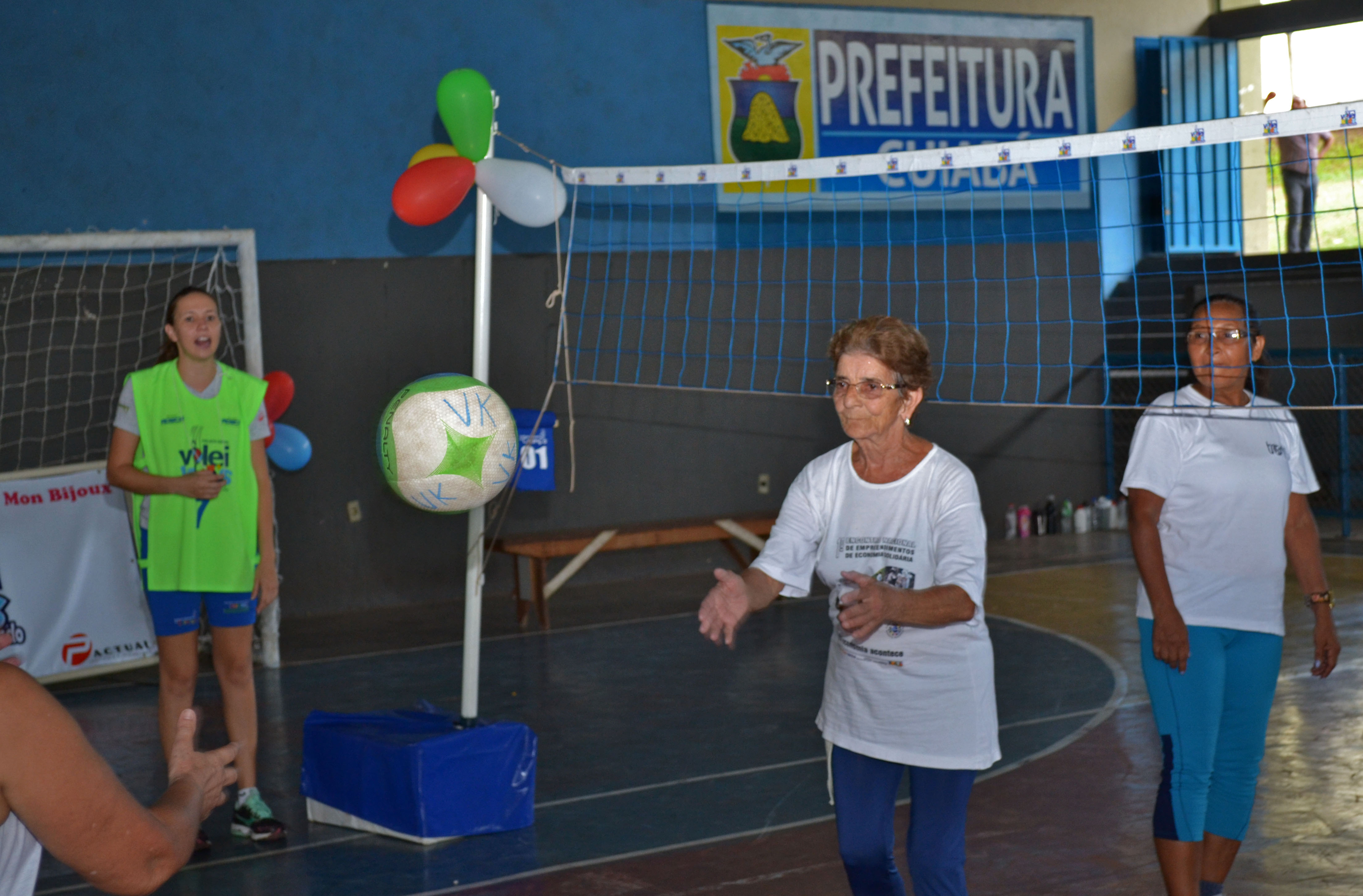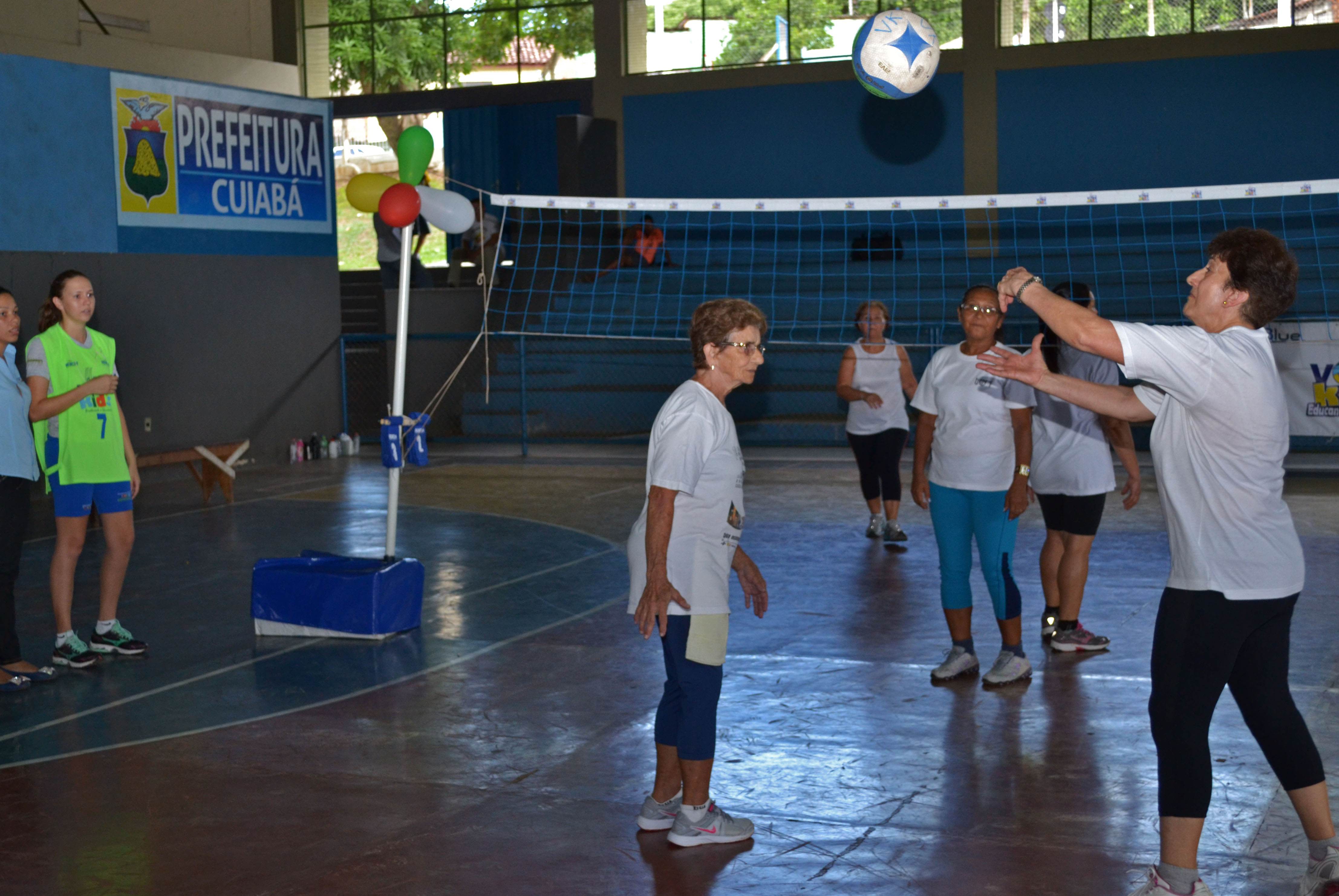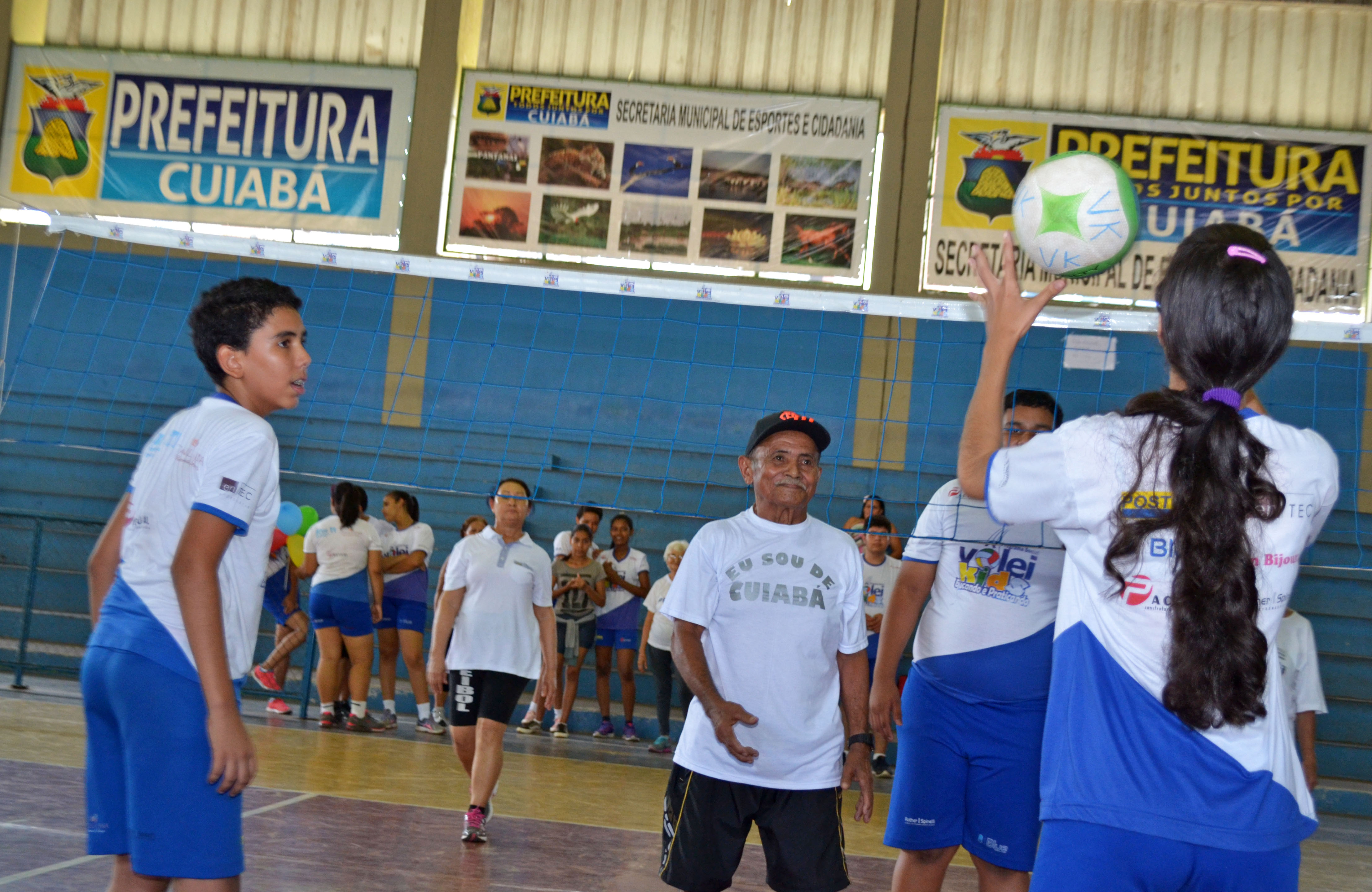 Crianças e idosos que participam de projetos mantidos pela Prefeitura de Cuiabá se reuniram nesta quarta-feira (05) para praticar vôlei. A iniciativa faz parte do Projeto “Vôlei entre gerações - superando preconceitos”, realizado no Ginásio Quilombo.
