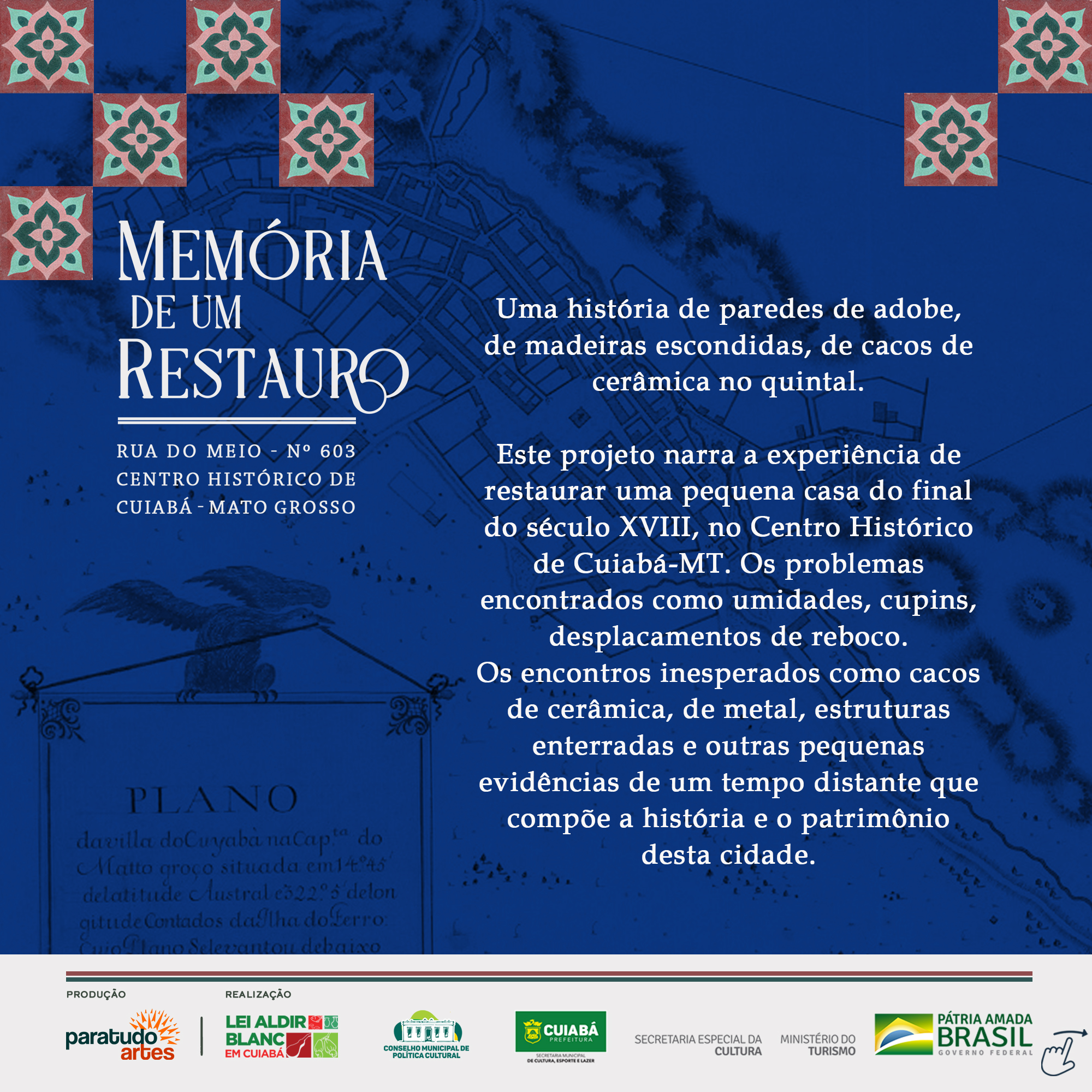 Uma sala, um quarto, uma cozinha, um banheiro e um ateliê. Que histórias esses espaços podem nos contar? Memórias tem endereço: Casa 603, Rua do Meio, Centro Histórico de Cuiabá. Nesta sexta-feira (16), a partir das 16h, será o momento de ouvi-las. O projeto “Memórias de um Restauro” apresenta o processo de recuperação desse espaço que sobreviveu ao tempo, como forma de contribuir para a educação patrimonial e preservação do patrimônio histórico cultural na capital de Mato Grosso. Em razão do cumprimento das medidas sanitárias durante a pandemia da COVID-19, o encontro será virtual, por meio do perfil do projeto no youtube e facebook. A ação foi aprovada em edital da Lei Federal Aldir Blanc em Cuiabá, executada pela Secretaria de Cultura, Esporte e Lazer, com apoio do Conselho Municipal de Política Cultural.