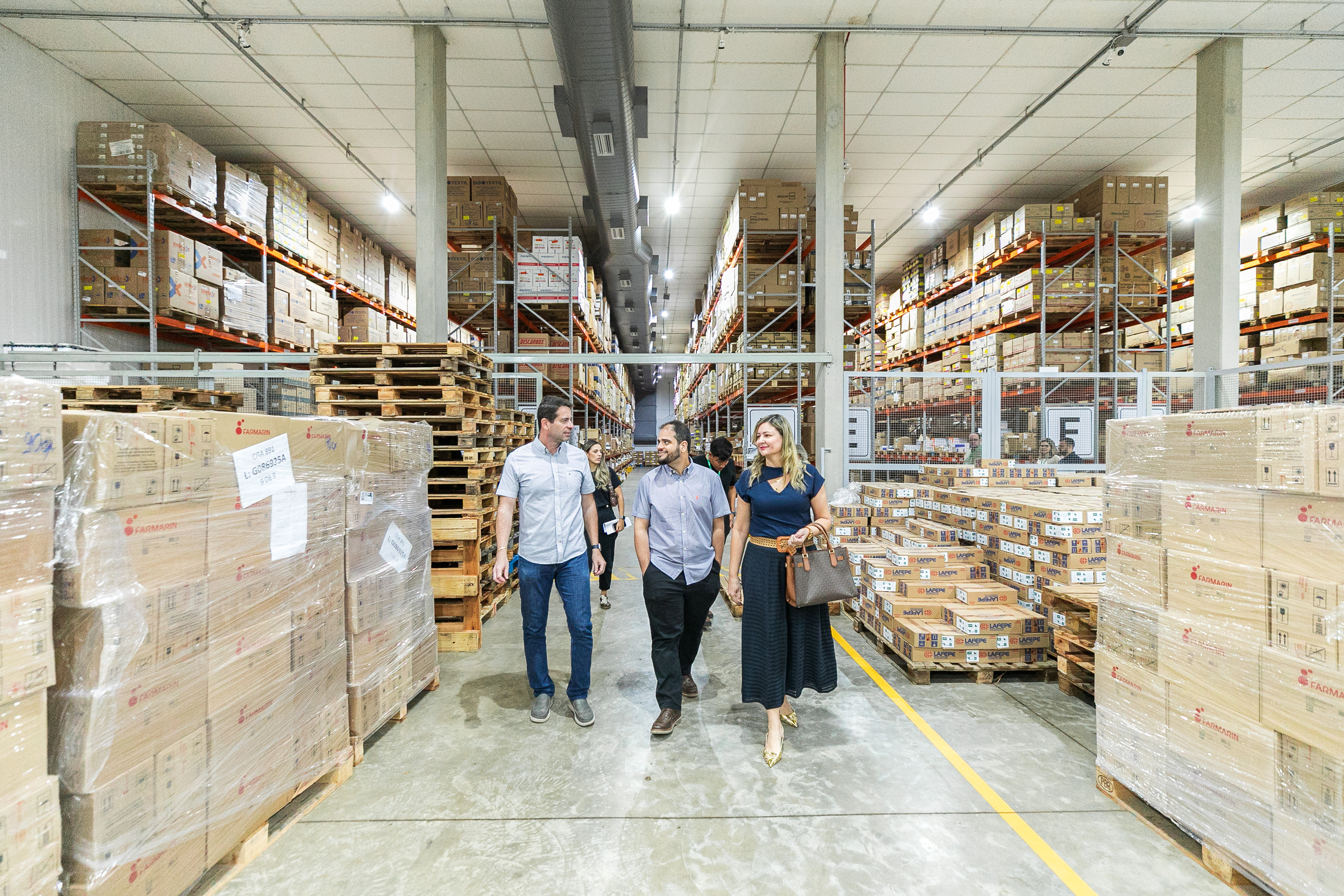 A imagem principal mostra o promotor, a secretária e outro servidor caminhando entre as galerias de medicamentos do CDMIC. Ao lado e ao fundo, inúmeras caixas organizadas com remédios armazenados.