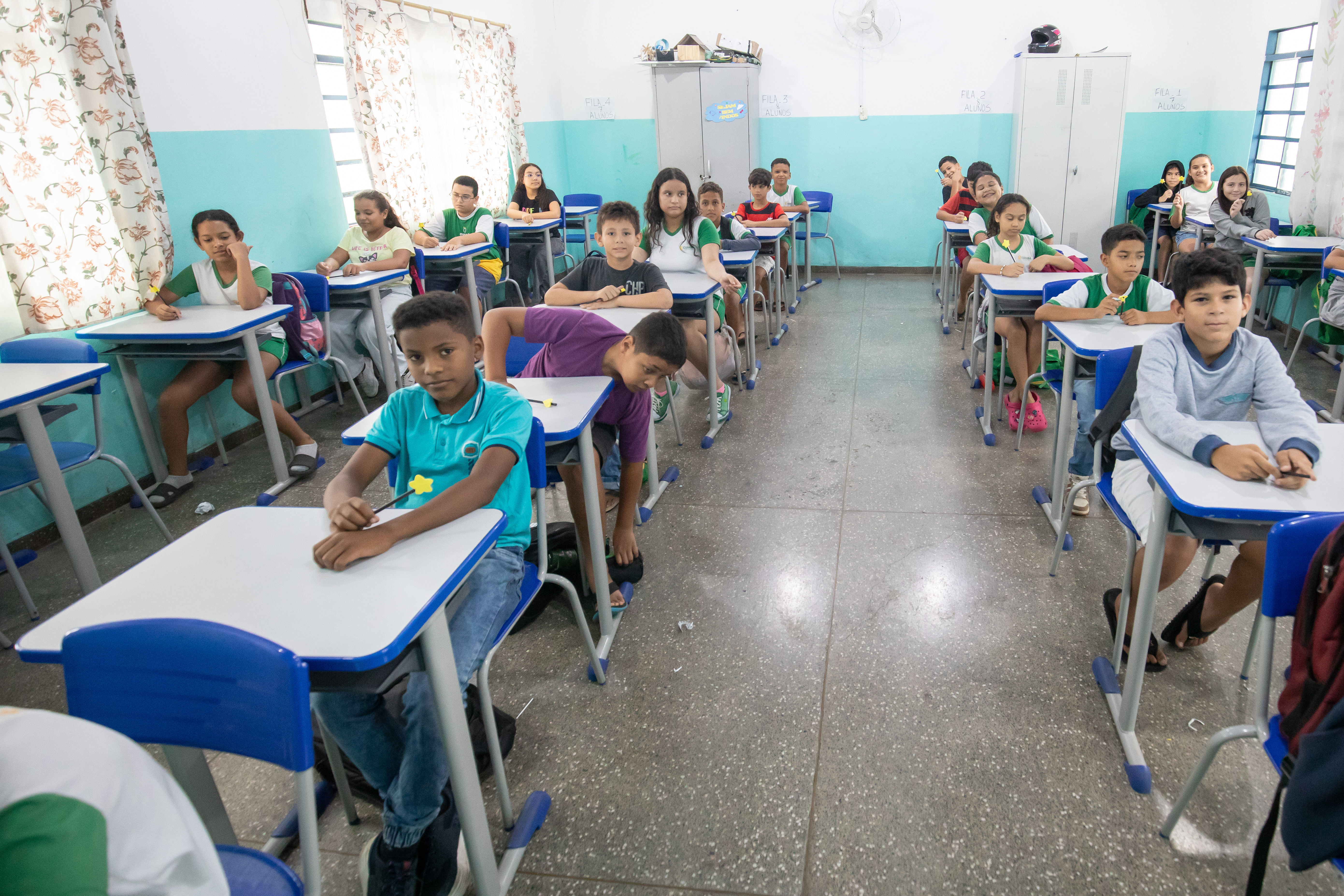 A foto ilustra estudantes da rede pública dentro de uma sala de aula. Todos estão sentados em cadeiras e apoiados em mesas de cor branca com detalhes azuis.