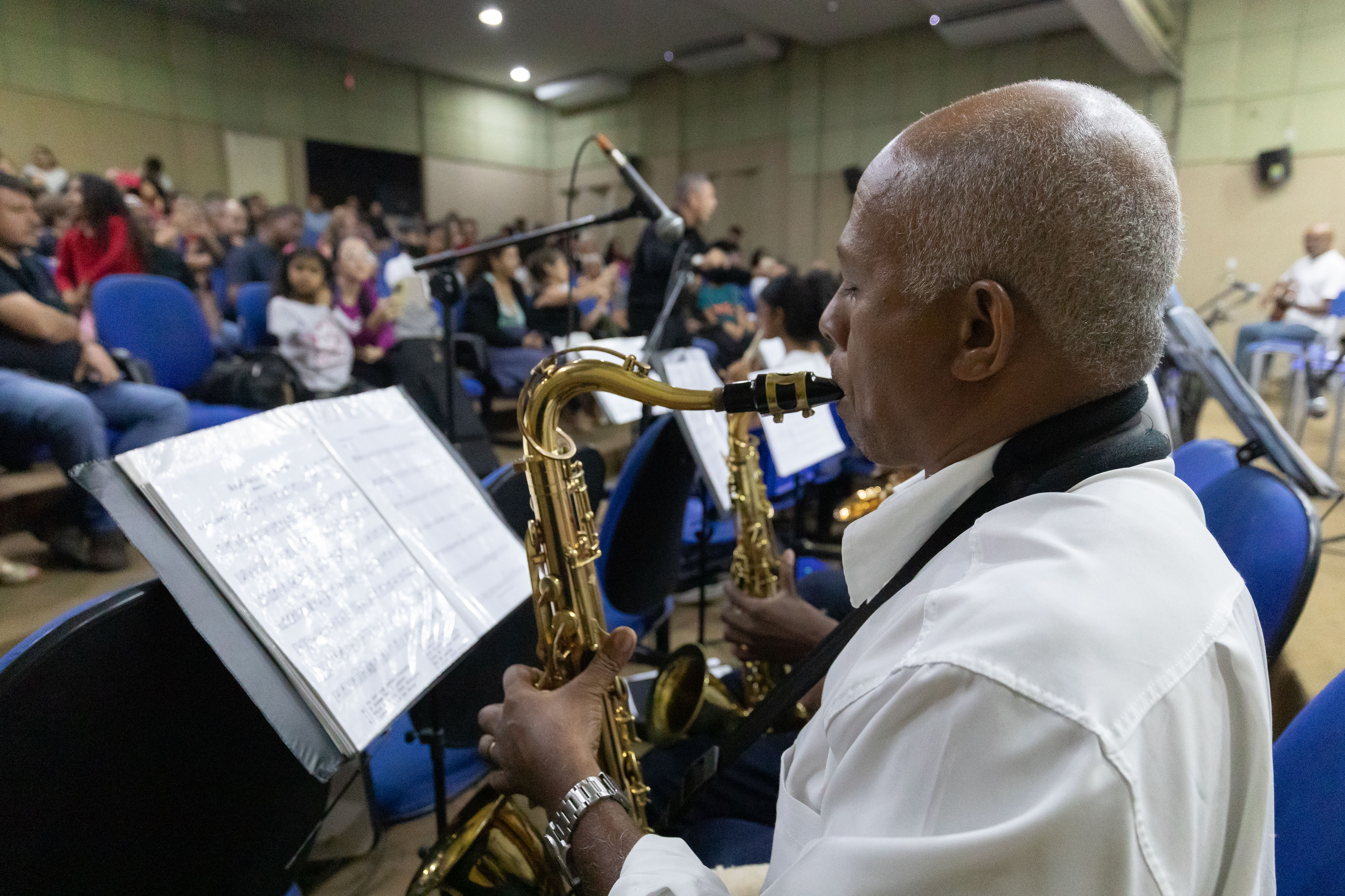 O servidor público da rede municipal, Odovaldo Forte Daltro Júnior, depois de 20 anos com o saxofone guardado, voltou a tocar a convite do professor Fernando Reis, depois de acompanhar as apresentações de seus dois filhos, José Augusto, 13 anos, e João Lucas, de 11 anos, que tocam flauta. “Acabei aceitando o convite e comecei a tocar saxofone há cerca de um mês. Achei que estaria super enferrujado para tocar, mas com a ajuda do professor me dei bem. Hoje estou realizando um sonho, porque eu tinha 10, 12, 15 anos, e parei por 20 anos, construí família, filhos, instrumento guardado, e com o sonho de um dia tocar junto com meus filhos. E deu certo, vamos estar tocando juntos. É uma emoção fantástica, que transborda”.