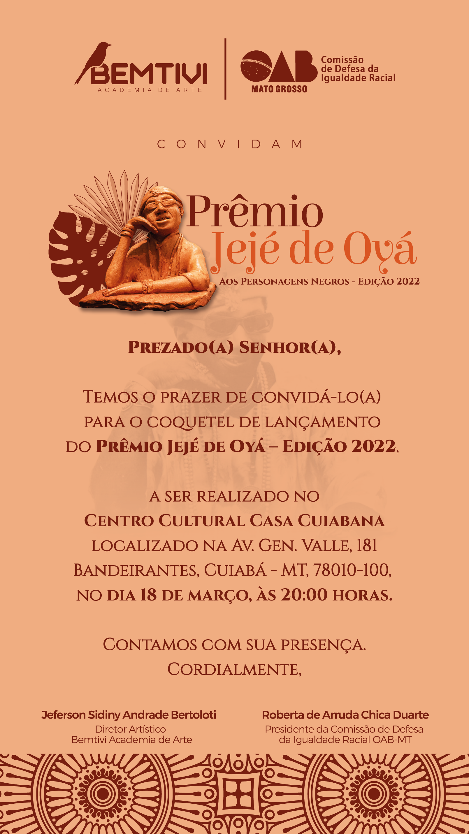 A Prefeitura de Cuiabá, por meio da Secretaria de Cultura, Esporte e Lazer, convida a todos para o lançamento do Prêmio Jejé de Oyá – Aos Personagens Negros – edição 2022. A cerimônia será realizada nesta sexta-feira (18), a partir das 20h, no Centro Cultural Casa Cuiabana.
