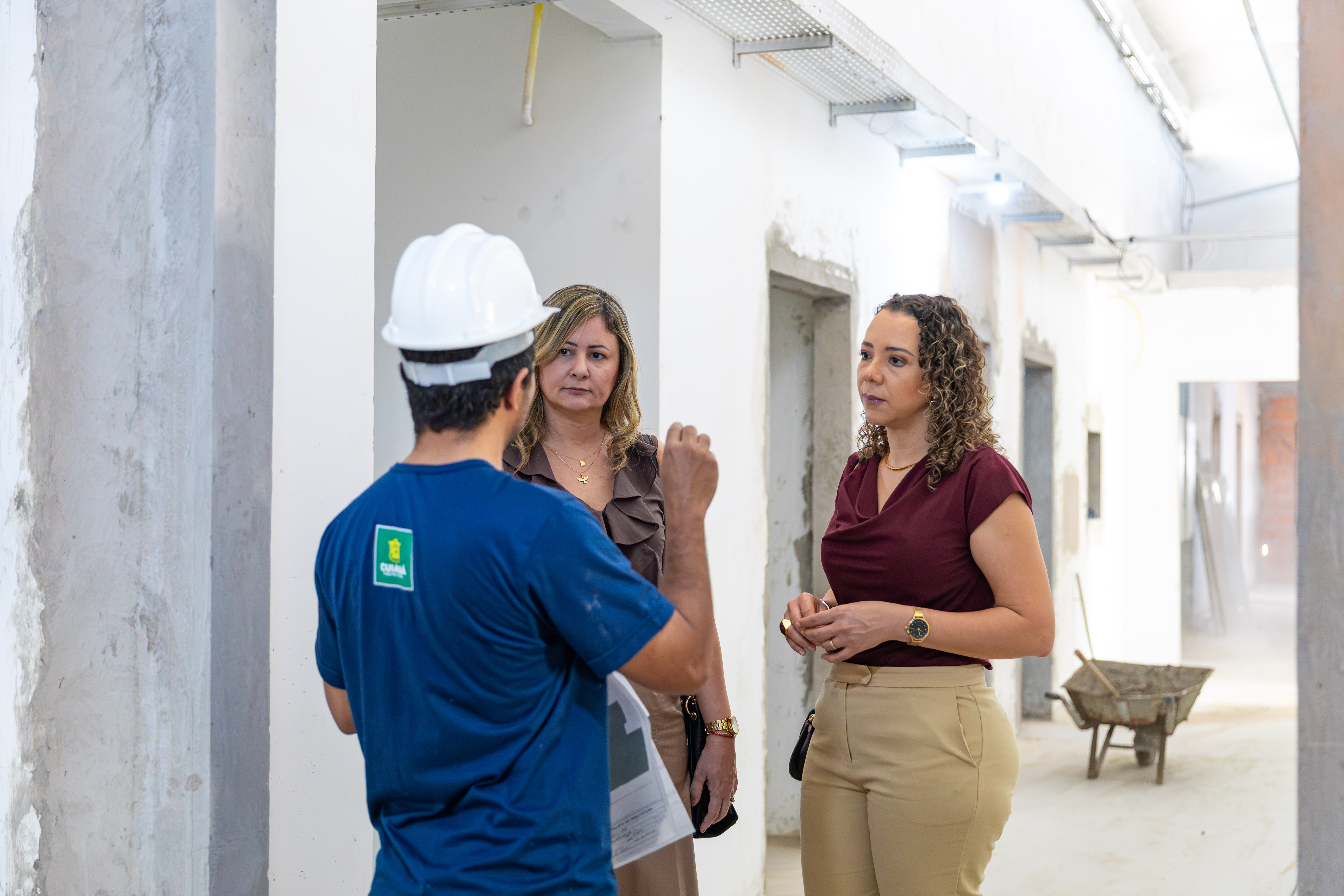 Na imagem, aparece a secretária de Saúde de Cuiabá ao lado de outros dois servidores. Eles estão em meio a um canteiro de obras e observam o local.