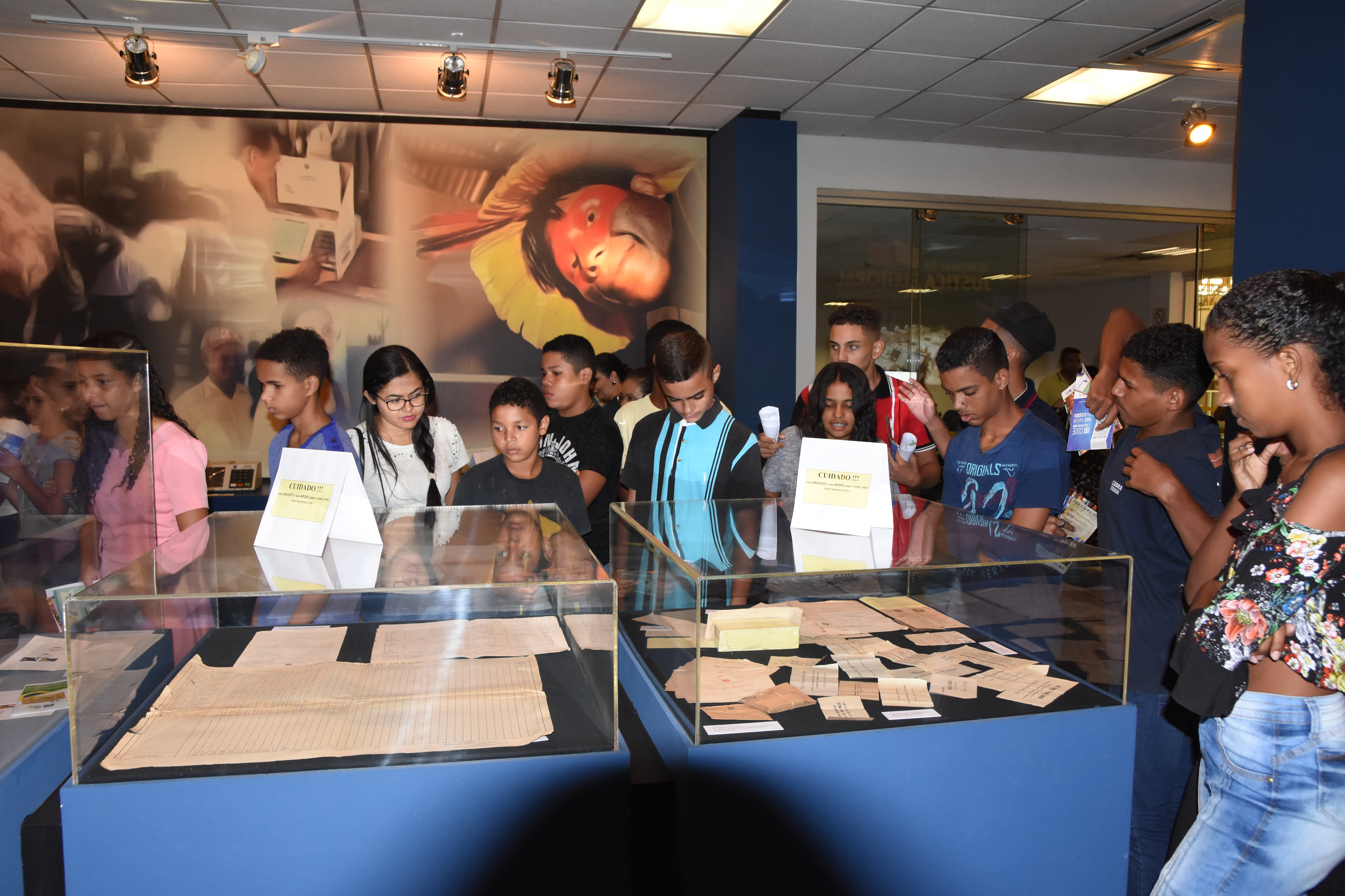 O grupo de alunos após a eleição simulada visitou o Museu existente dentro do TRE que conta um pouco da história da evolução das eleições em Mato Grosso.
