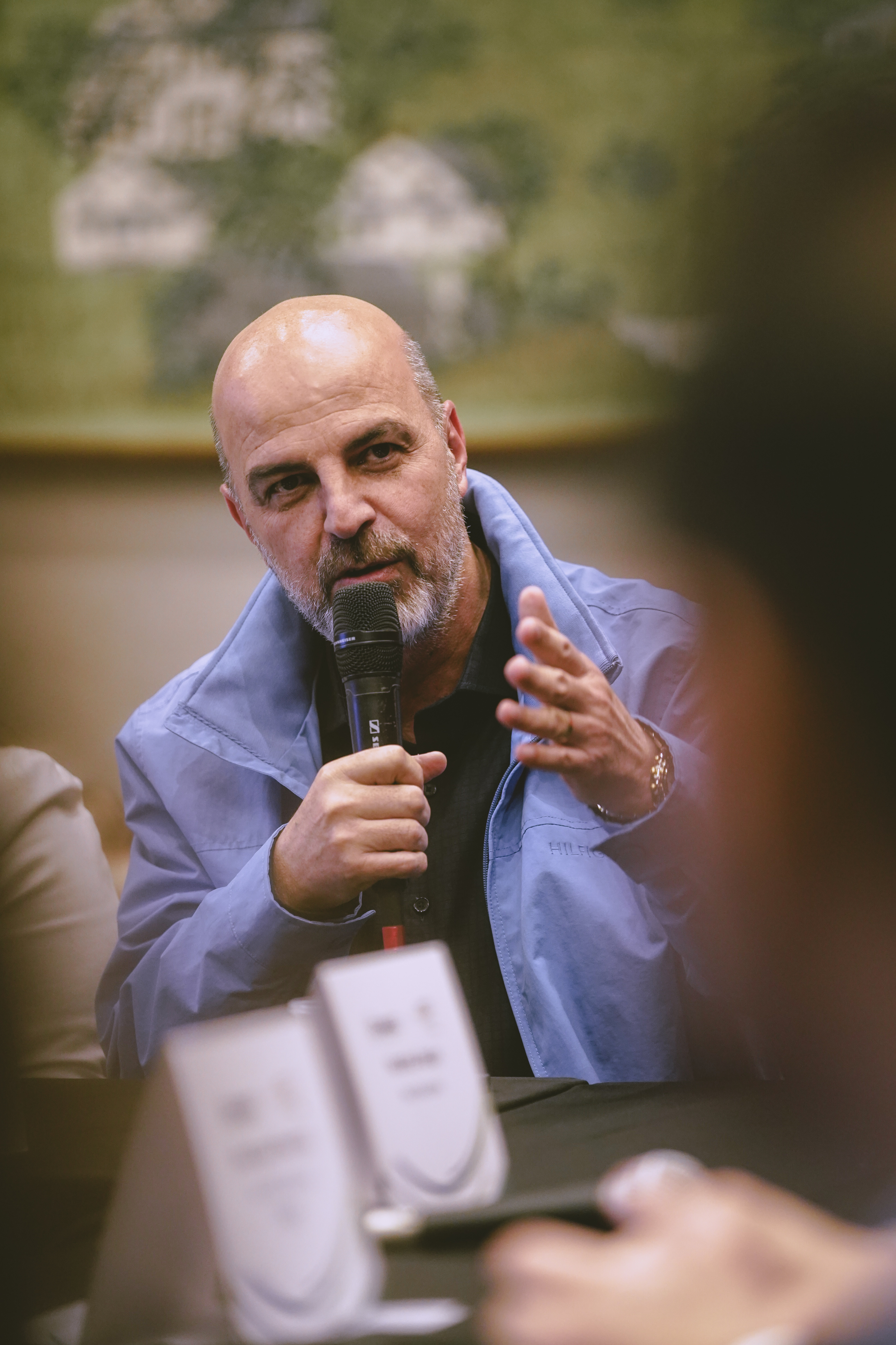 A foto ilustra o secretário de Educação, Amauri Monge Fernandes, sentado numa cadeira e com microfone na mão falando numa reunião de secretários de Educação das capitais brasileiras. Trata-se de um homem calvo, pele branca e barba parcialmente branca.