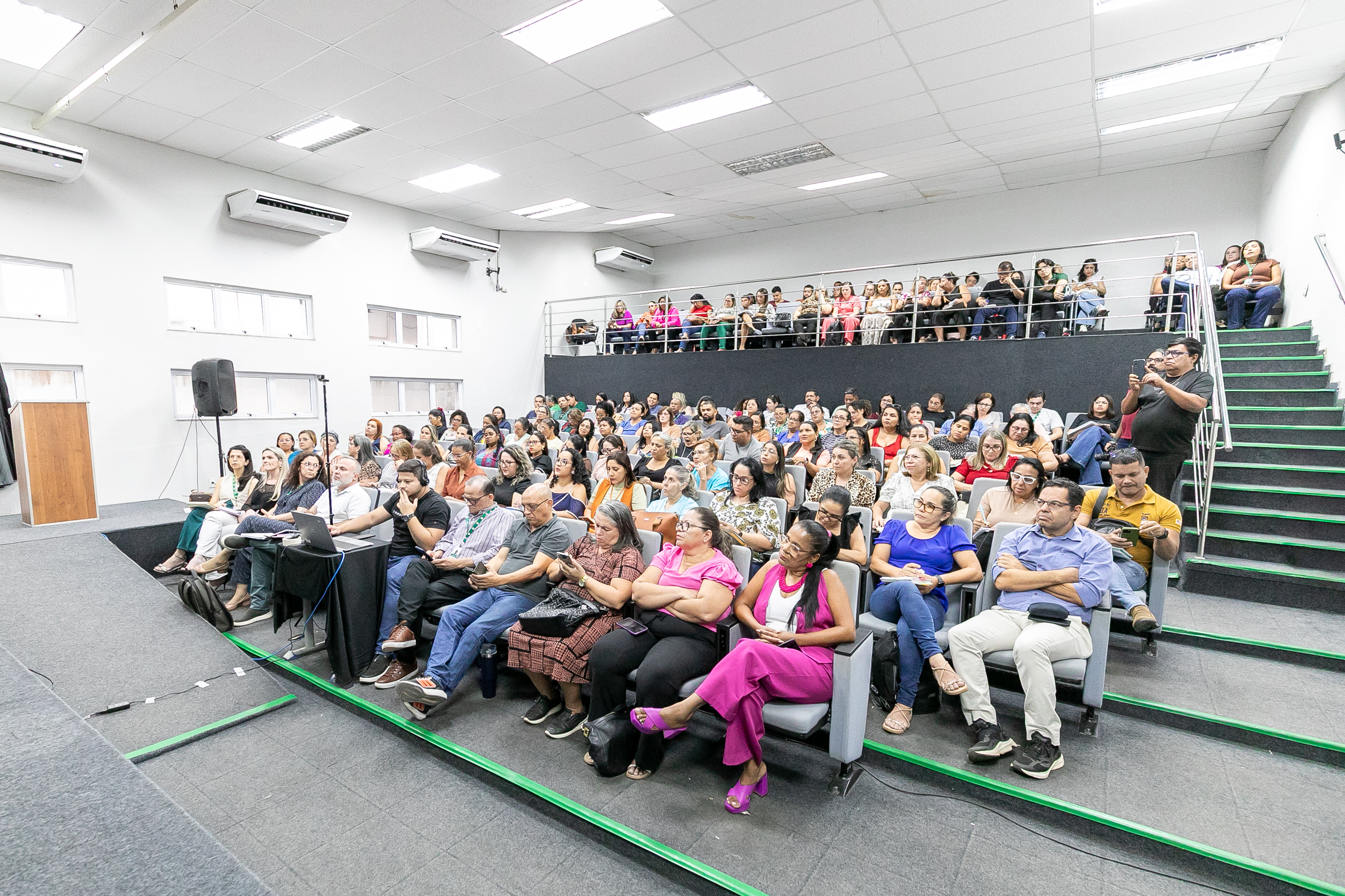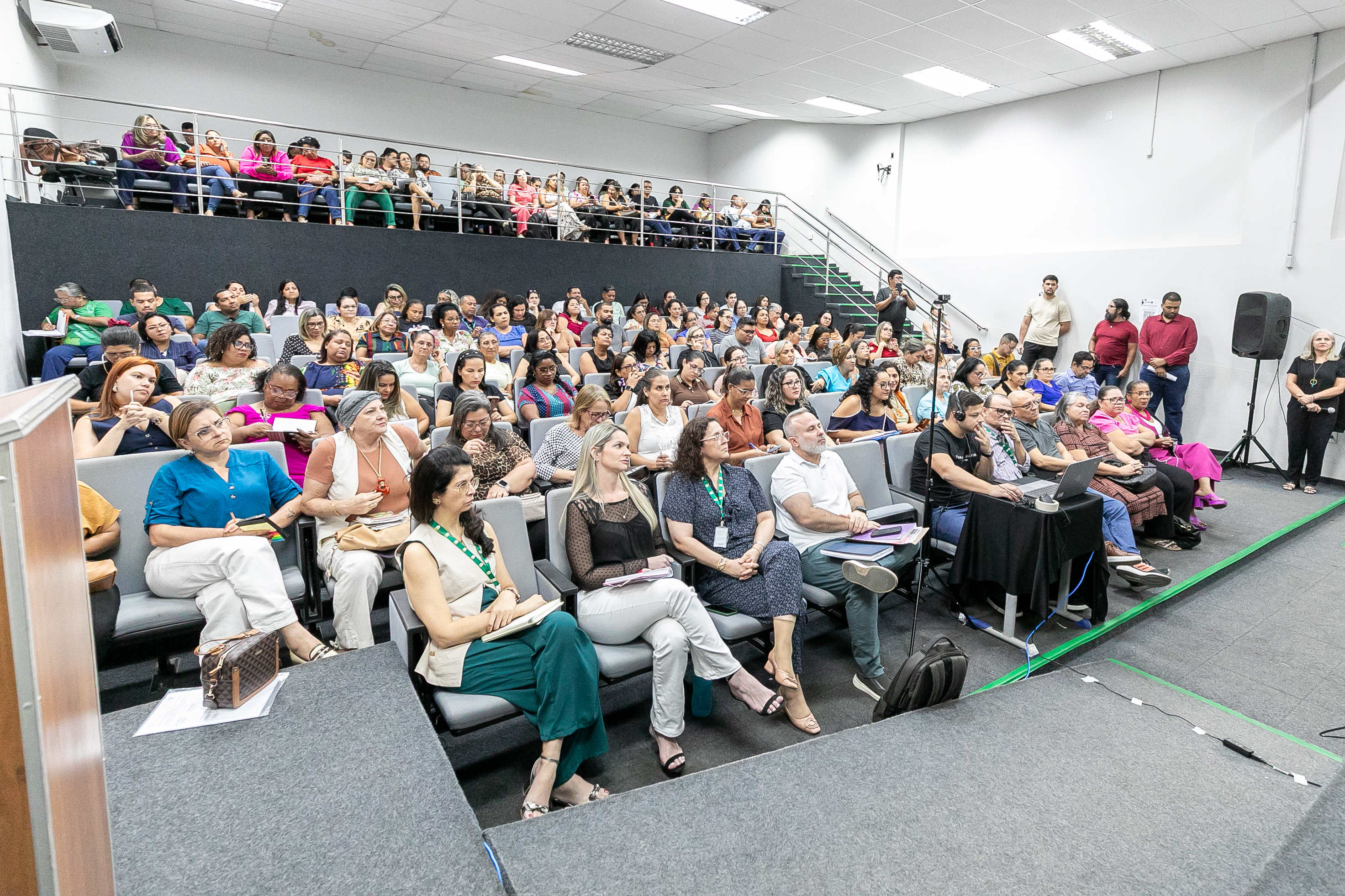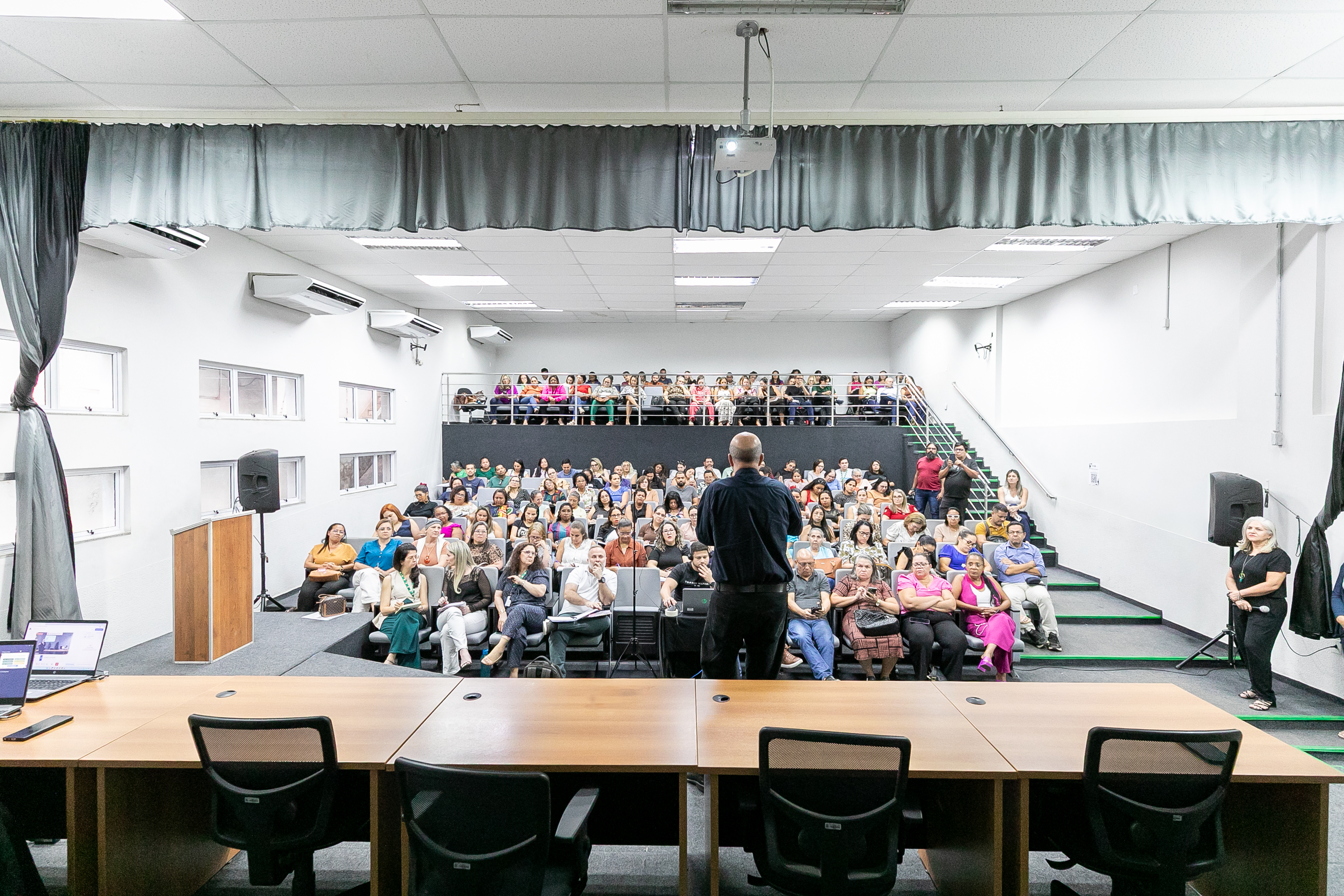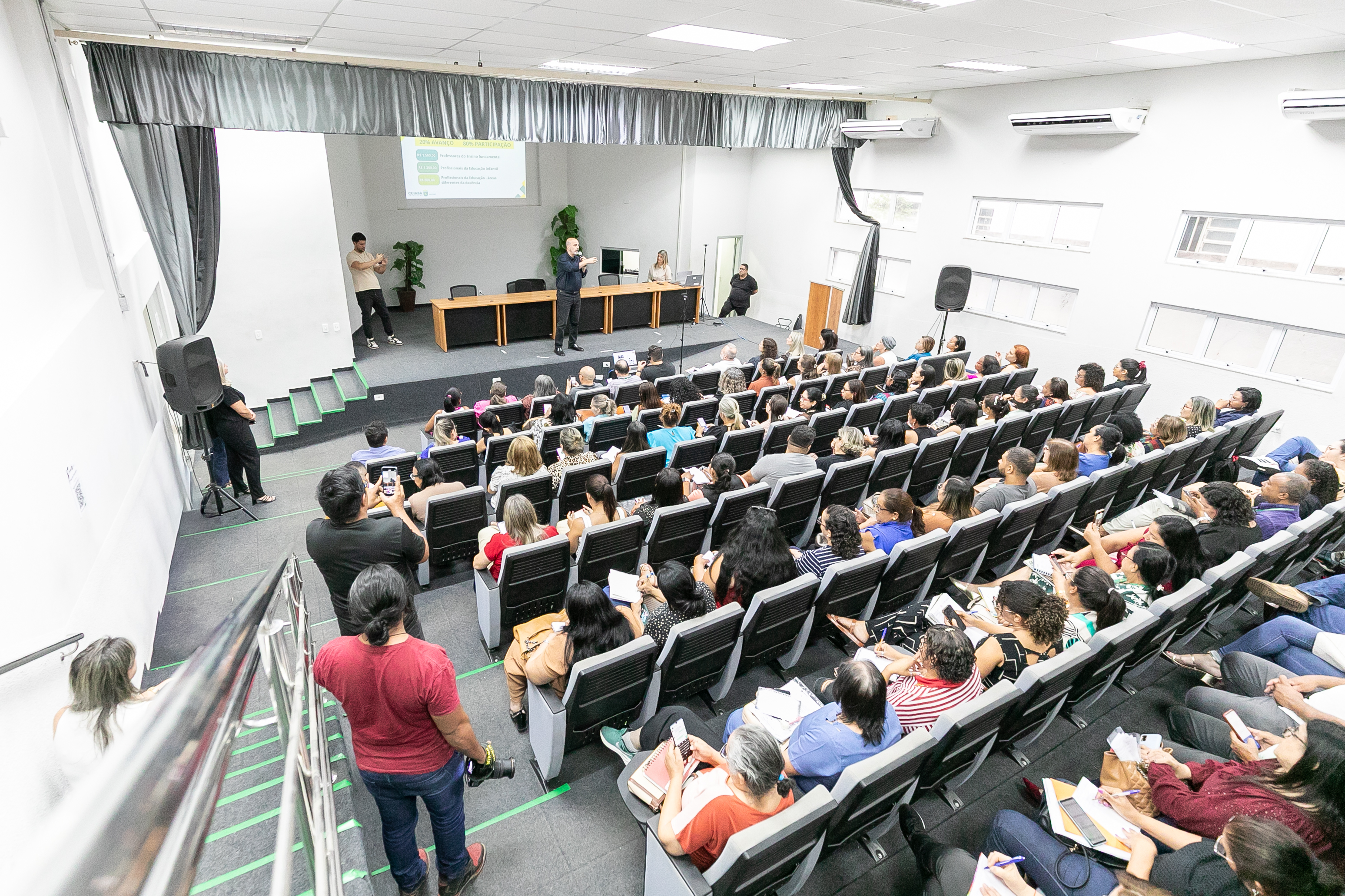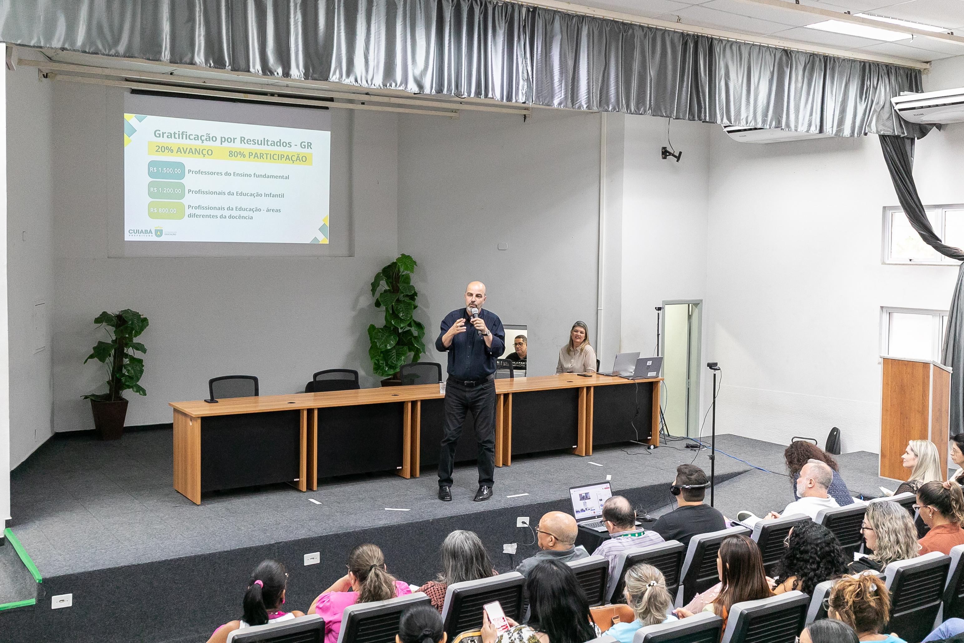 A foto ilustra o secretário de Educação de Cuiabá, Amauri Monge Fernandes, vestido com traje social em um palco de auditório. É possível visualizar servidores da educação sentados em cadeiras almofadadas, atentos à fala do secretário.