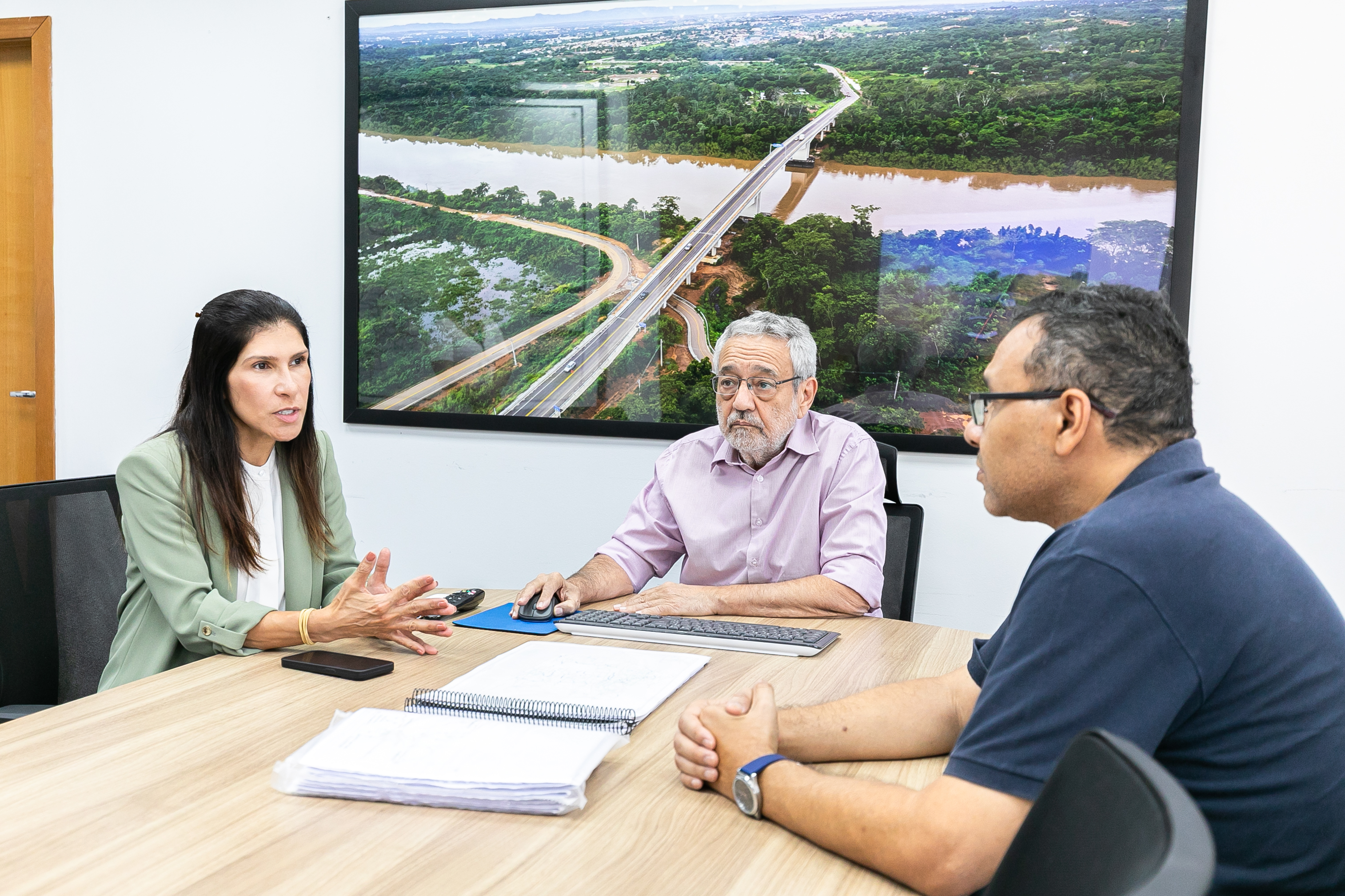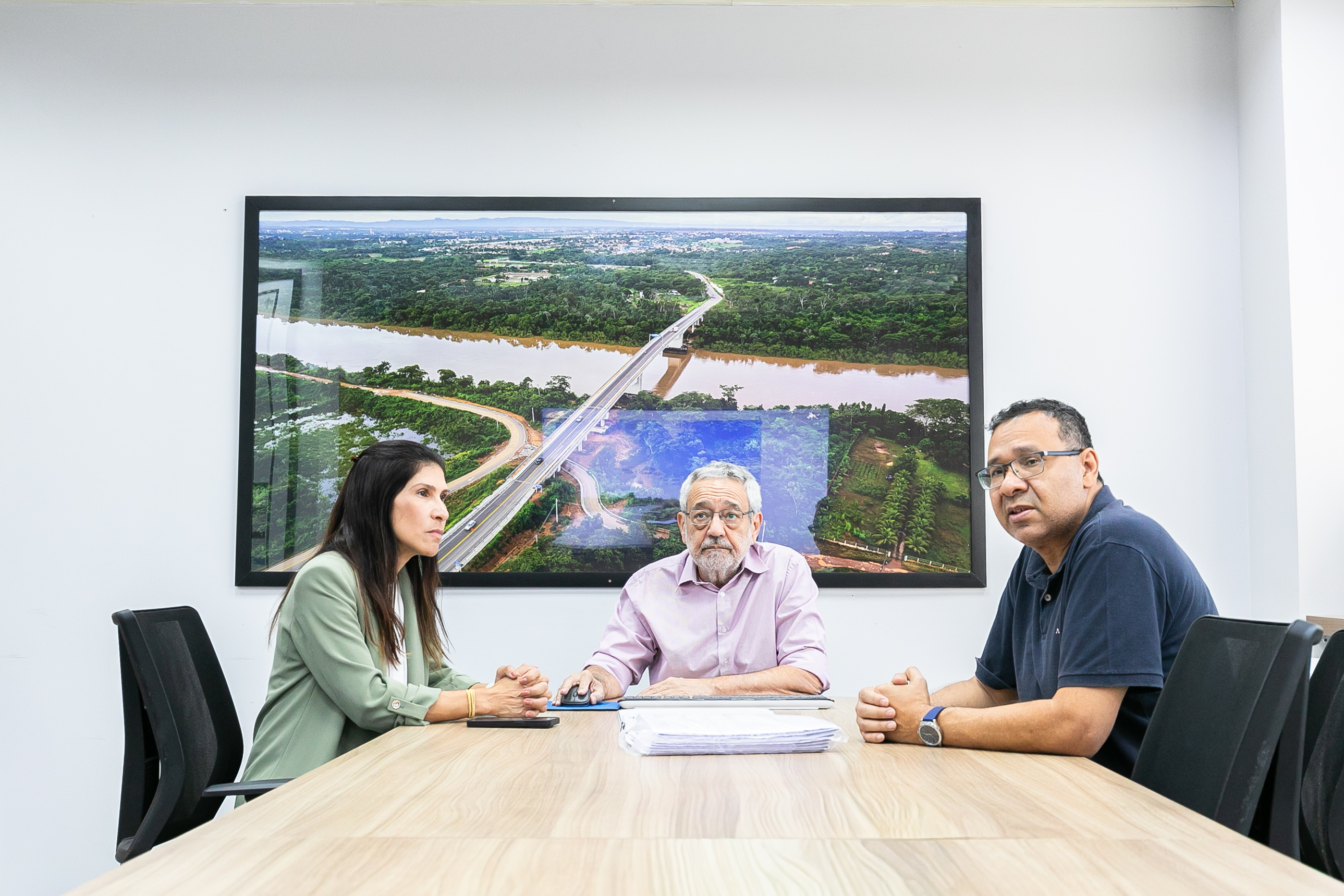 A foto mostra a secretária da Semob, coronel Francyanne Lacerda, o secretário da Sinfra, Marcelo Padeiro, e o secretário adjunto da Sinfra, Isaac Nascimento Filho, sentados em volta de uma mesa de reunião, no gabinete do gestor estadual. Sobre a mesa estão livros e, ao fundo do cenário, um quadro exibe uma ponte sobre o rio.