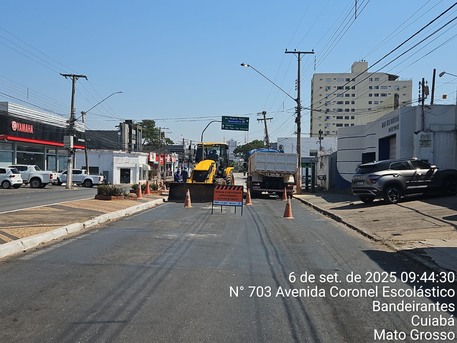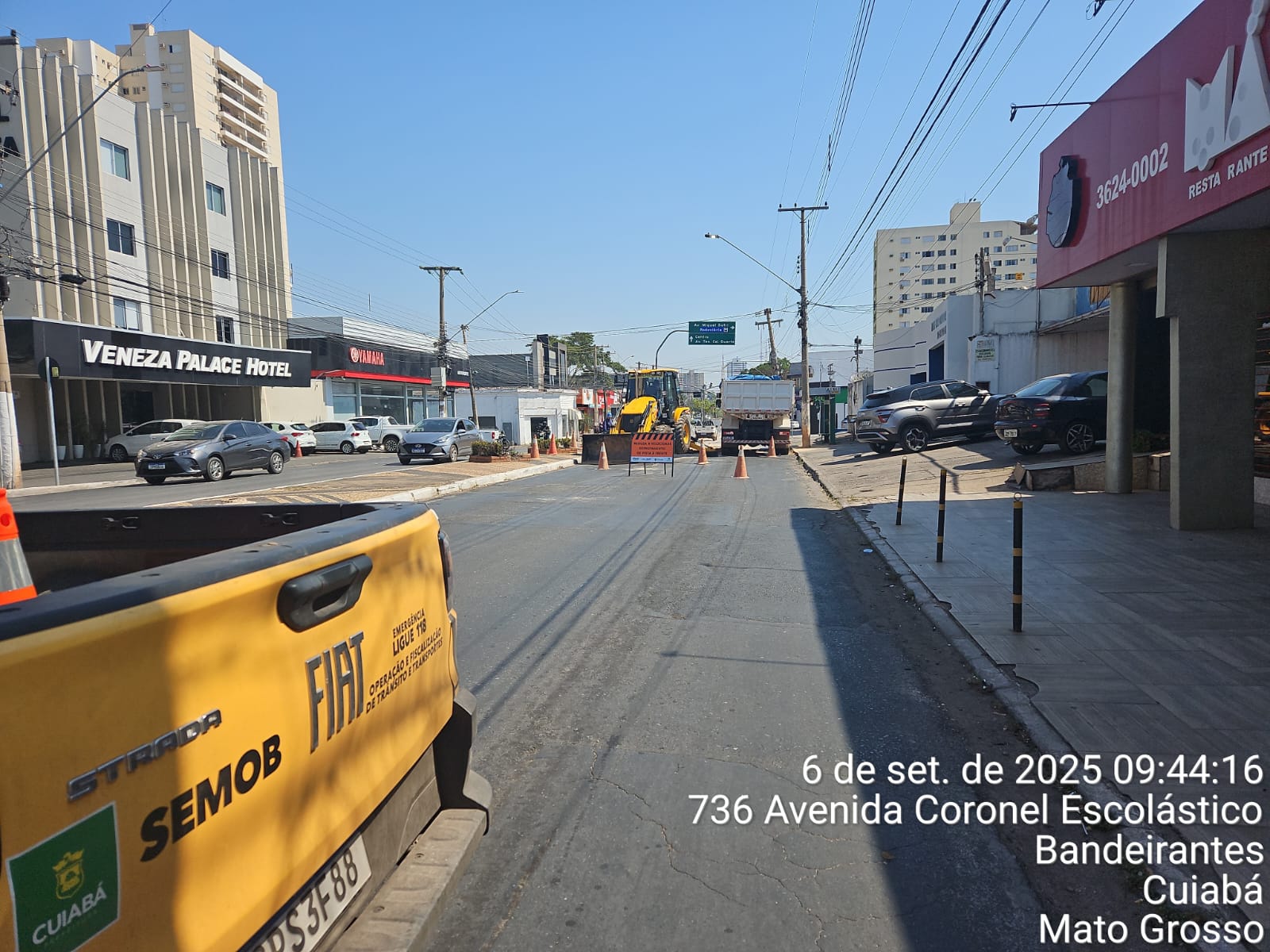 A Secretaria Municipal de Mobilidade Urbana (Semob) informa que a Avenida Coronel Escolástico, no bairro Areão, está interditada no sentido Centro Histórico para a realização de reparo emergencial em rede de abastecimento de água, executado pela concessionária Águas Cuiabá.