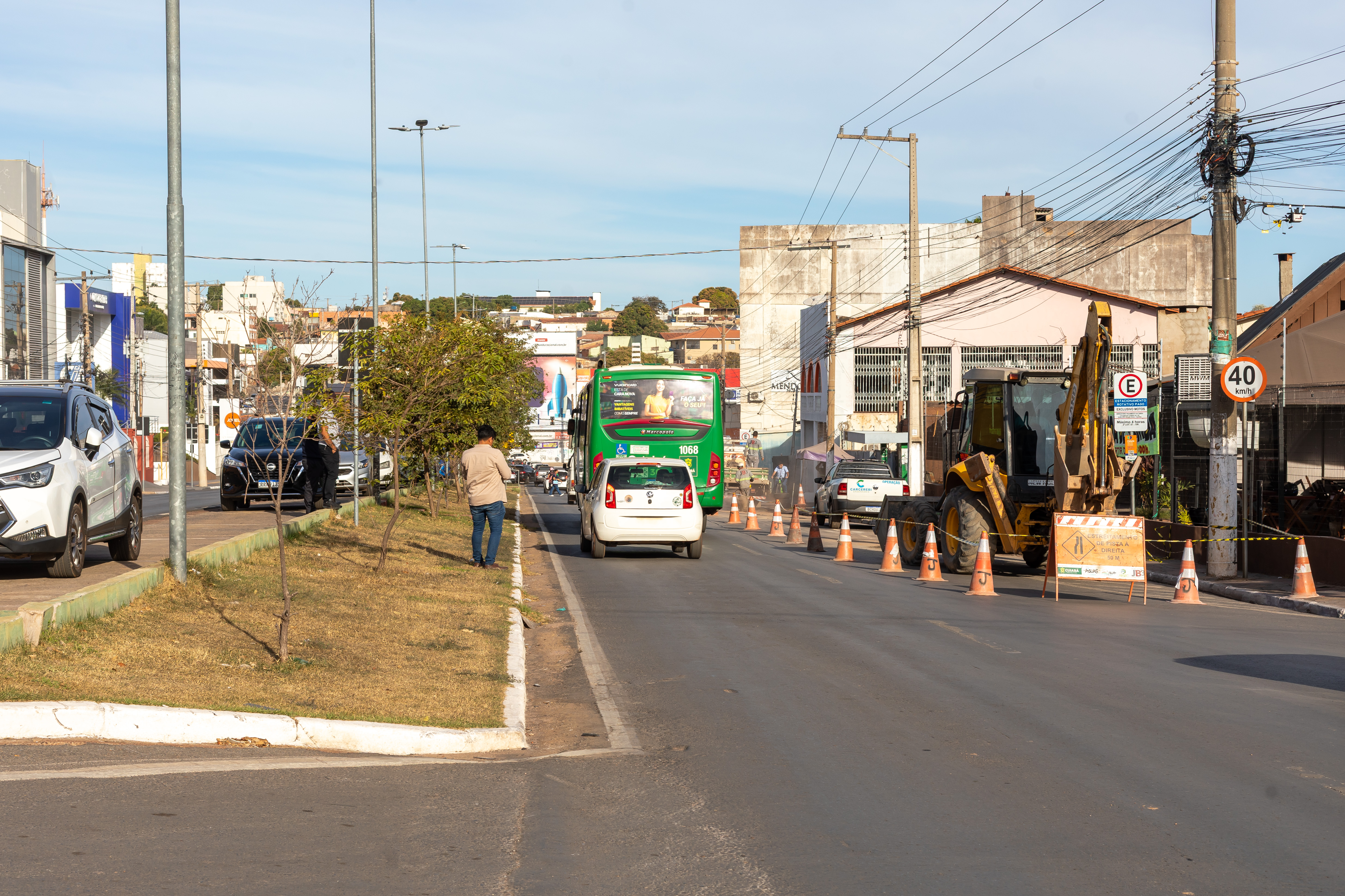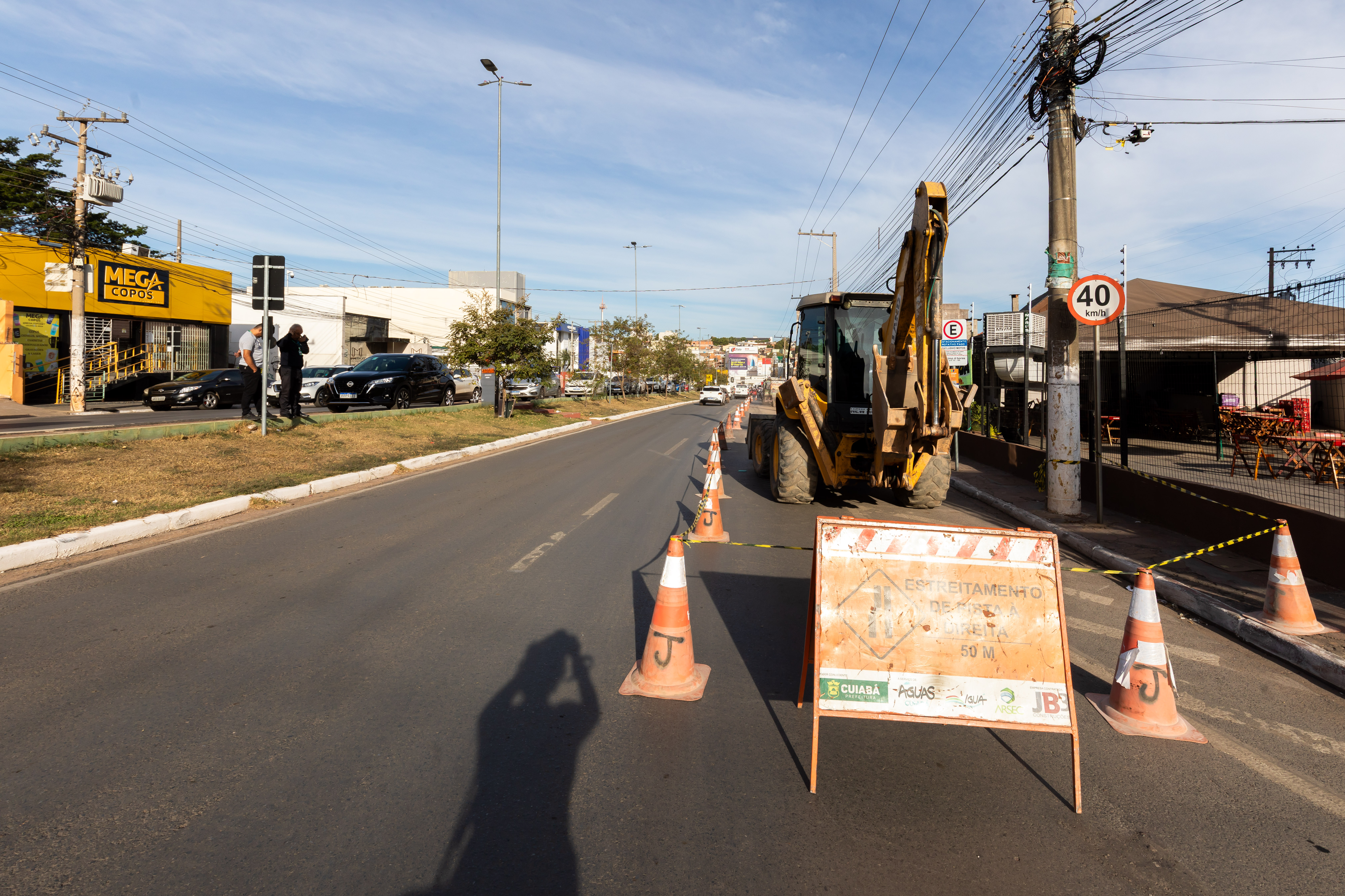 A imagem mostra a interdição de meia pista da Av. Mato Grosso, com cones fazendo a divisão da via. Há maquinário na pista direita, onde acontecem as obras da Concessionária Águas Cuiabá.