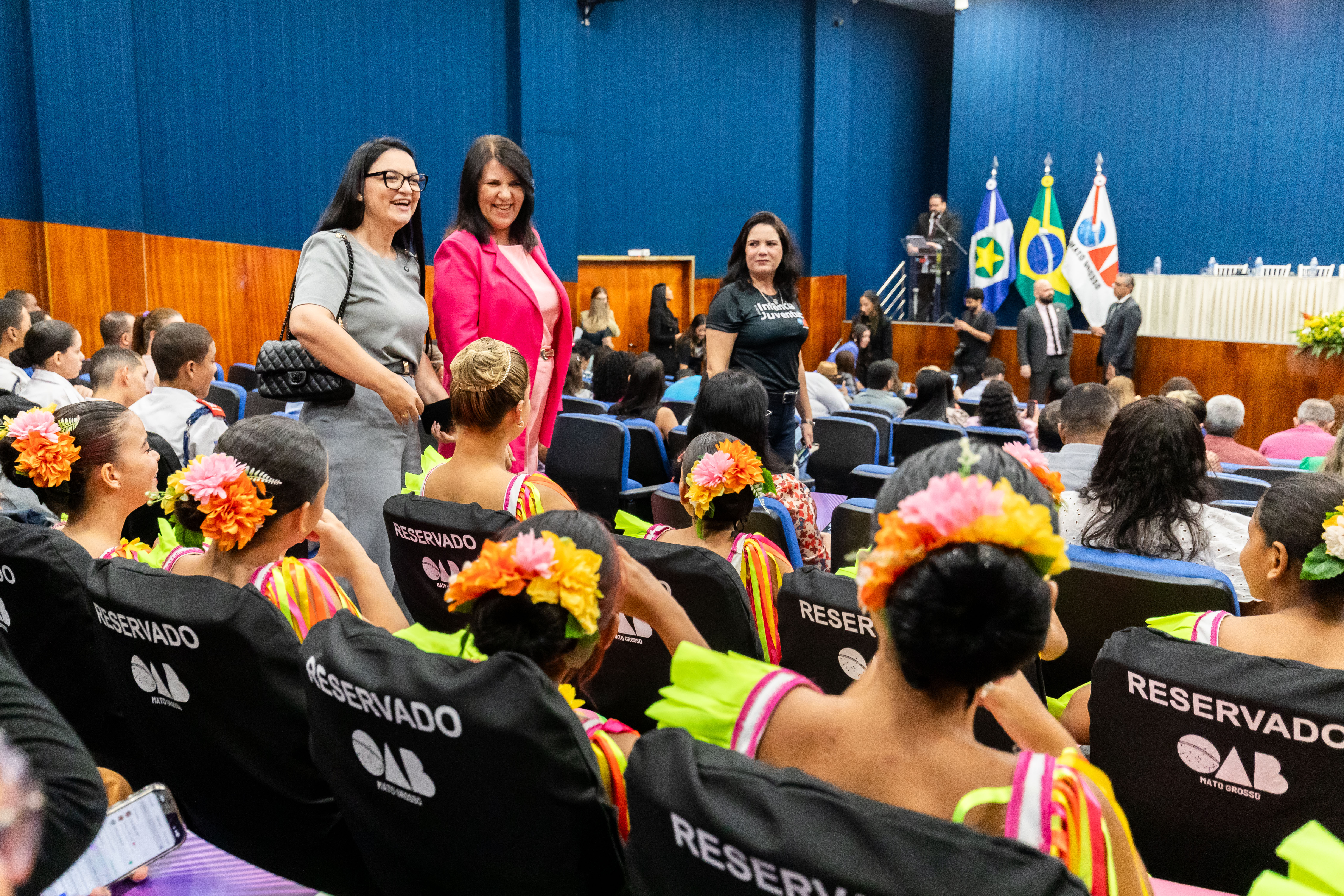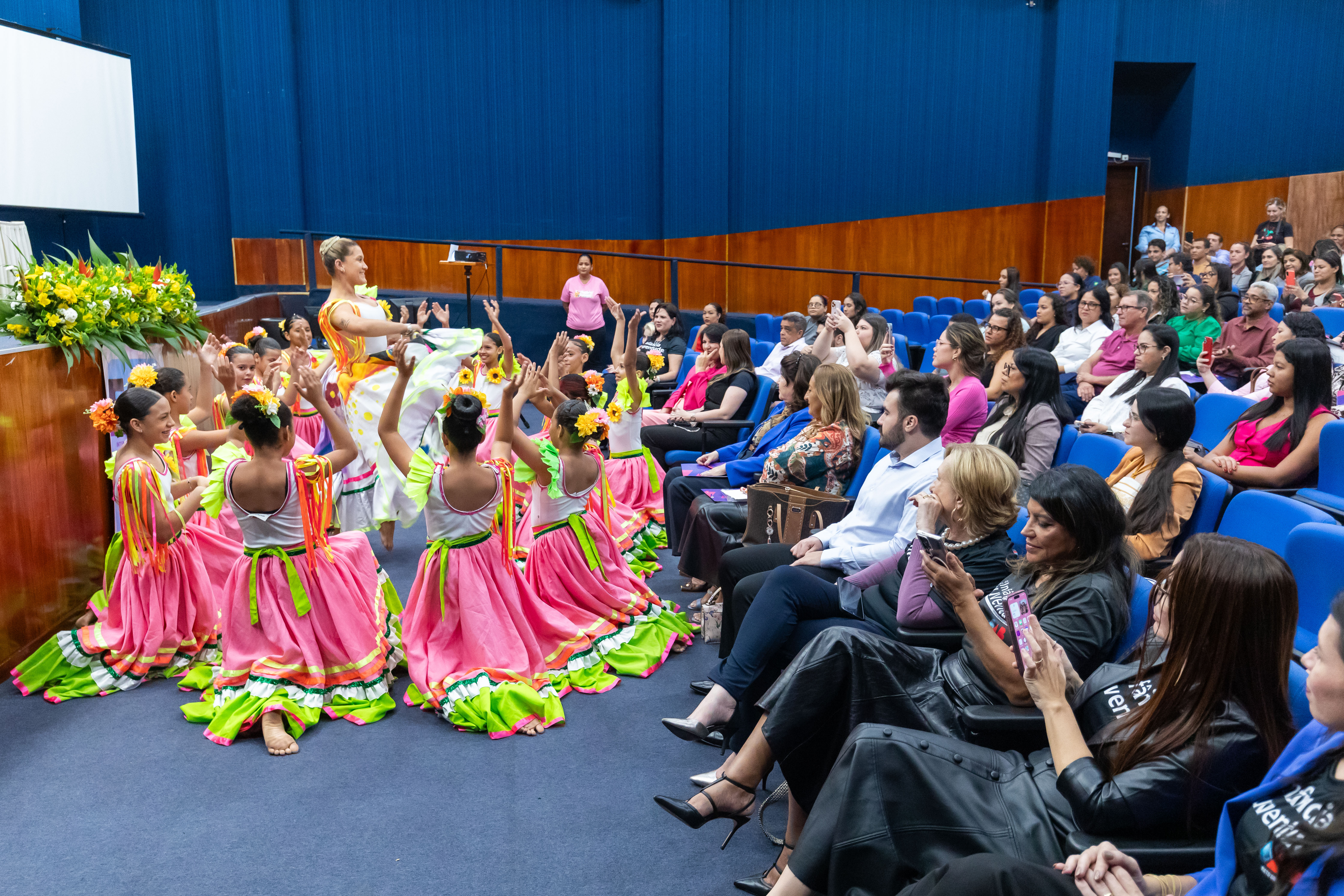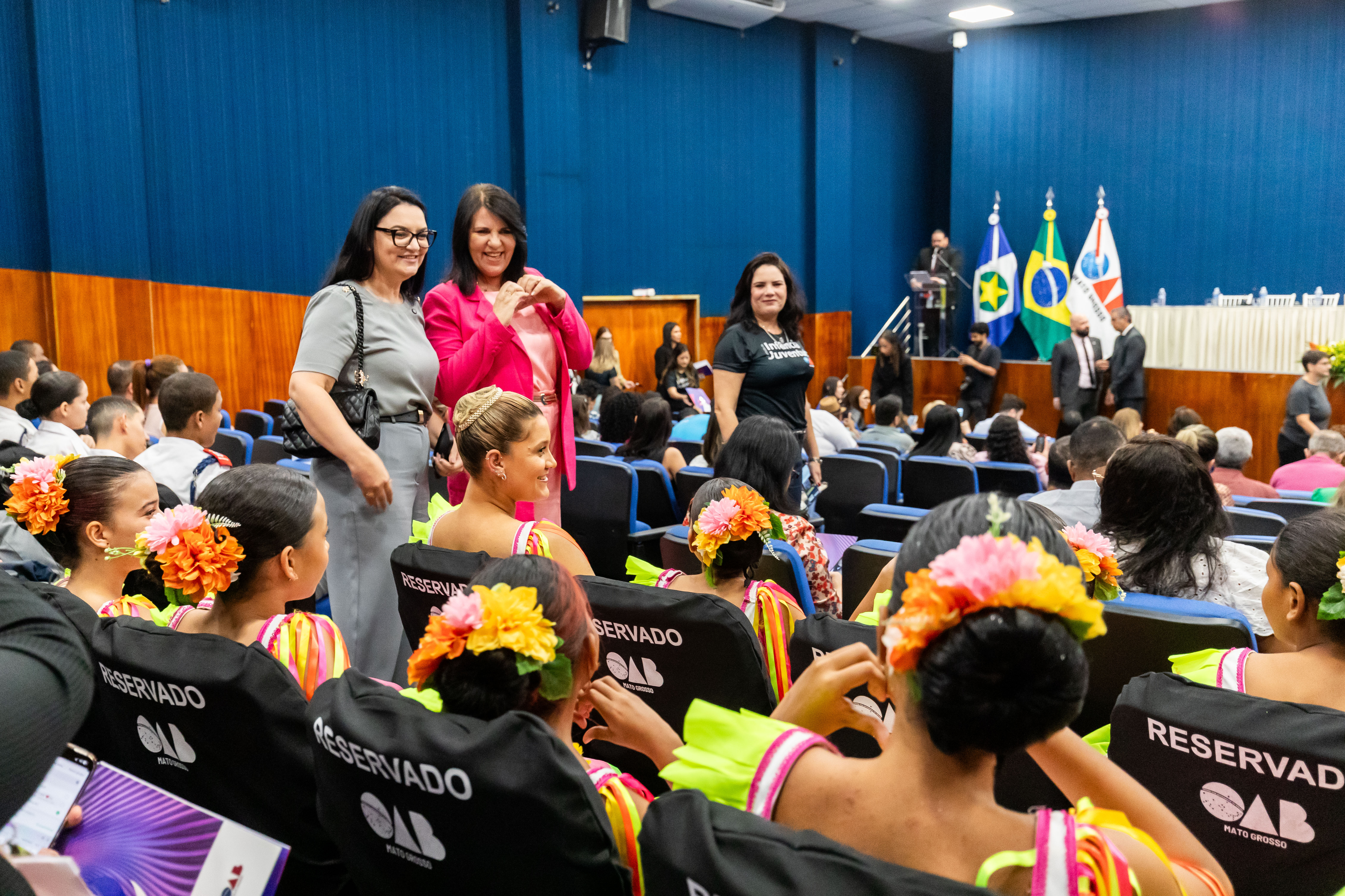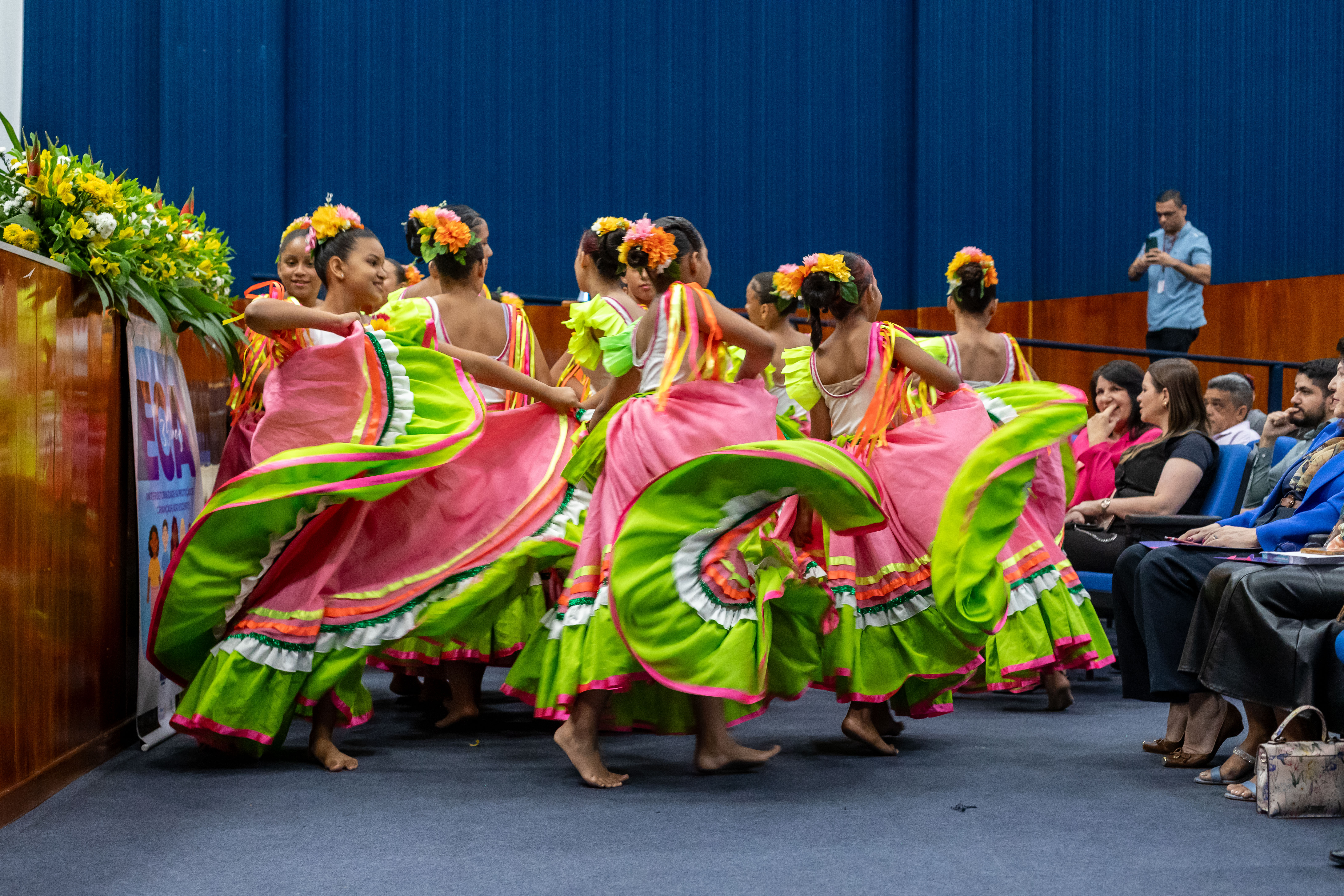 O grupo de dança do programa Simininas, da unidade do bairro Três Barras, e a primeira-dama e vereadora de Cuiabá, Samantha Iris, participaram da comemoração pelos 35 anos do Estatuto da Criança e do Adolescente (ECA), promovida pela Ordem dos Advogados do Brasil – Seccional Mato Grosso (OAB-MT).