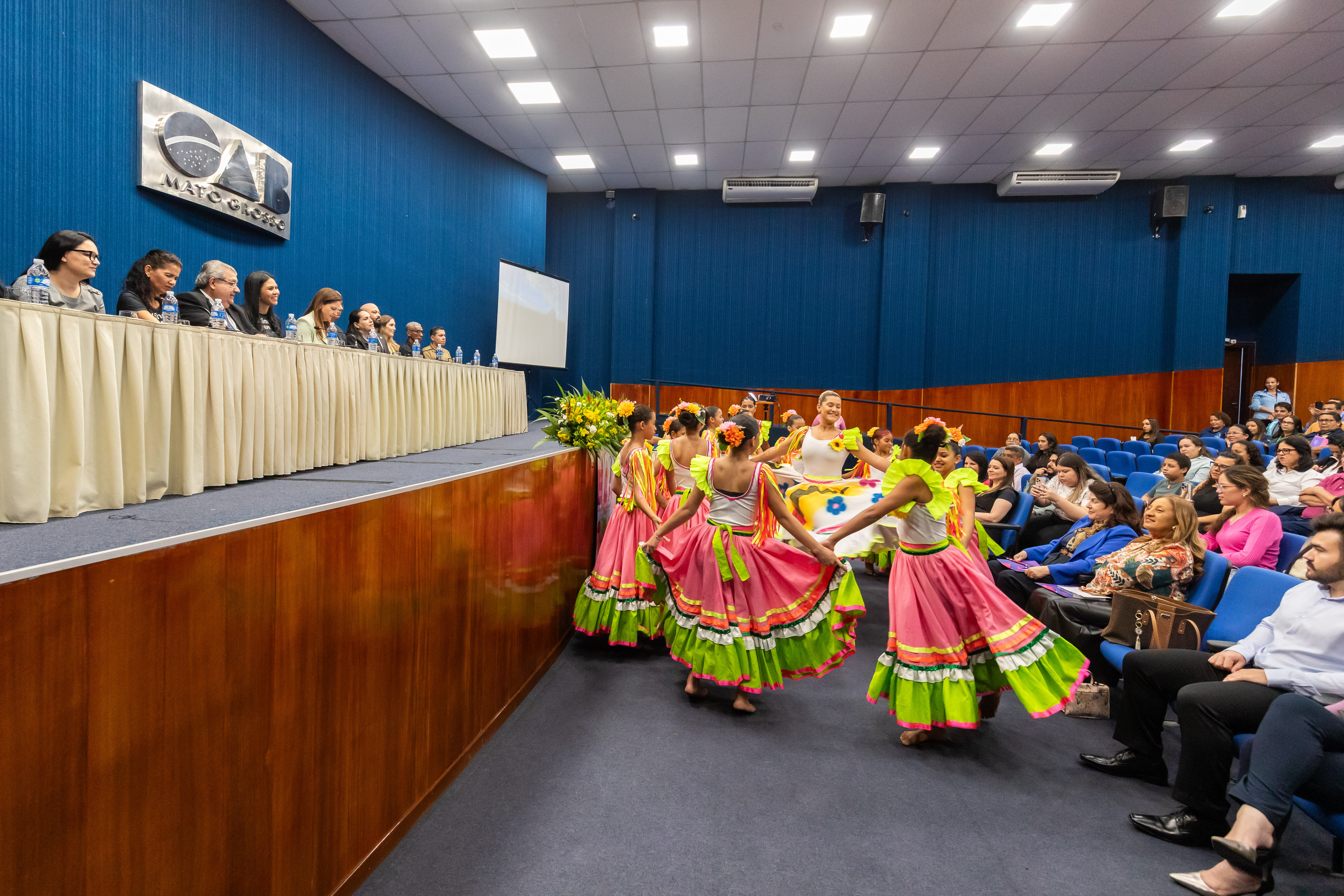 A imagem mostra as alunas do Programa Siminina, da unidade do bairro Três Barras, se apresentando no evento de comemoração dos 35 anos do ECA, promovido pela OAB-MT.