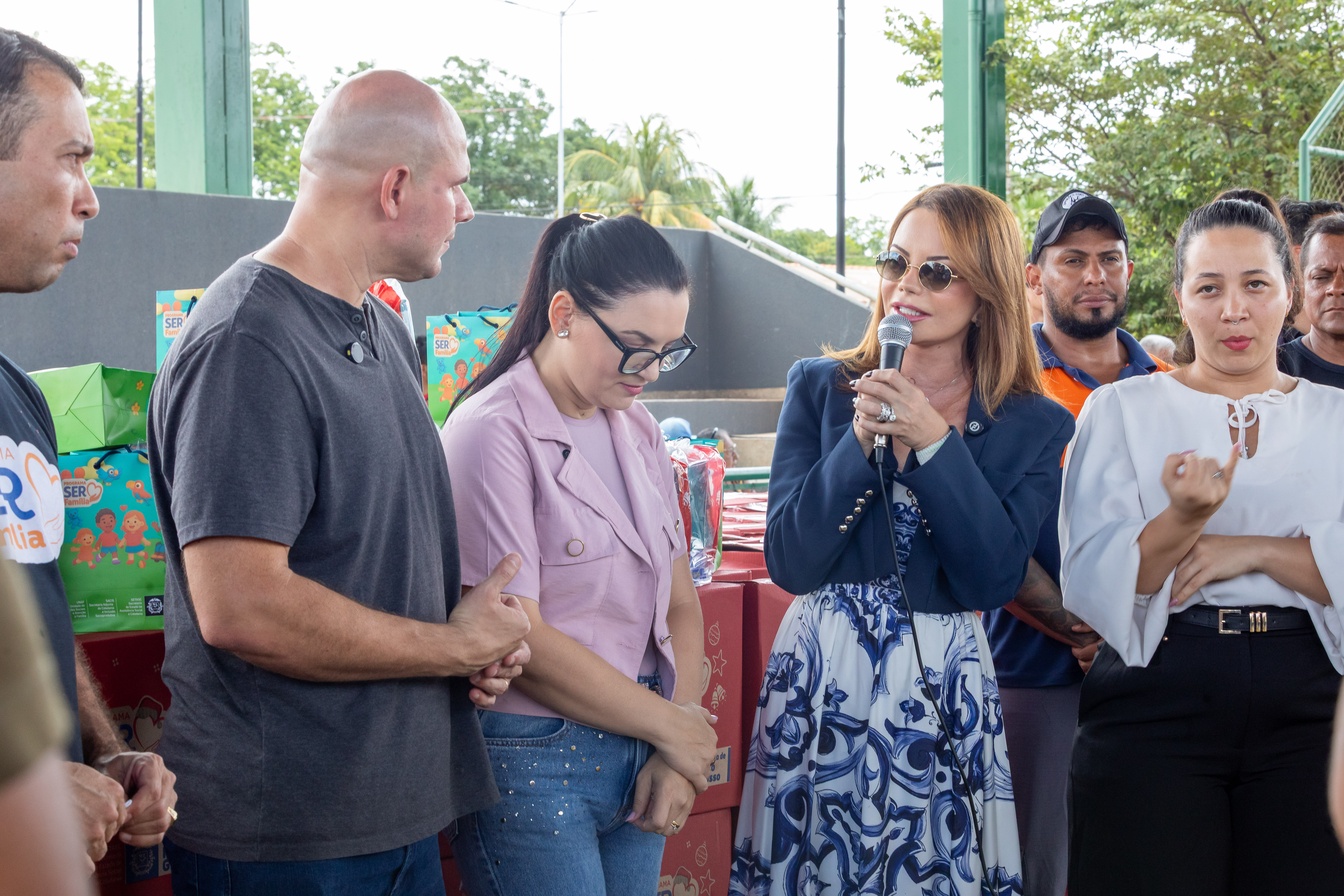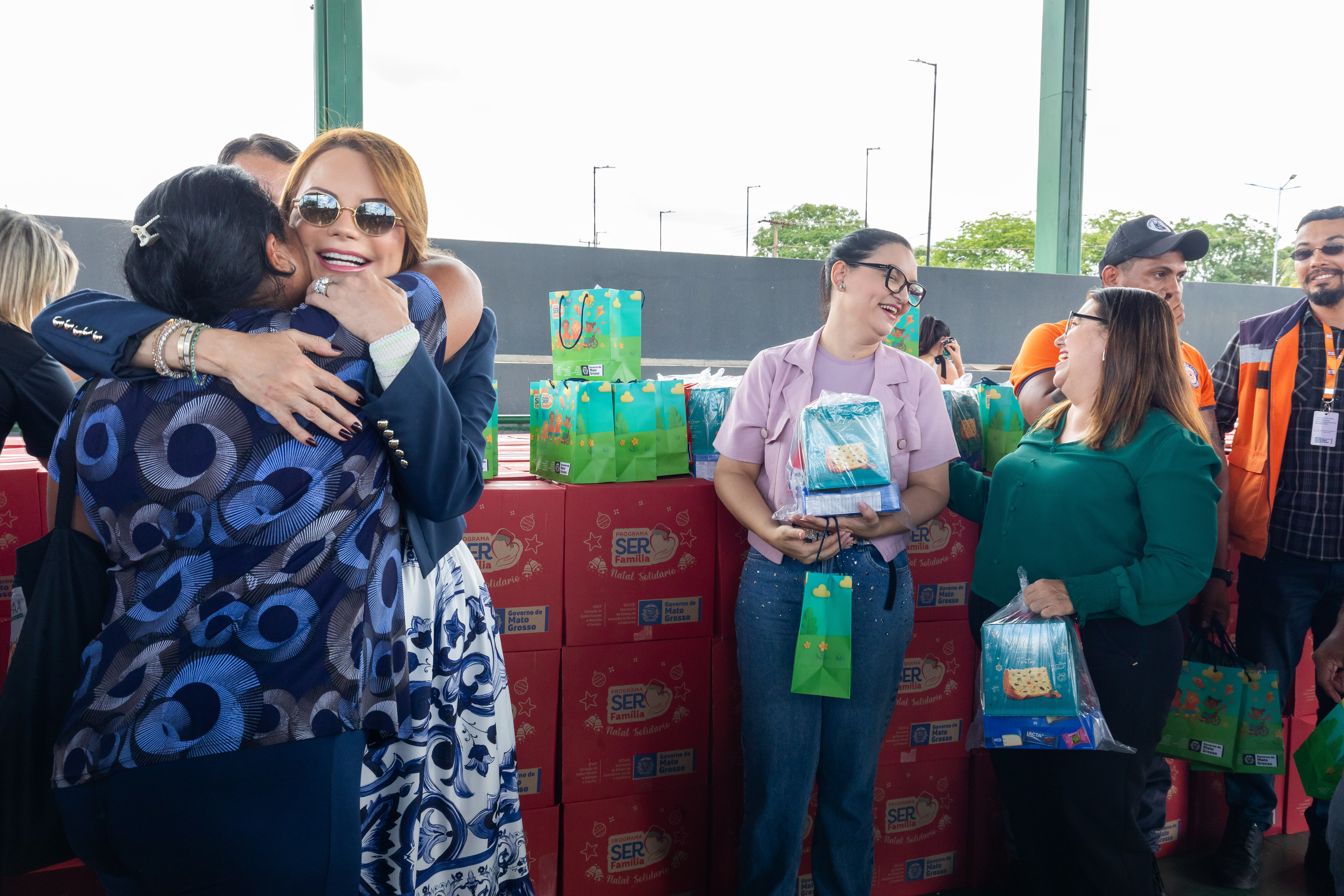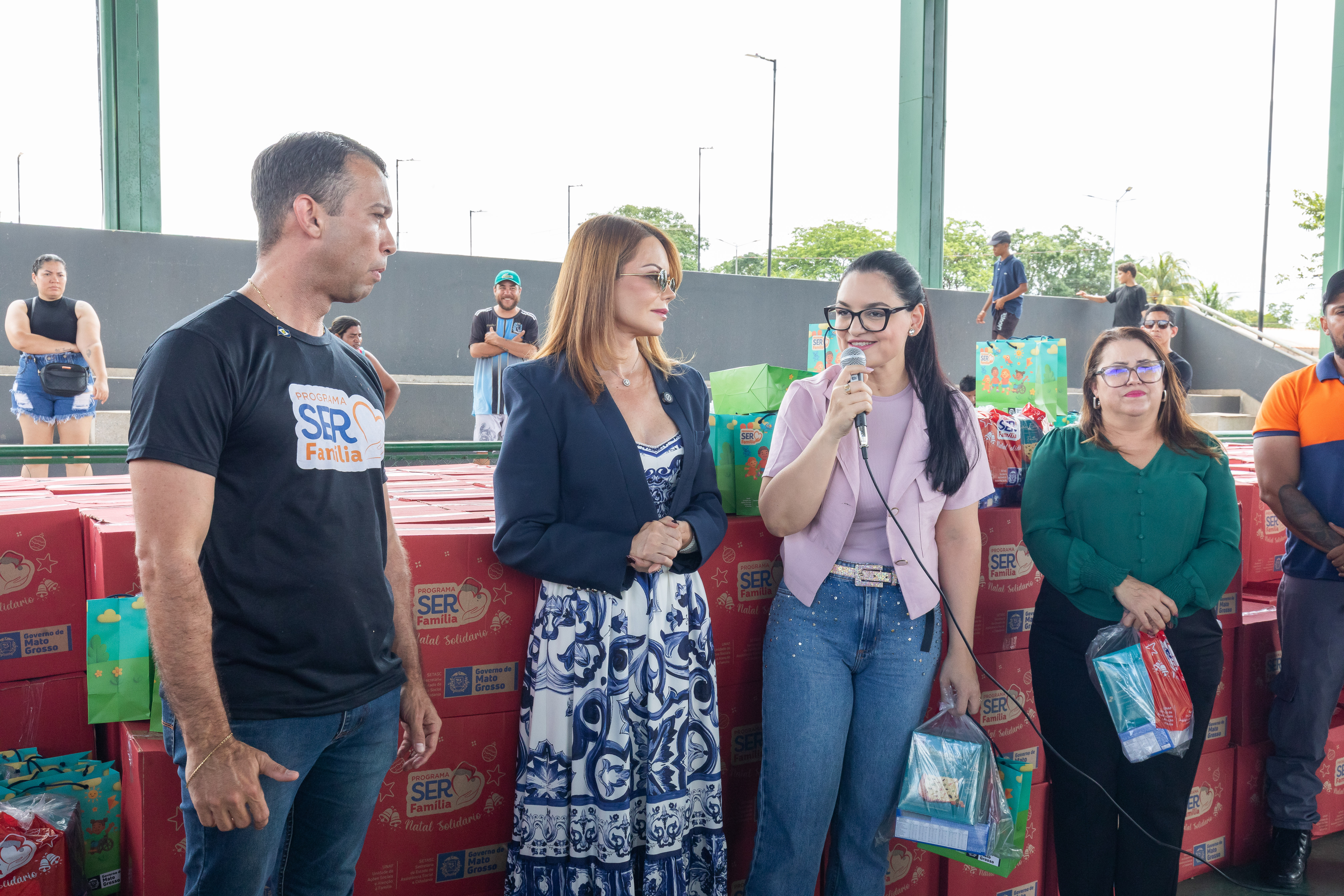 A primeira-dama de Cuiabá e vereadora Samantha Iris acompanhou, nesta quarta-feira (17), a distribuição de cestas básicas e kits natalinos para famílias em situação de vulnerabilidade social, ao lado da primeira-dama do Estado, Virginia Mendes. A ação contou ainda com a presença do prefeito Abilio Brunini e integra o programa SER Família Solidário, idealizado e coordenado pelo Governo do Estado de Mato Grosso.