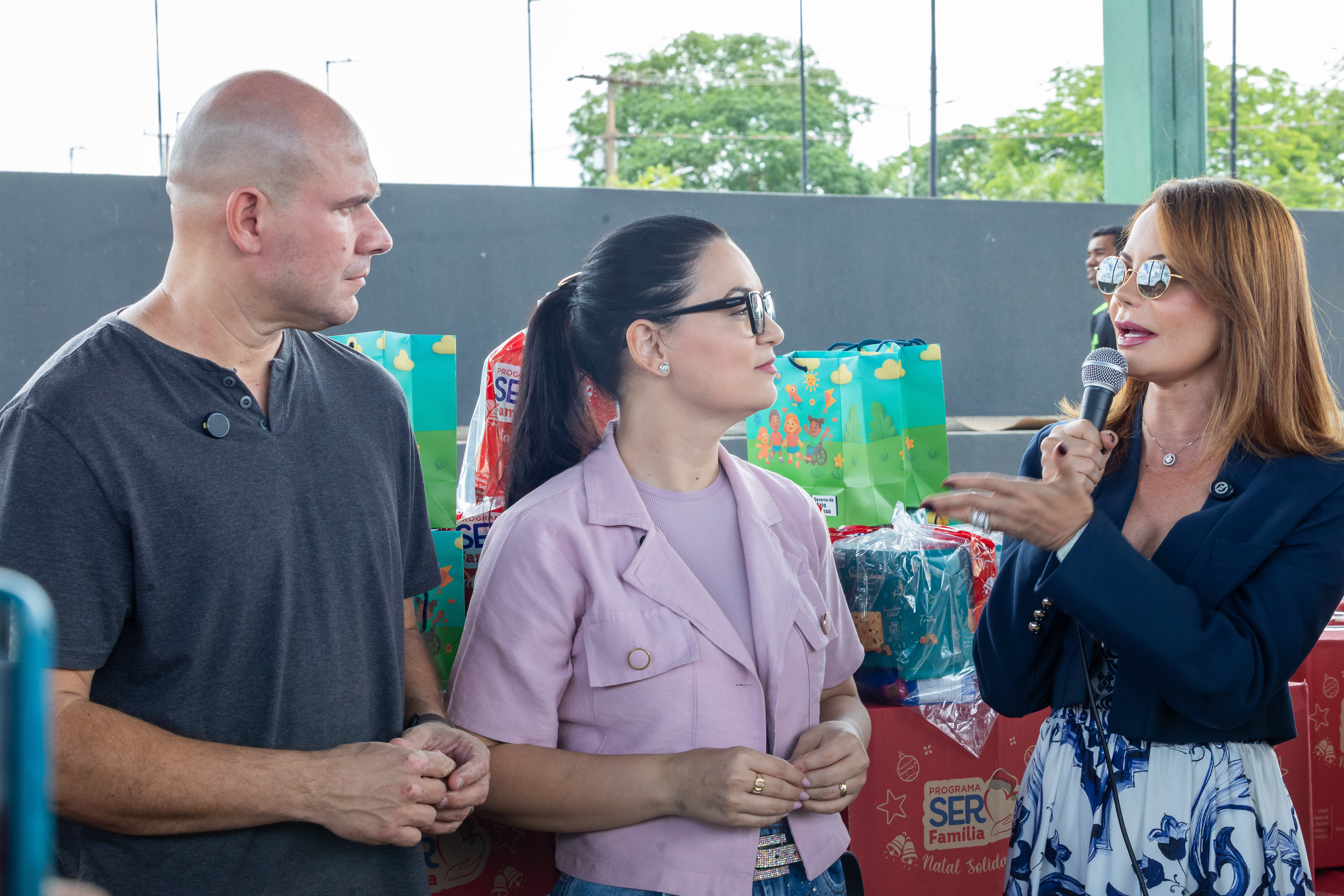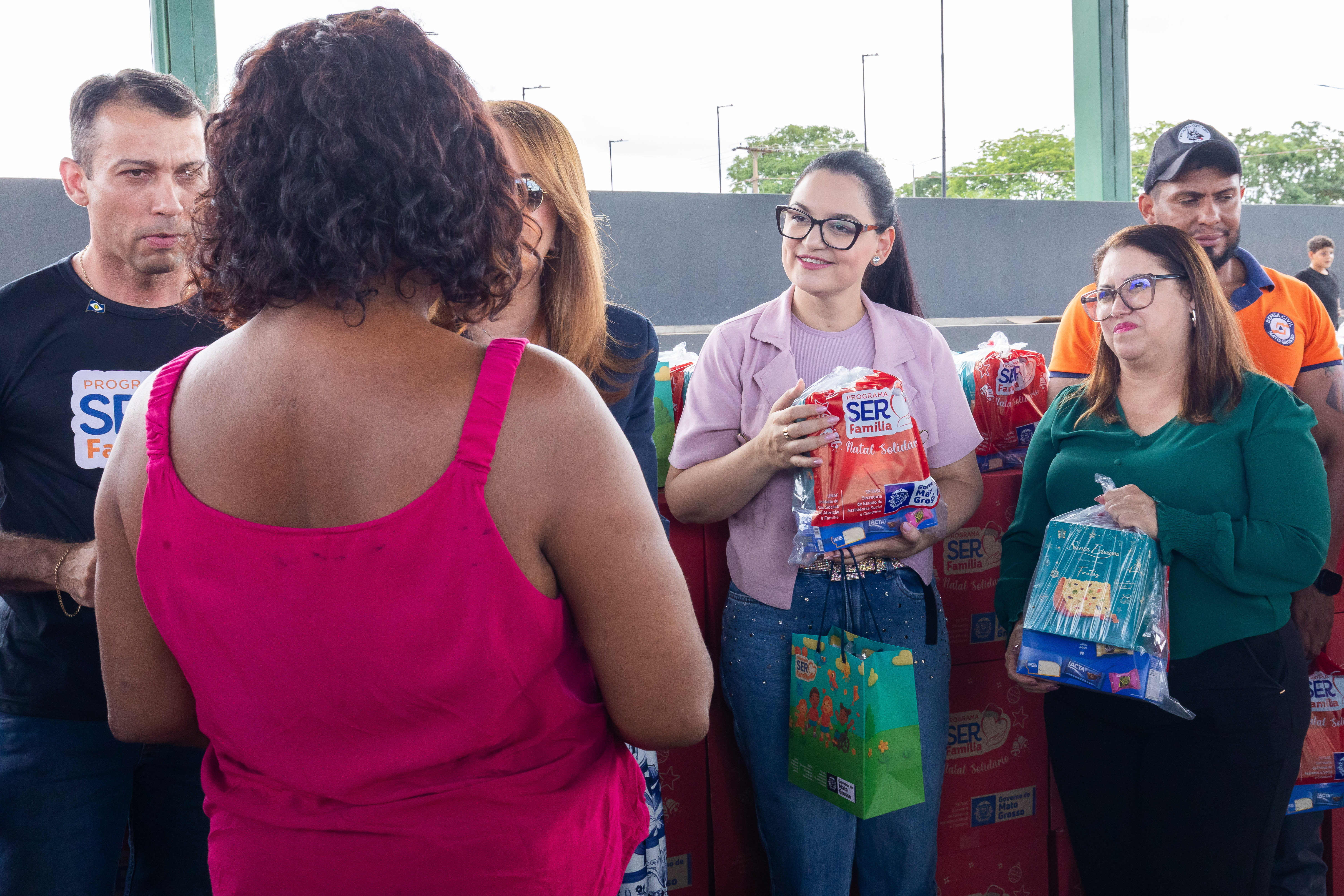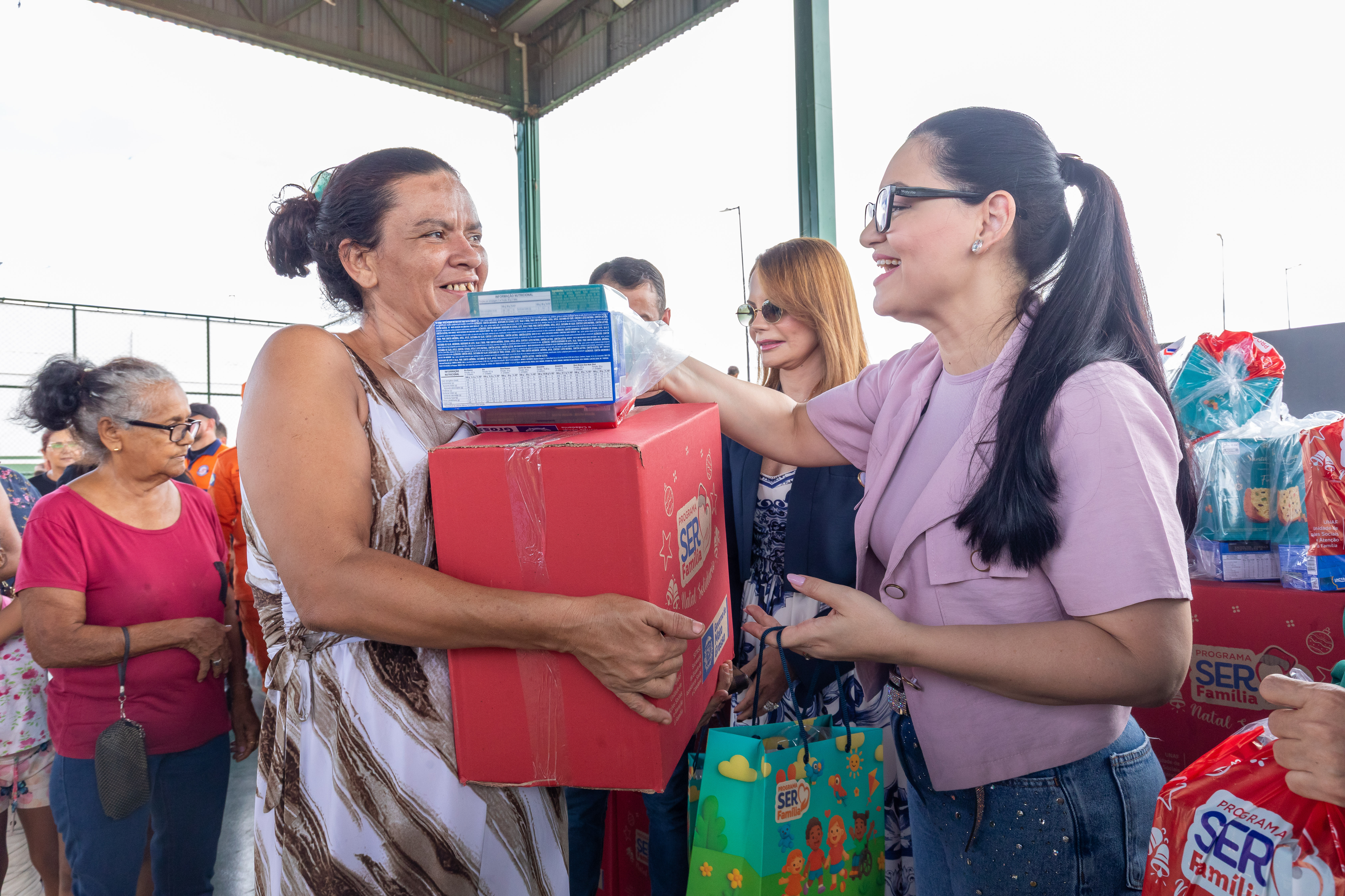 A primeira-dama de Cuiabá e vereadora Samantha Iris acompanhou, nesta quarta-feira (17), a distribuição de cestas básicas e kits natalinos para famílias em situação de vulnerabilidade social, ao lado da primeira-dama do Estado, Virginia Mendes. A ação contou ainda com a presença do prefeito Abilio Brunini e integra o programa SER Família Solidário, idealizado e coordenado pelo Governo do Estado de Mato Grosso.