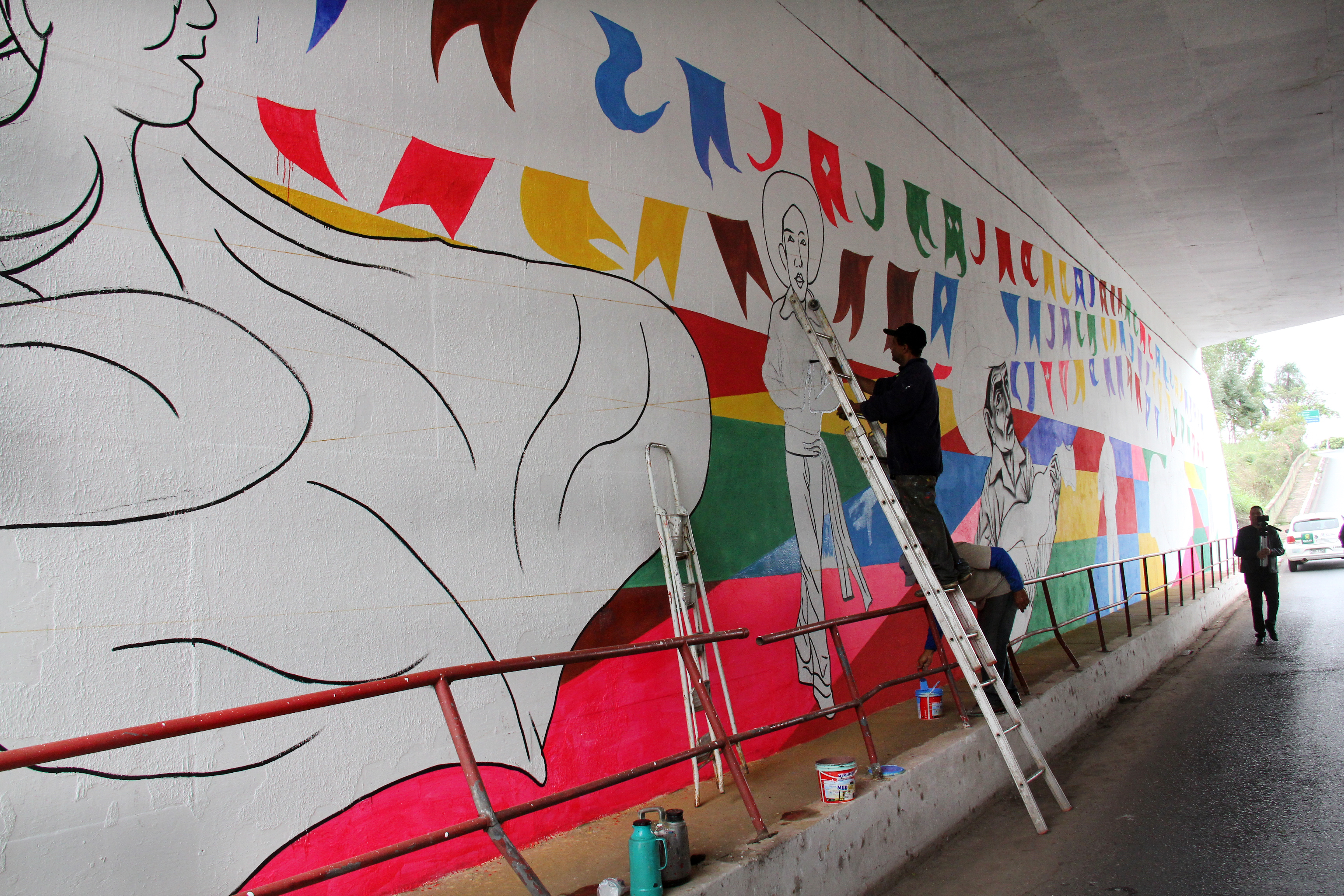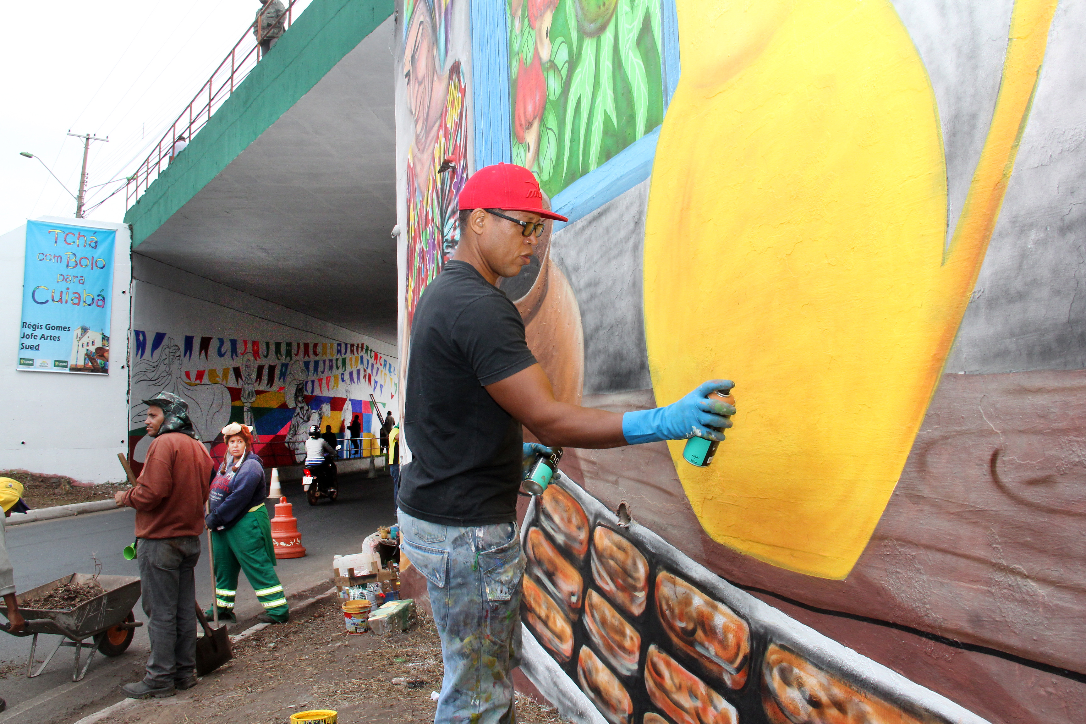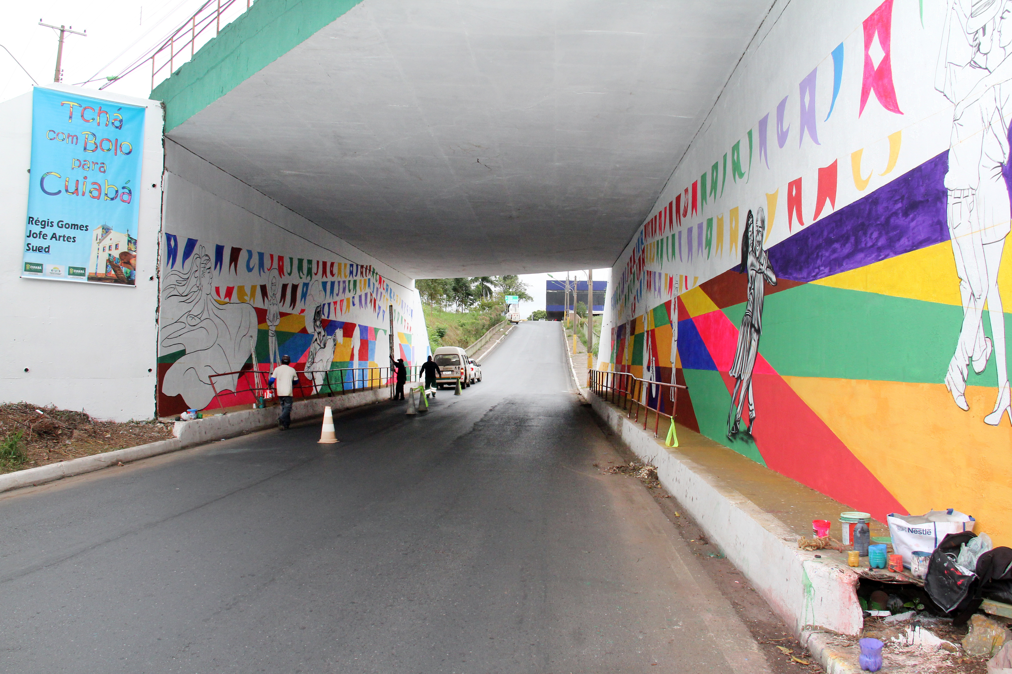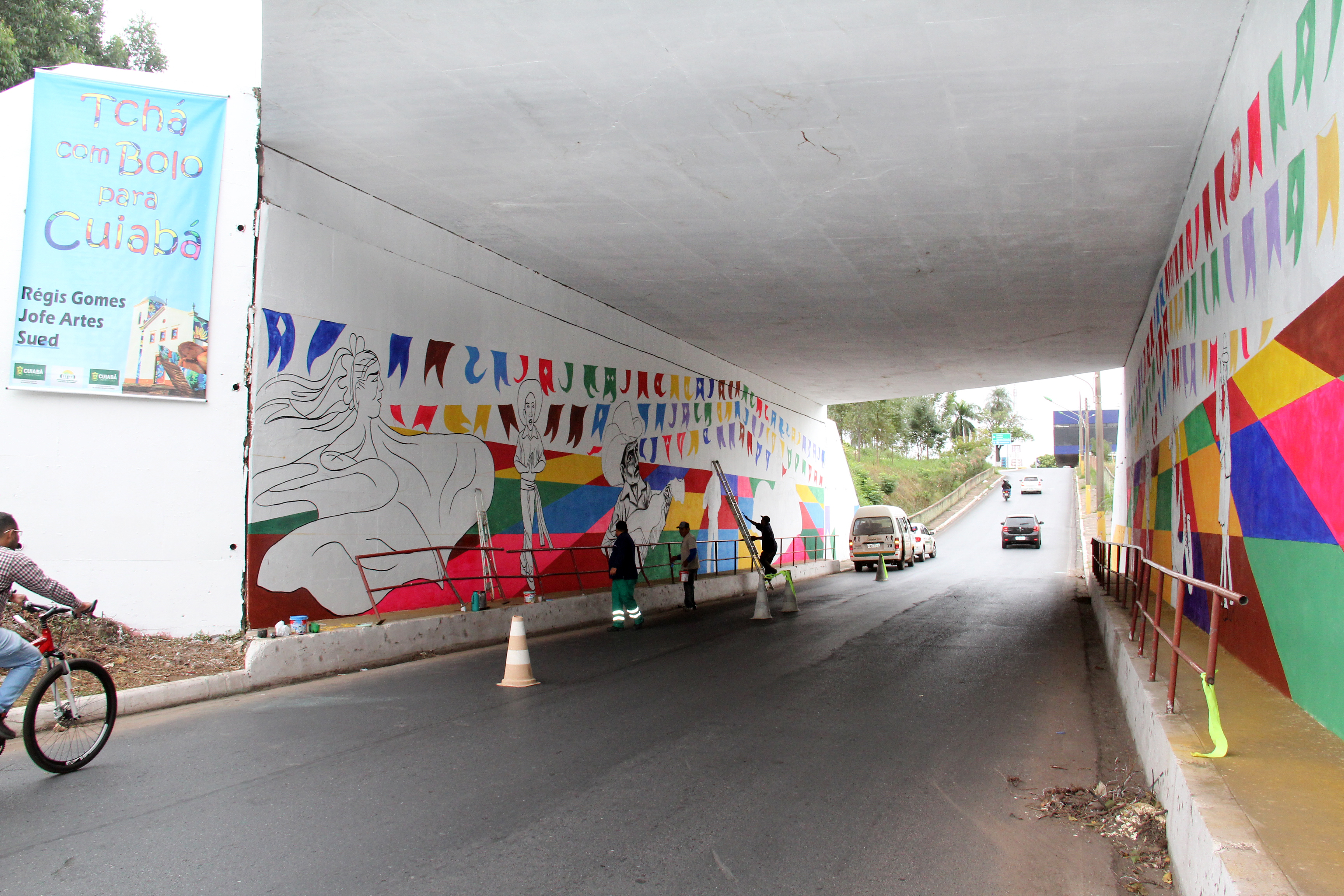 A Prefeitura de Cuiabá por meio do Conselho Municipal de Cultura, em parceria da Secretaria de Serviços Urbanos está restaurando o túnel da rodoviária com o projeto “Tchá Com Bolo Pra Cuiabá”, do artista Régis Gomes, selecionado edital do Fundo Municipal de Apoio e Estímulo à Cultura/2017, da Secretaria de Cultura, Esporte e Turismo.