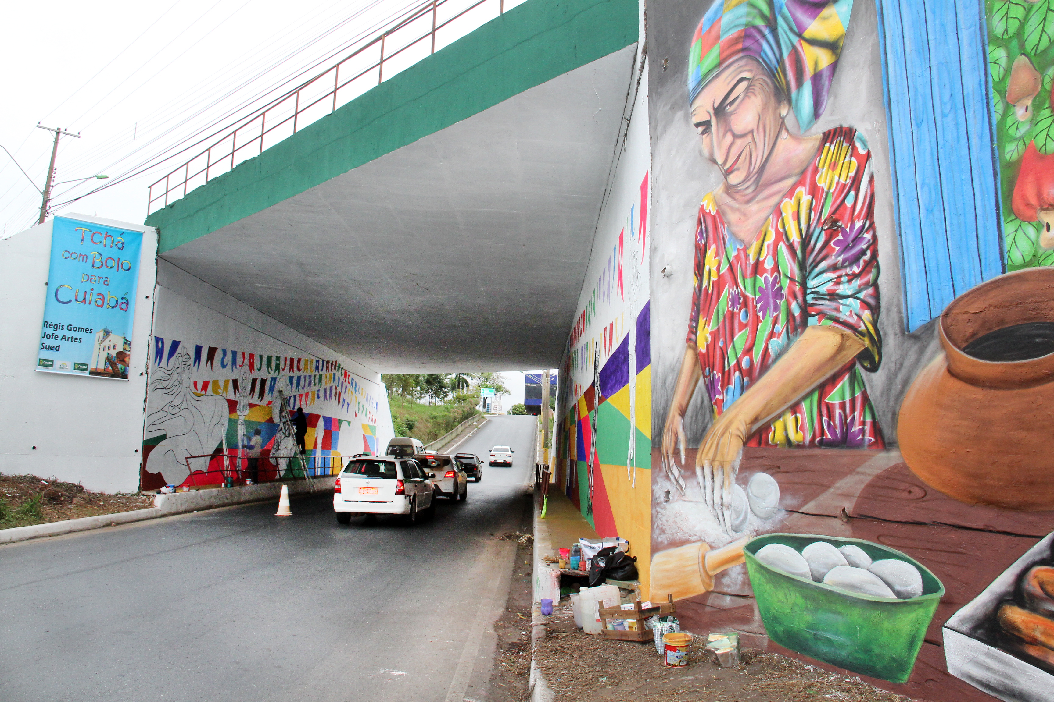 “Neste projeto chamado de´Tchá Com Bolo Pra Cuiabá', eu venho com a figura de uma senhora em primeiro plano. Ela está trabalhando fazendo o nossos bolinhos, que são tradicionais nas nossas festas de santo, não só de Cuiabá, mas de todo Mato Grosso. Essa mulher representa todas as mulheres, principalmente as antigas, que muito fizeram por essas festas, como a Festa de São Benedito. Em especial, a ’Dona Bem Bem´, que representa essas mulheres da baixada cuiabana e que deixou um legado dessa cultura. Quando a pessoa passar pelo túnel, vai poder observar o registro dessas festas tradicionais embaladas pelo rasqueado cuiabano”, afirma o artista plástico.