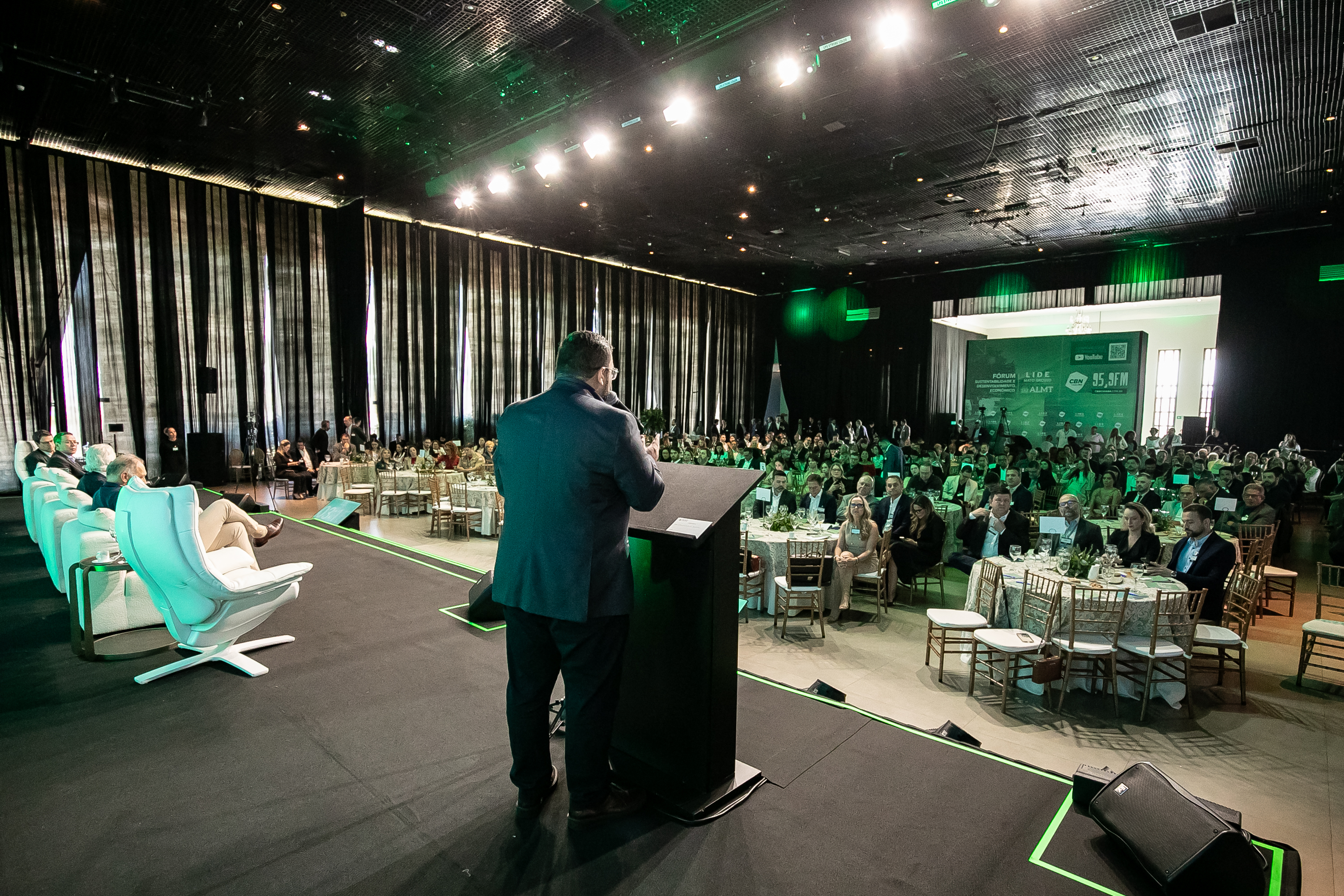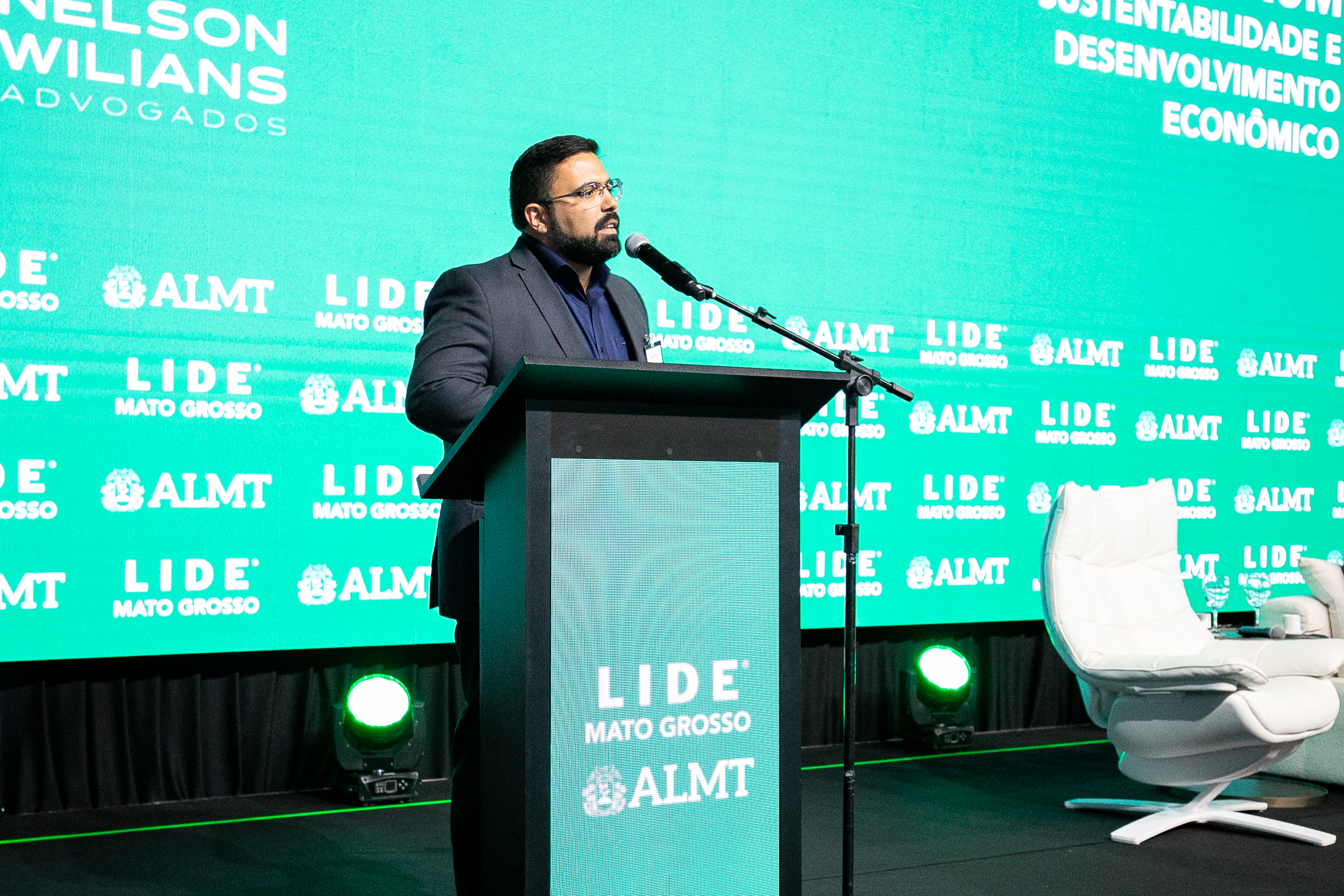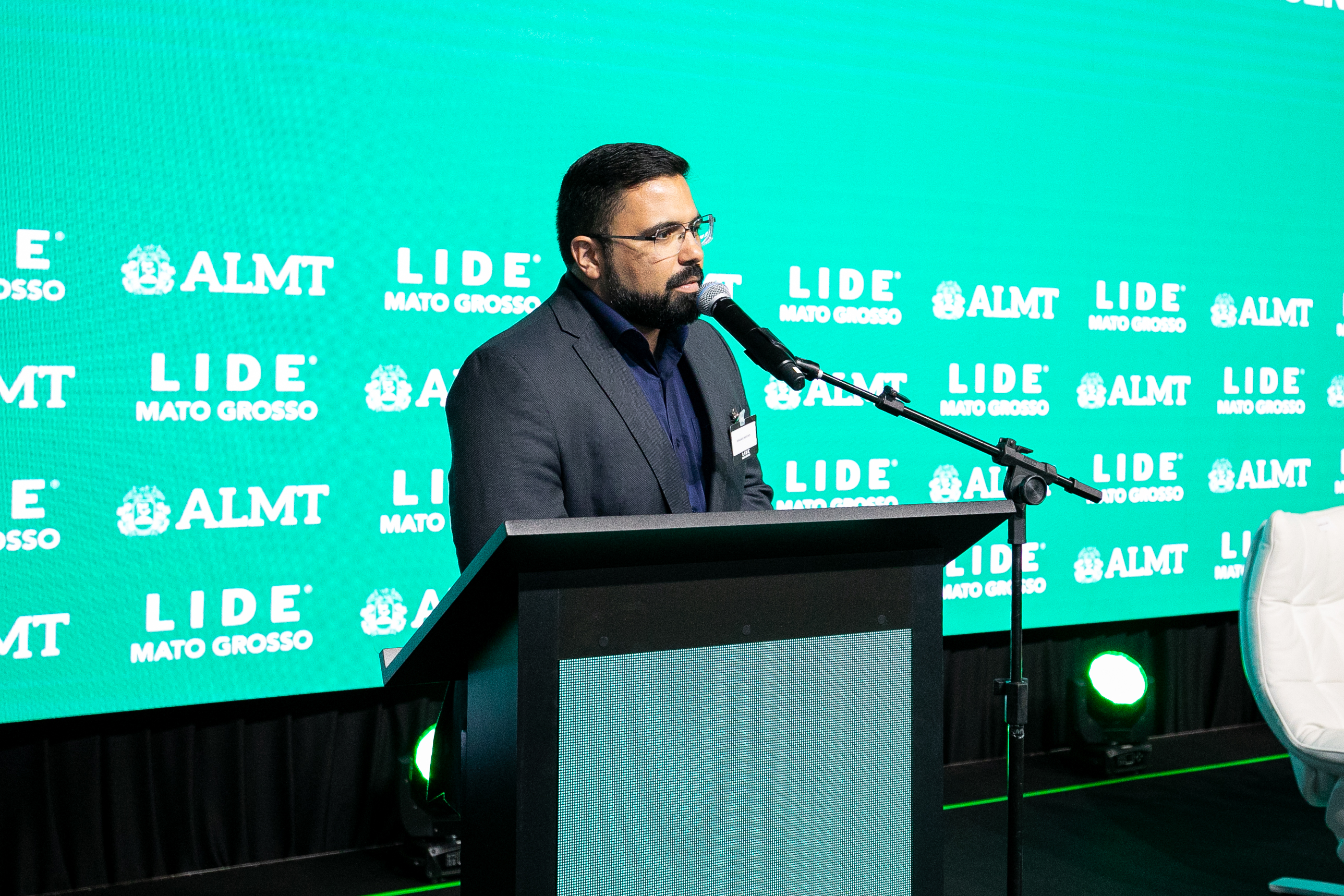 O secretário municipal de Turismo e Desenvolvimento Econômico, Fernando Medeiros, discursa durante o Fórum de Sustentabilidade e Desenvolvimento Econômico, promovido pelo LIDE Mato Grosso, em Cuiabá. Ao fundo, painel com a identidade visual do evento e da Assembleia Legislativa (ALMT)..