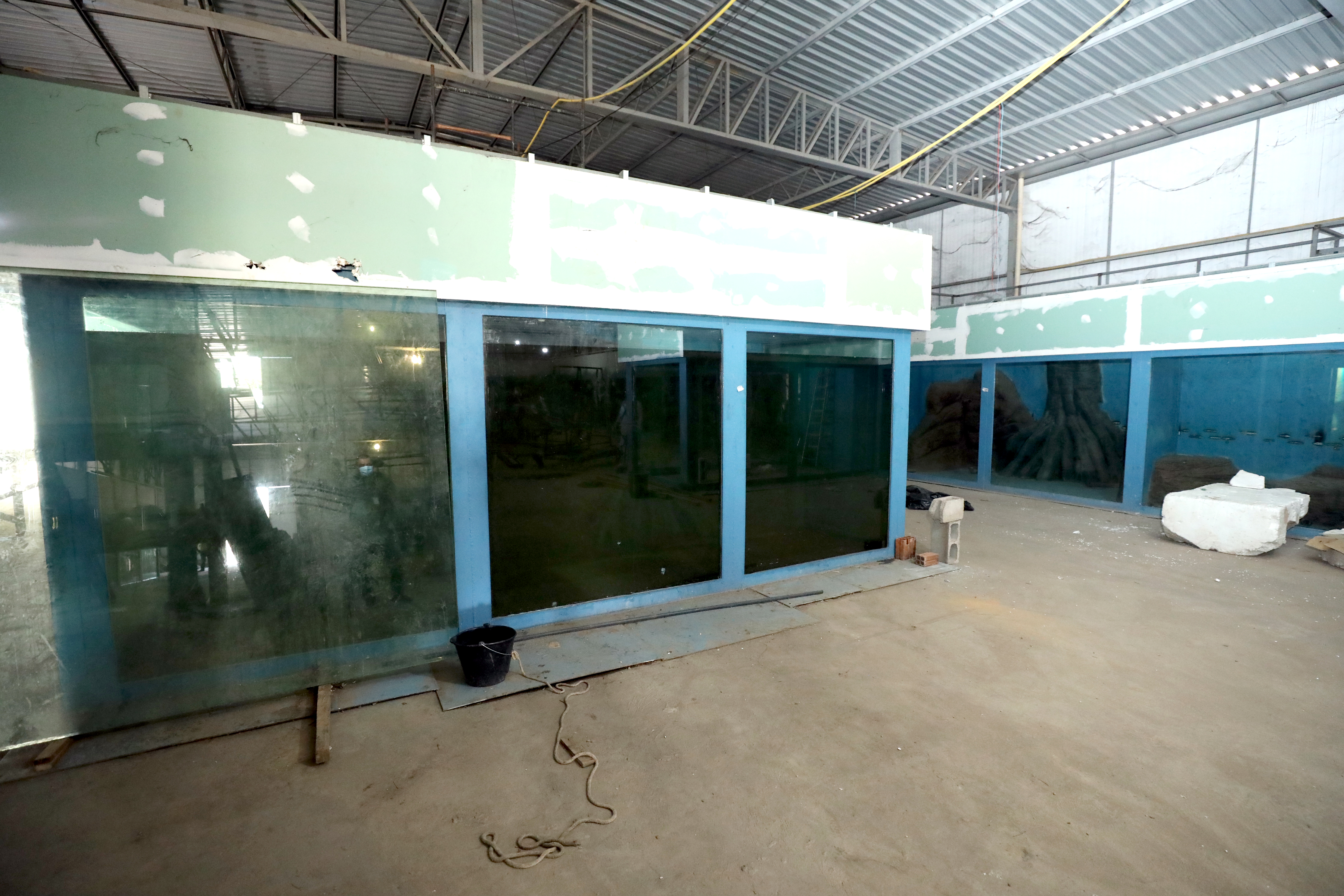 A reforma está na fase de instalação dos vidros. Dispostos como corredores horizontais aquáticos, o aquário é selado por 66 peças de vidro do tipo float temperado e laminado, respeitando as condições de segurança e qualidade de visibilidade do público. A compra foi adquirida via pregão eletrônico de n° 62/2019, com a empresa Bazzoni Comércio de Vidros Eireli.