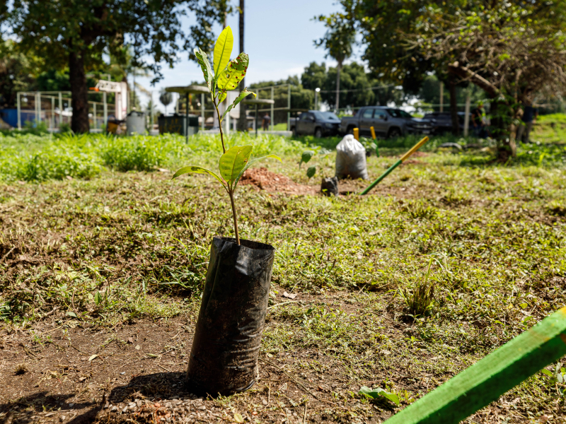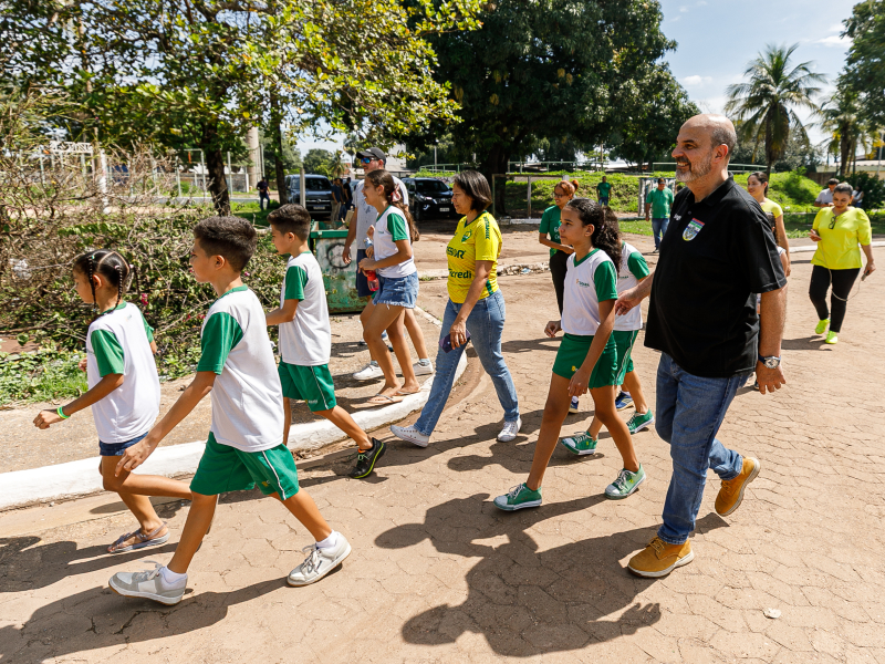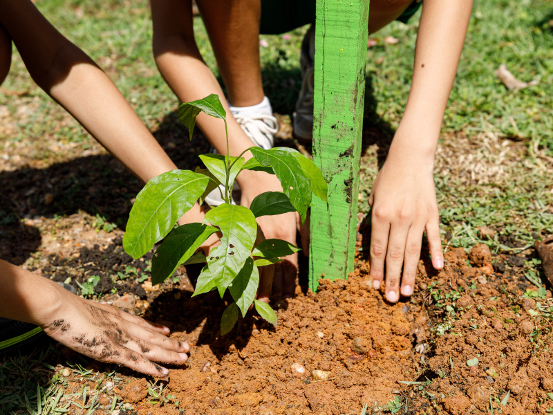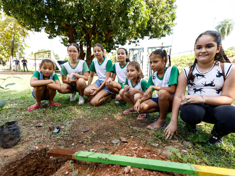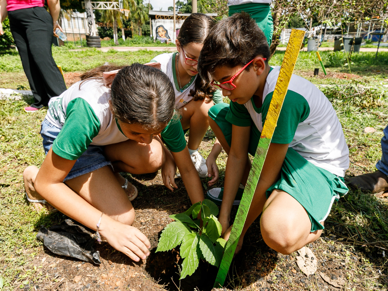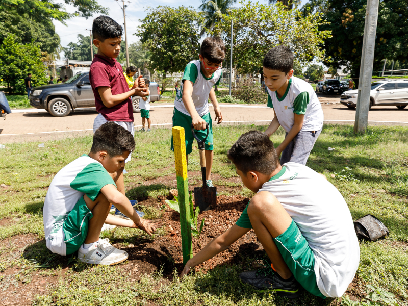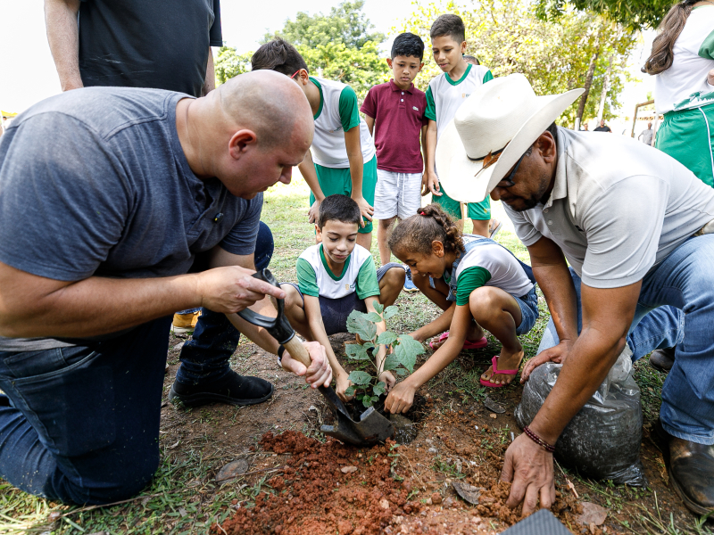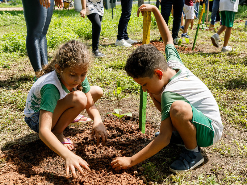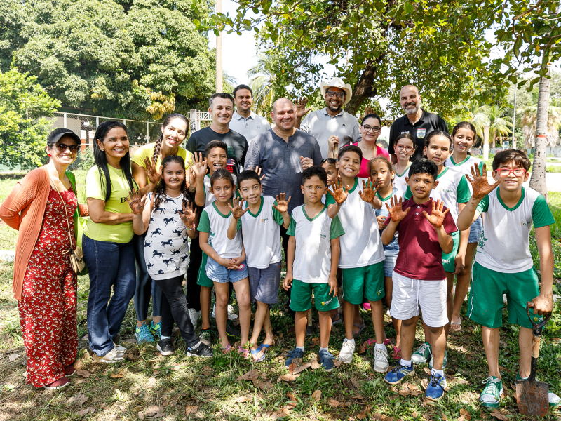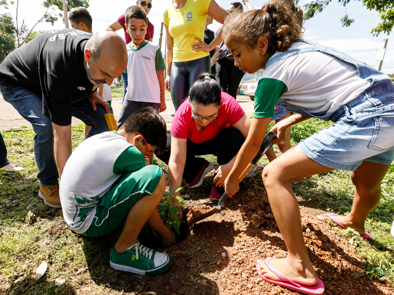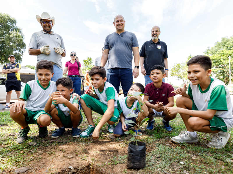 Prefeito, primeira-dama e secretários plantam árvores com alunos da rede municipal