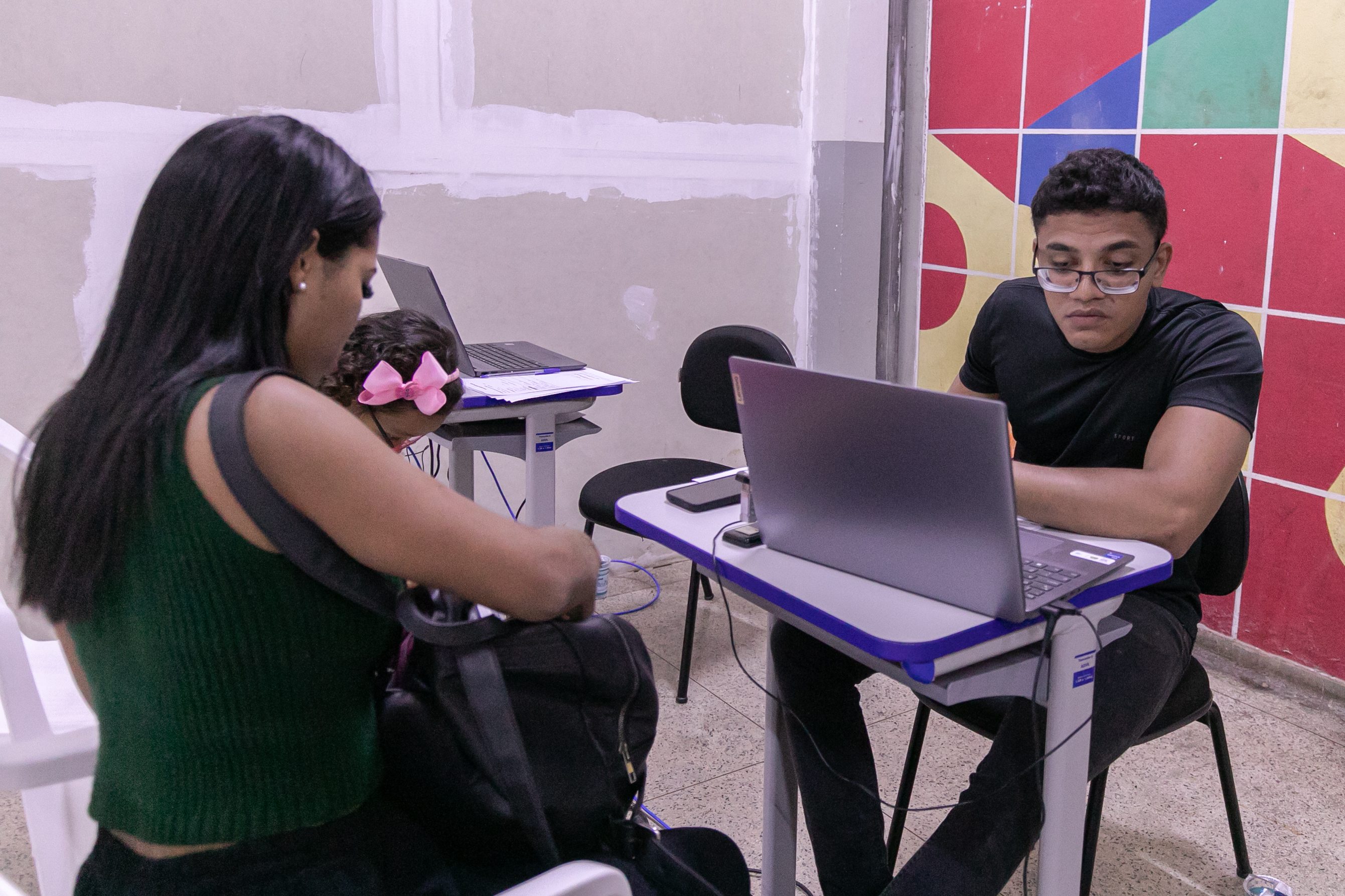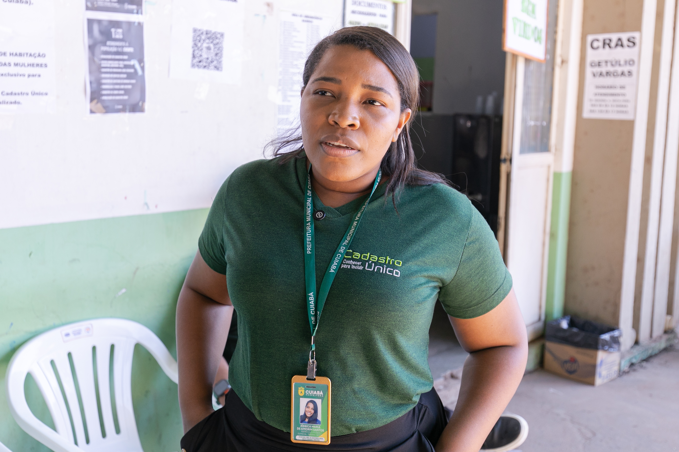 A imagem registra o momento de atendimento durante o 1º Mutirão do CadÚnico, realizado no CRAS Getúlio Vargas, em Cuiabá.