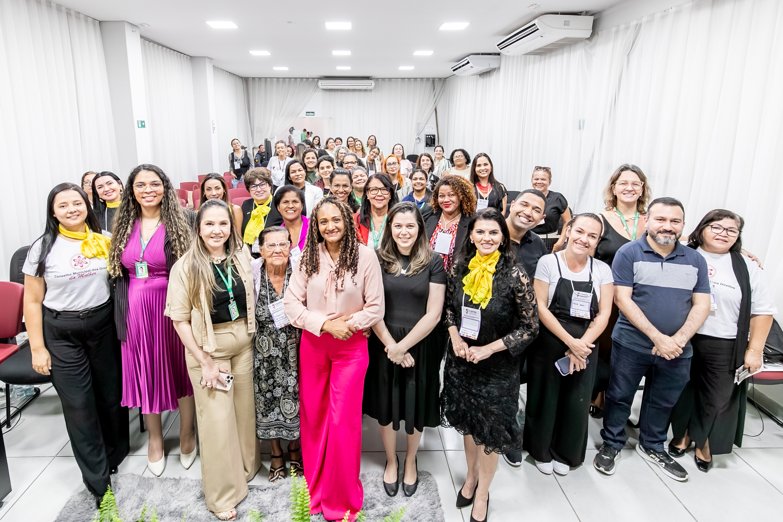 A imagem mostra as participantes da 5ª Conferência Municipal de Políticas para as Mulheres reunidas para fotografia no final do evento.