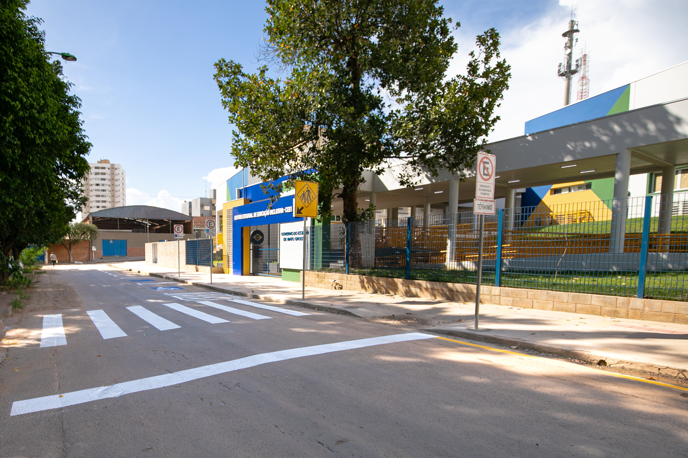O serviço de implantação de faixas de pedestres, sinalização indicando estacionamento regulamentado para vans escolares e colocação de placas para idosos e pessoas com deficiência foi realizado pela Secretaria de Mobilidade Urbana (Semob).