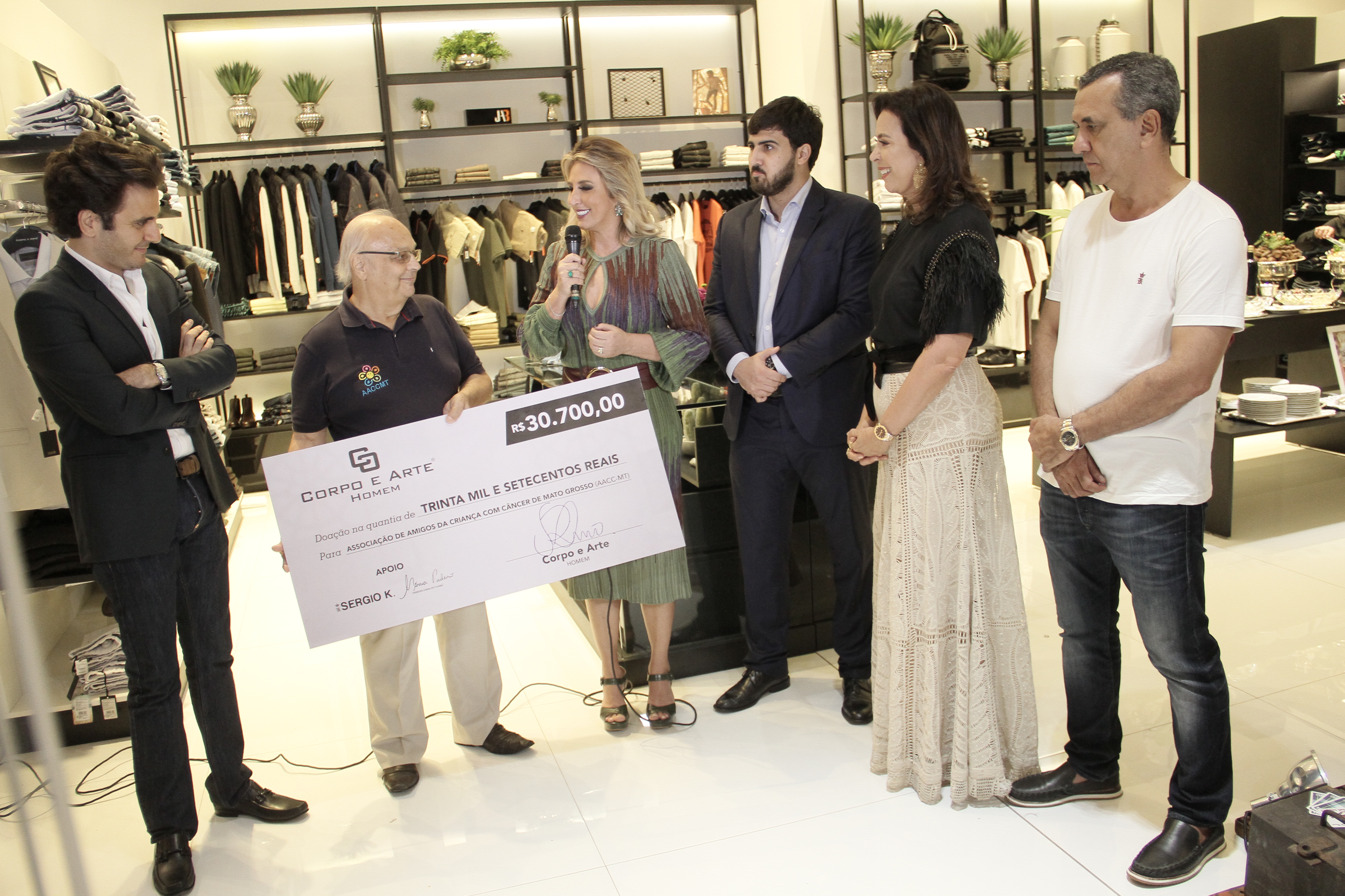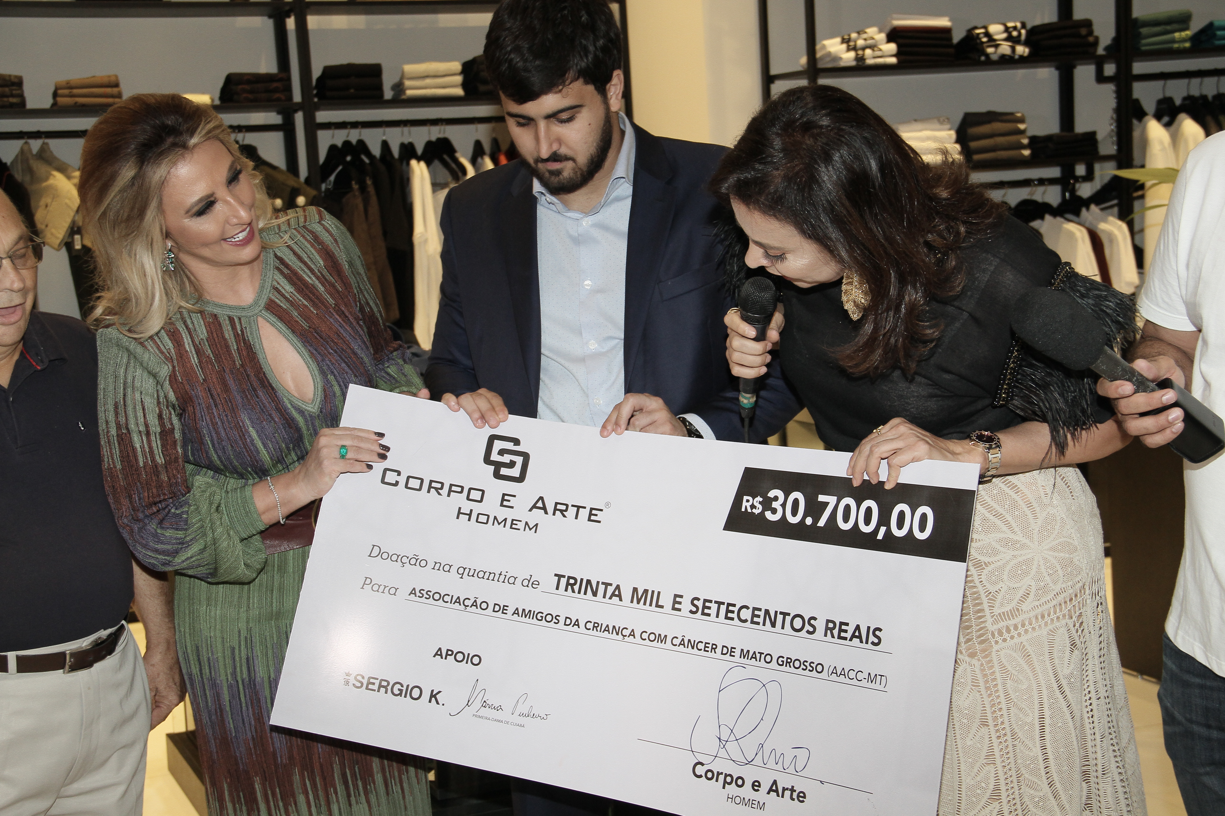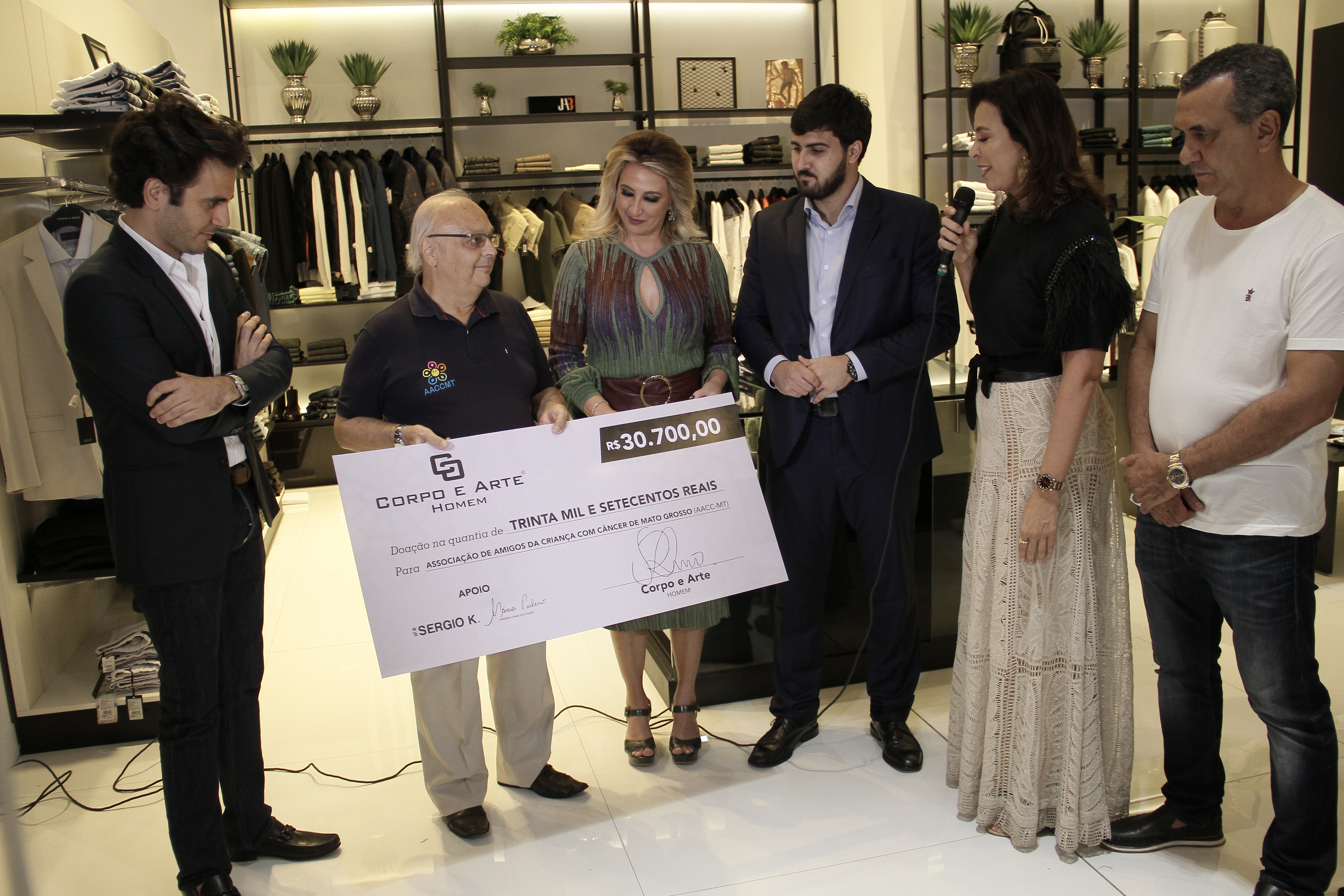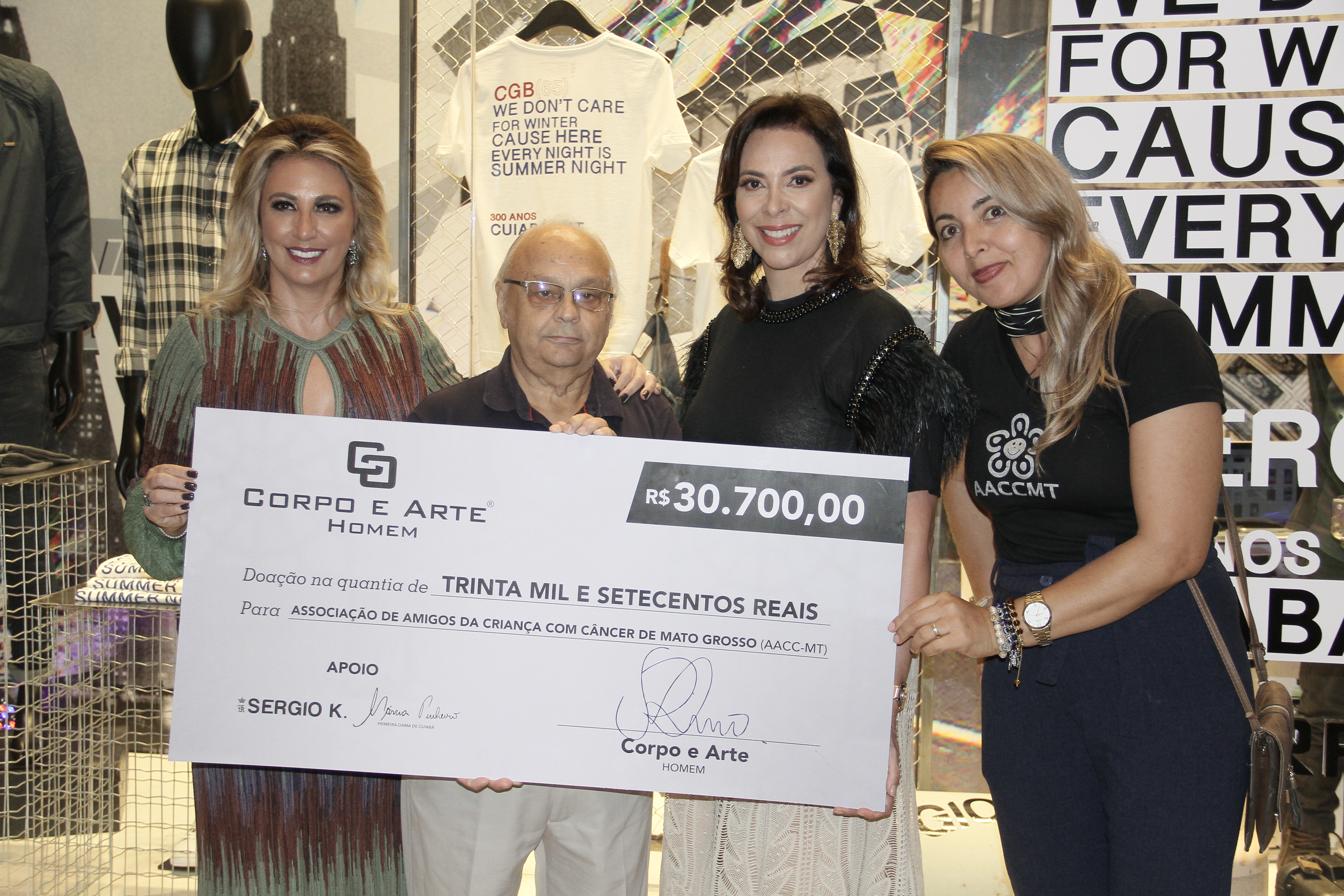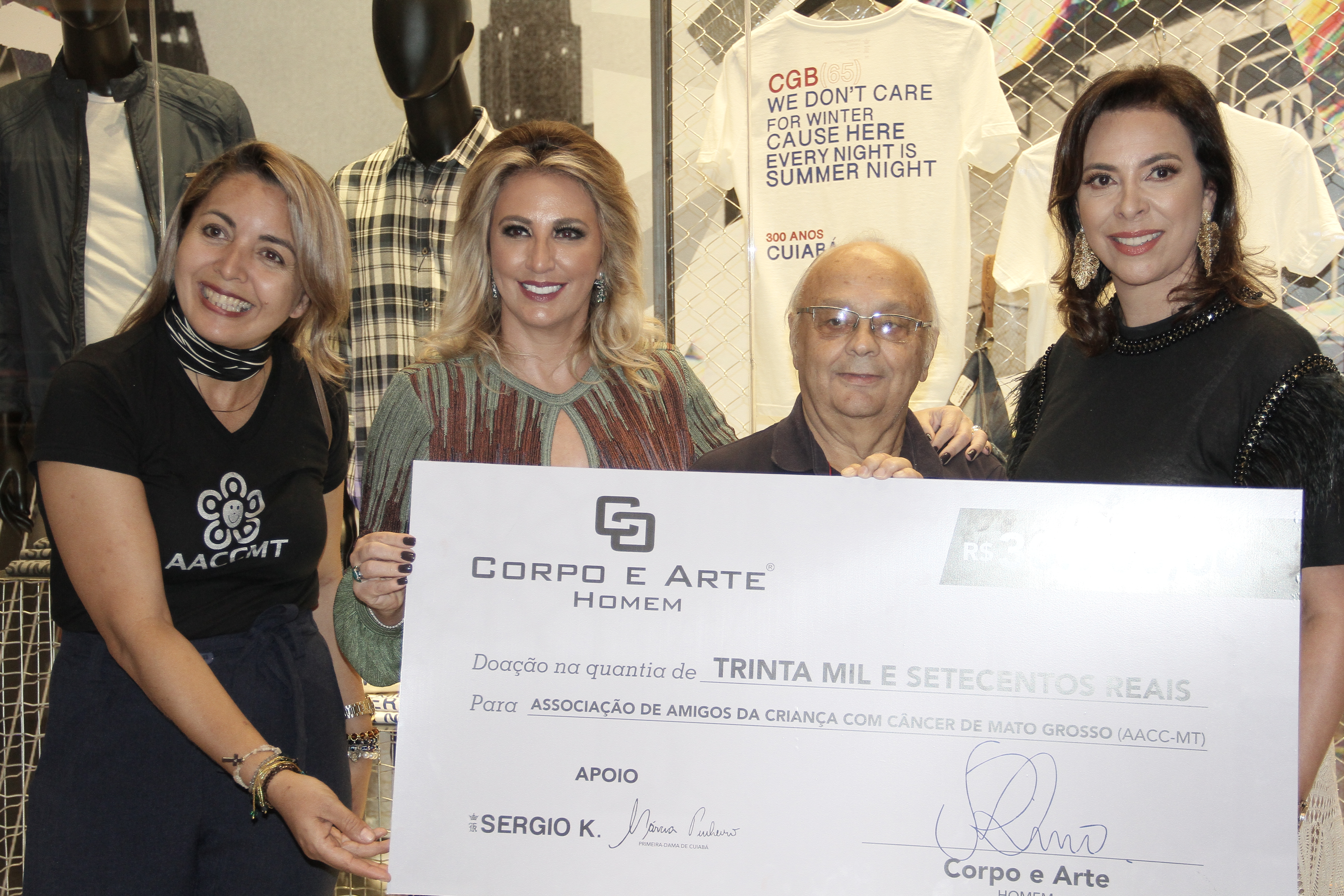 Parte das vendas da camiseta dos 300 anos, assinada pelo renomado estilista Sérgio K, proporcionou a renda de R$ 30,7 mil destinados à Associação de Amigos da Criança com Câncer de Mato Grosso (AACC-MT). A entrega simbólica do cheque à instituição aconteceu, nesta quinta-feira (11), na loja Corpo e Arte Homem, do Shopping Estação, principal parceria da ação beneficente.
