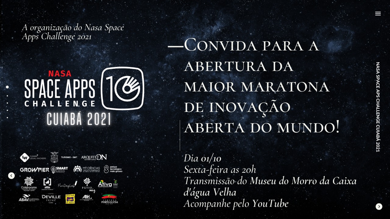A Prefeitura de Cuiabá, por meio da Secretaria Municipal de Turismo, convida para a live de abertura da maior maratona de inovação aberta do mundo: a 10ª Edição do Nasa Space Apps Challenge Cuiabá 2021”. O evento terá incício na noite desta sexta-feira (1), a partir das 20 horas, no Museu da Caixa D´Água Velha. A fim de manter as normas de biossegurança necessárias para evitar a propagação do coronavírus, o evento será transmitido em tempo real, pelos canais oficiais da Prefeitura de Cuiabá: Facebook: https://www.facebook.com/prefeituracba e Instagram: https://www.instagram.com/cuiabaprefeitura/.
