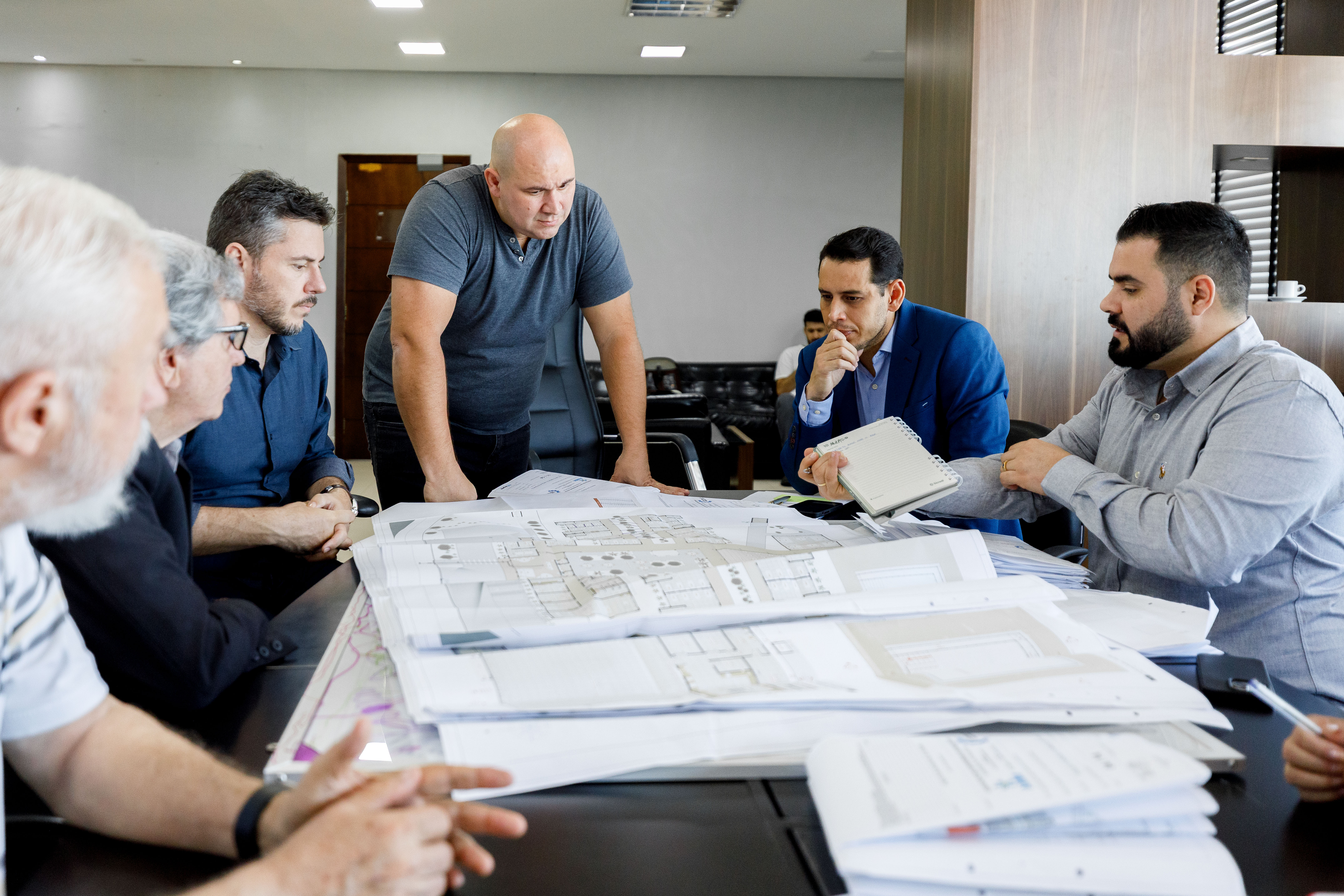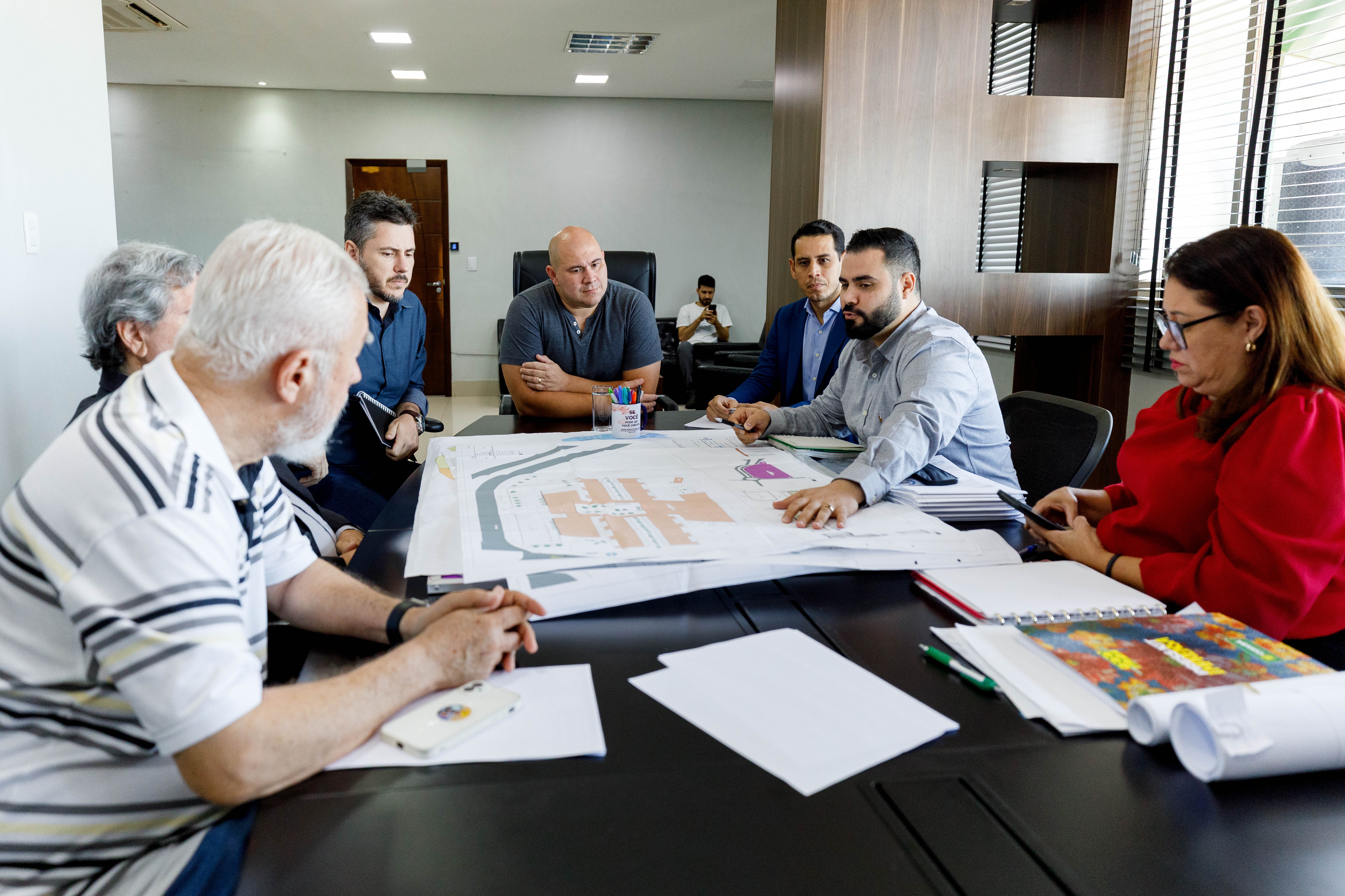 Na imagem principal o prefeito Abilio Brunini observa uma planta do projeto arquitetônico da Instituição de Longa Permanência para Idosos. Abilio está de pé e ao seu entorno em uma mesa estão os participantes do encontro que observam o desenho do projeto nas mãos do gestor.