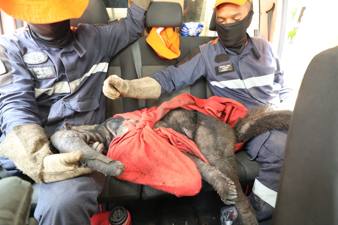 Agentes da Defesa Civil resgatam tamanduá-bandeira gravemente ferido em decorrência de queimadas