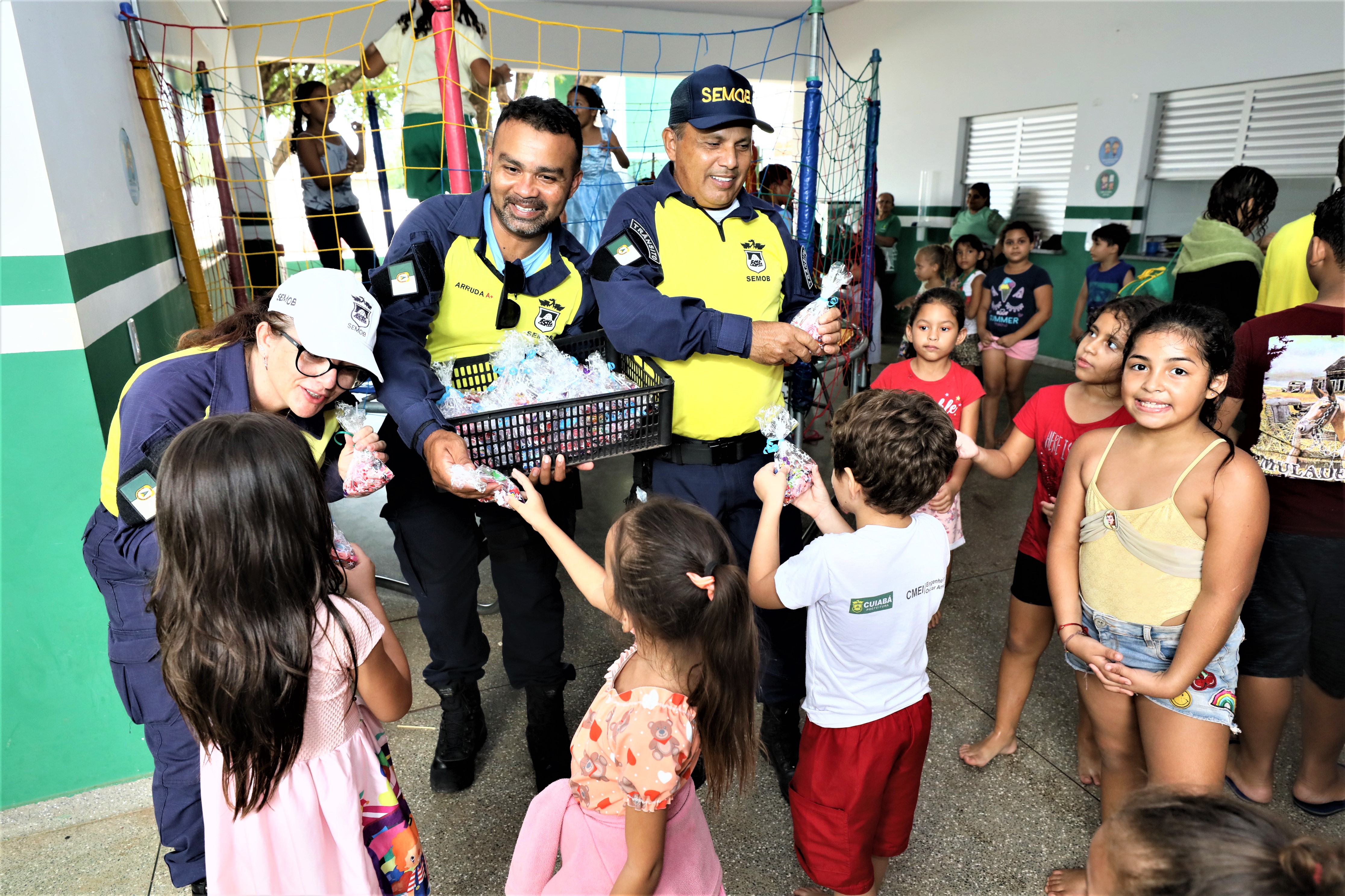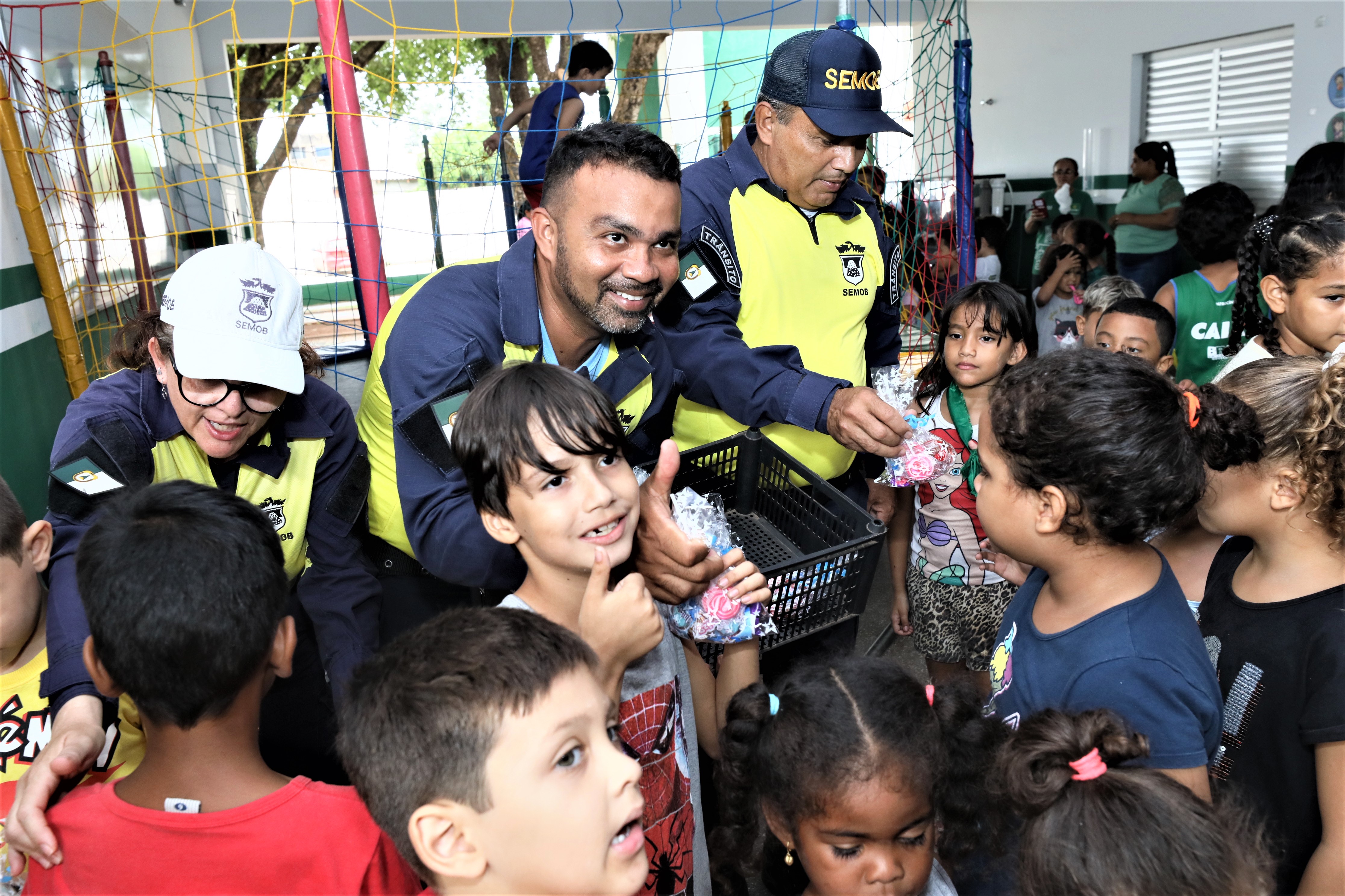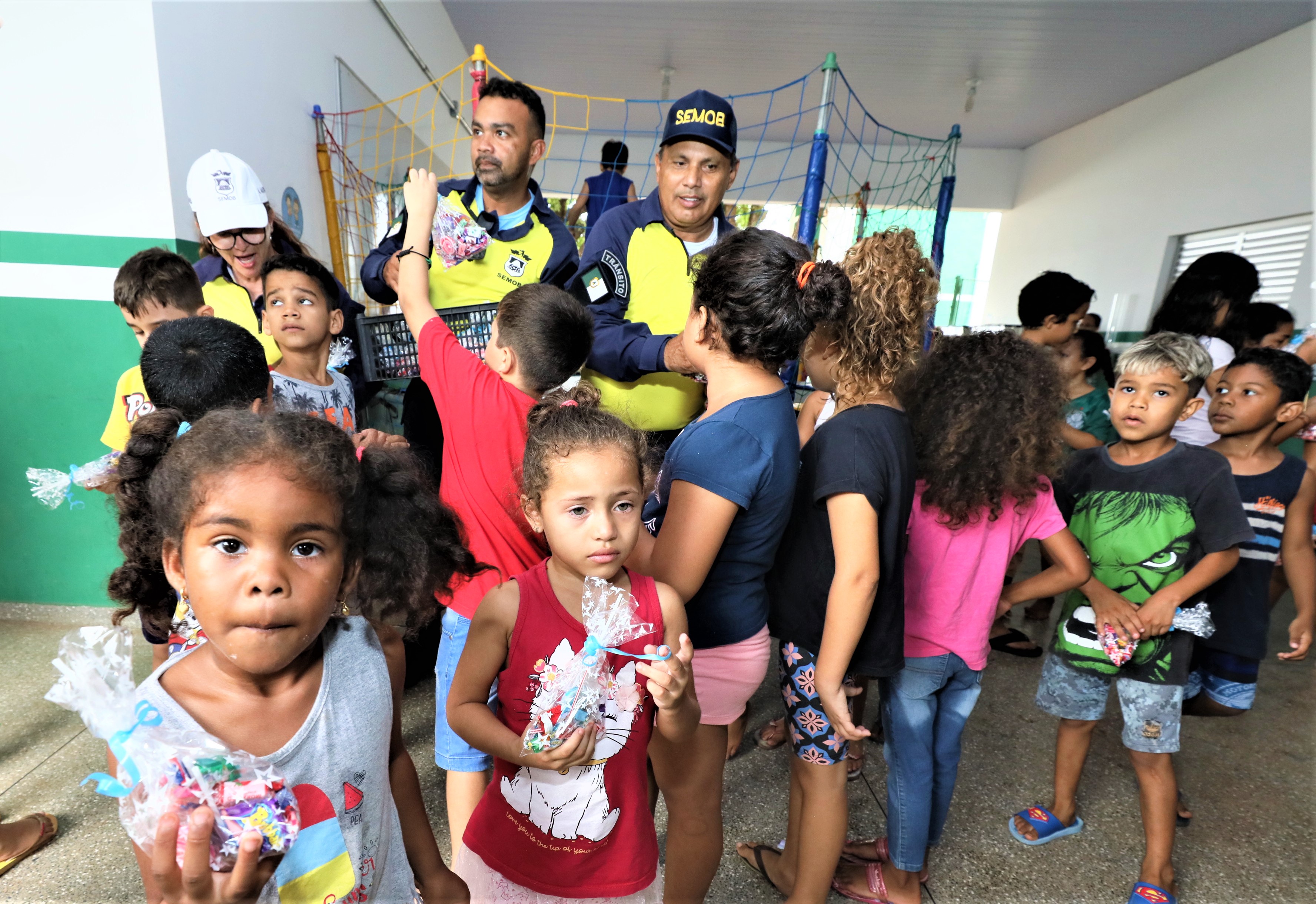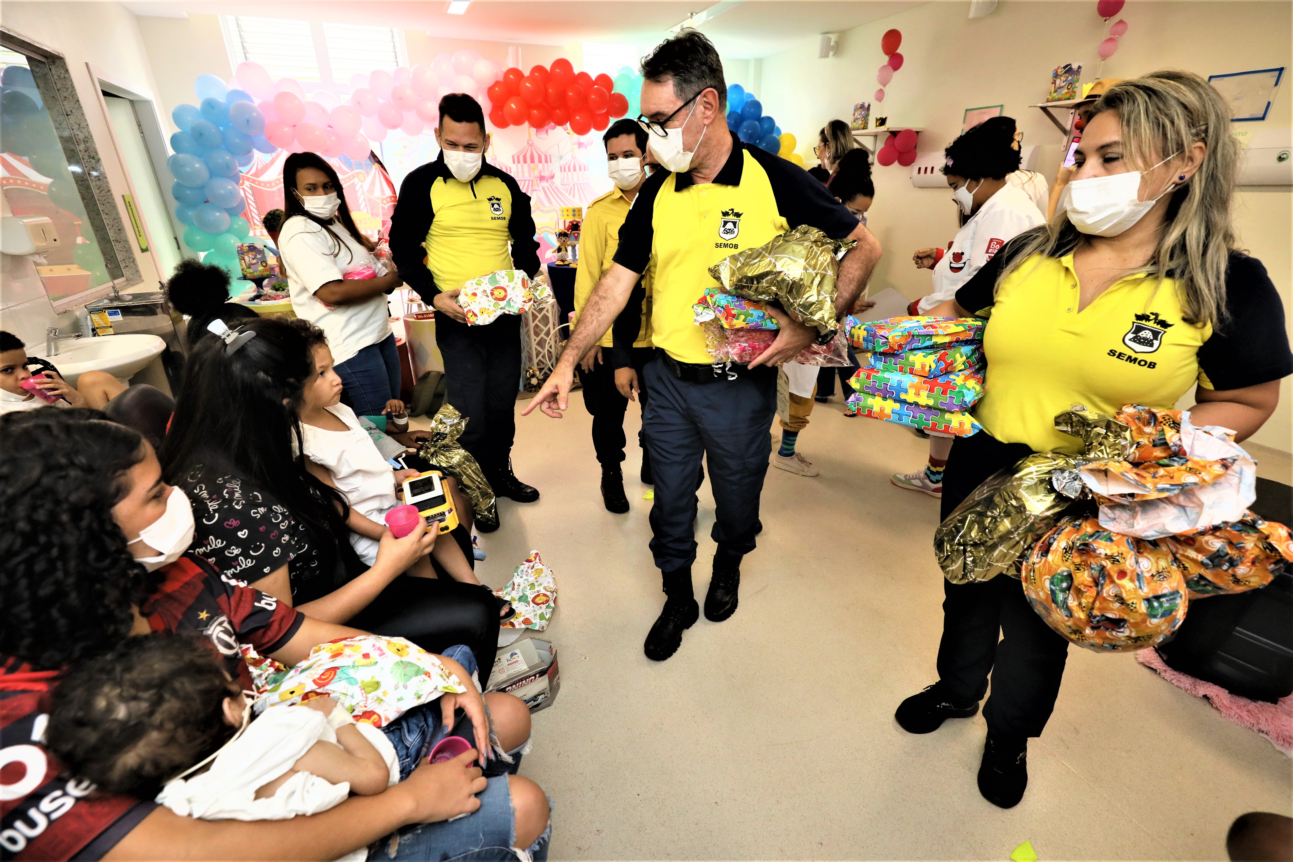 Os agentes de trânsito da Secretaria de Mobilidade Urbana (Semob), da Prefeitura de Cuiabá, realizaram na manhã de terça-feira (11), a entrega de brinquedos para crianças e adolescentes internados no Hospital Municipal de Cuiabá Dr. Leony Palma de Carvalho (HMC) e também para alunos da Escola Municipal Irmã Maria Betty, no bairro Novo Mato Grosso. Os atos de solidariedade integram a semana de atividades comemorativas ao 'Dia das Crianças', celebrado nesta quarta-feira, 12 de outubro. Bolas, bonecas, carrinhos e fones de ouvido foram distribuídos.