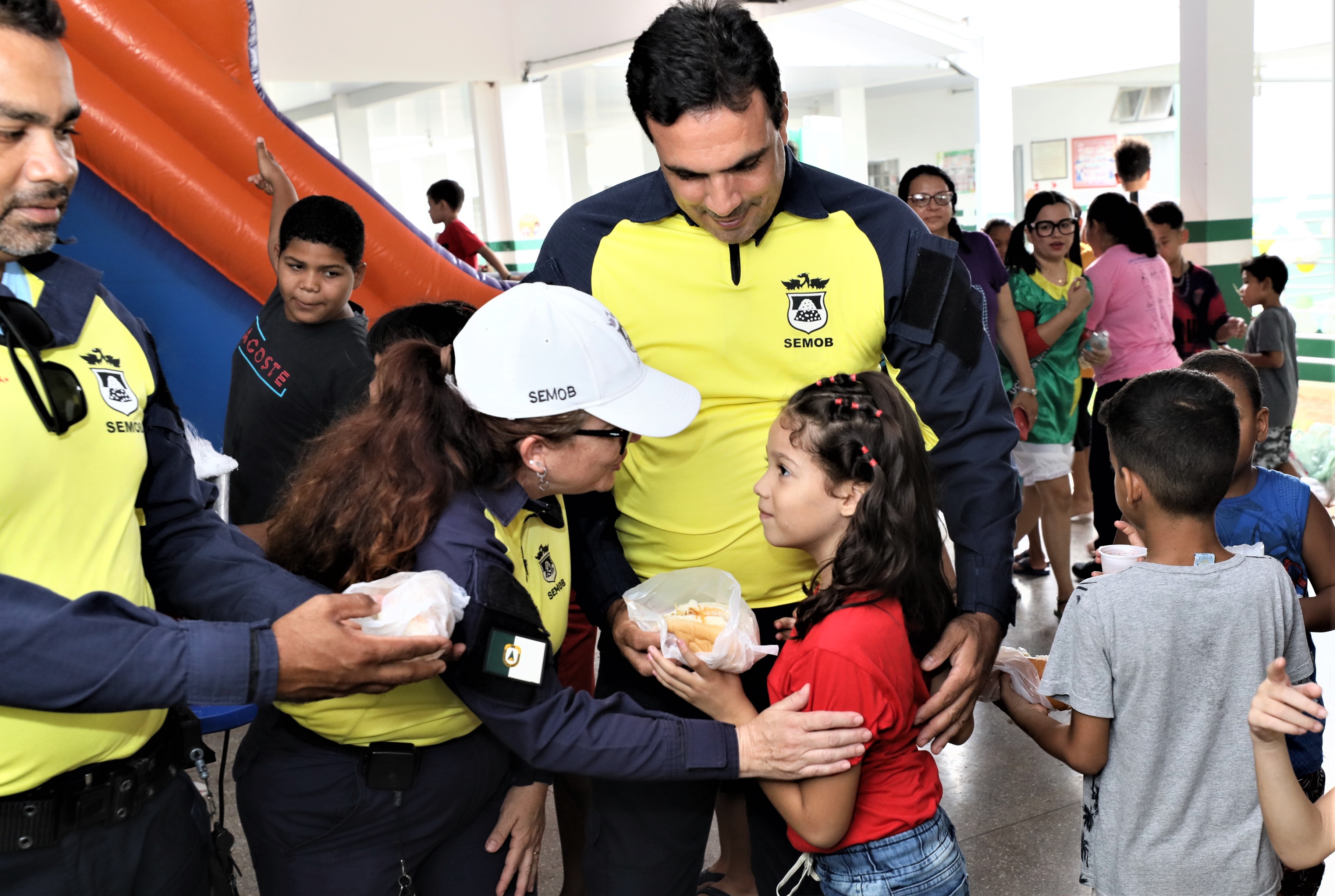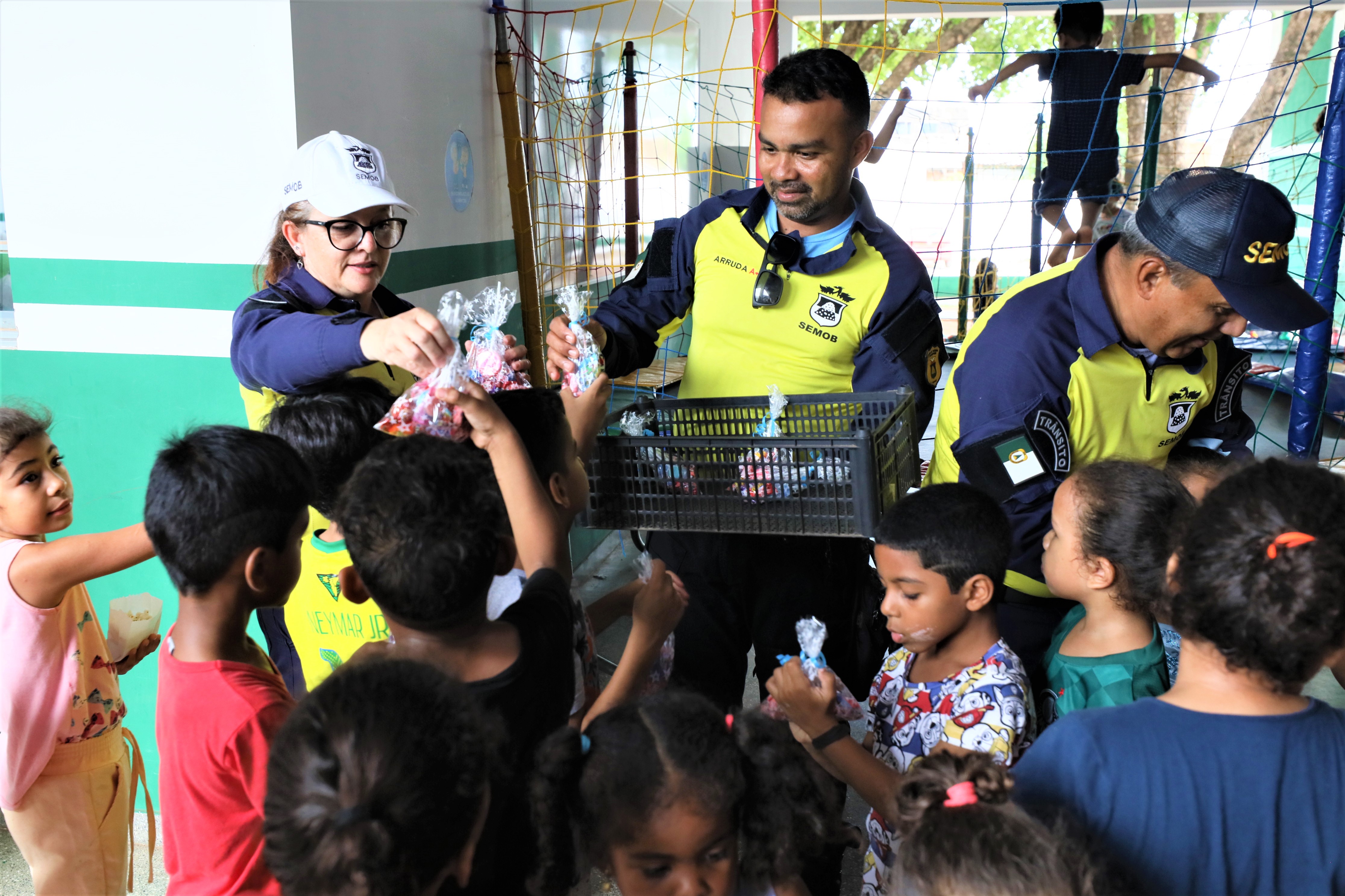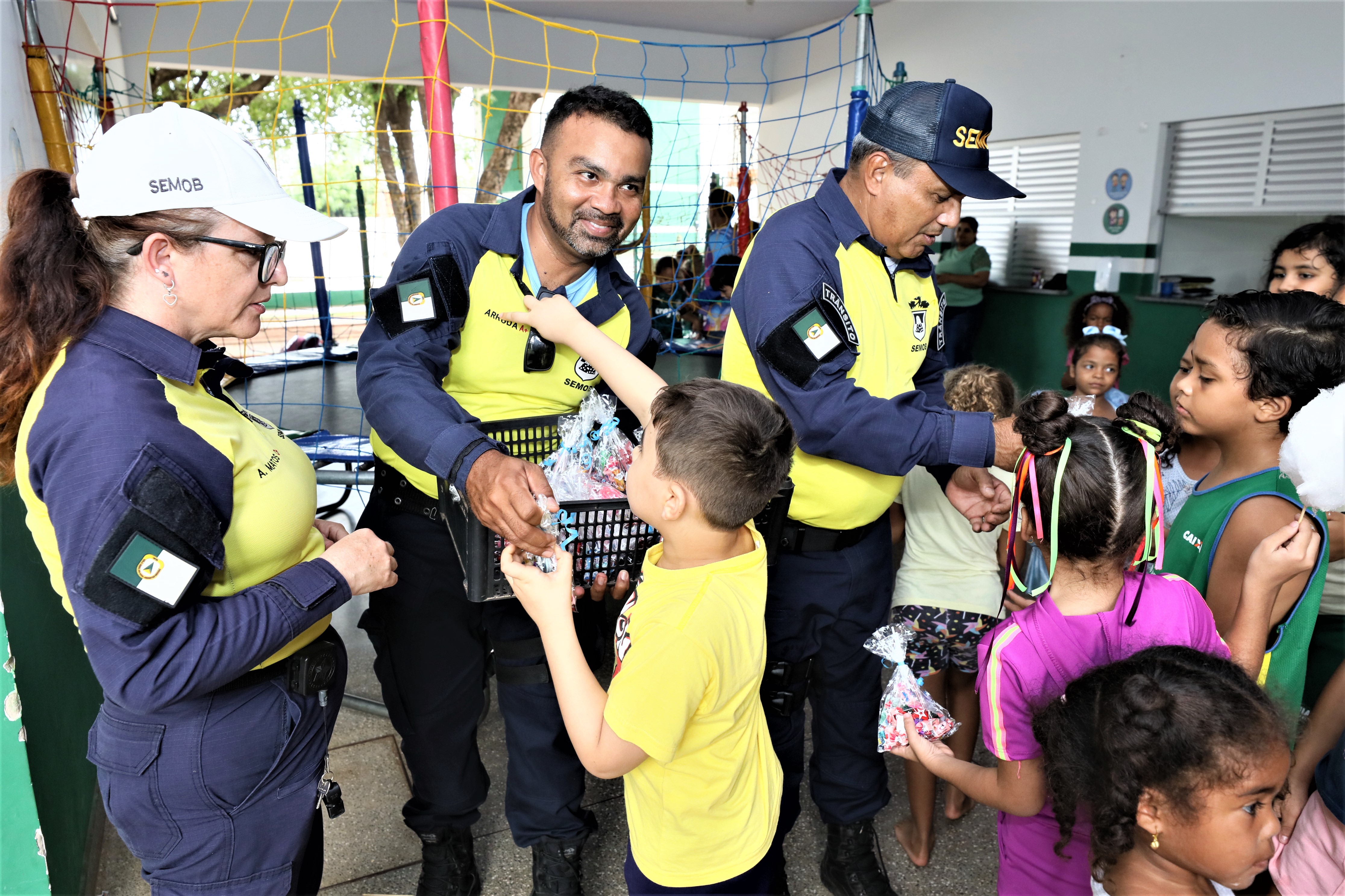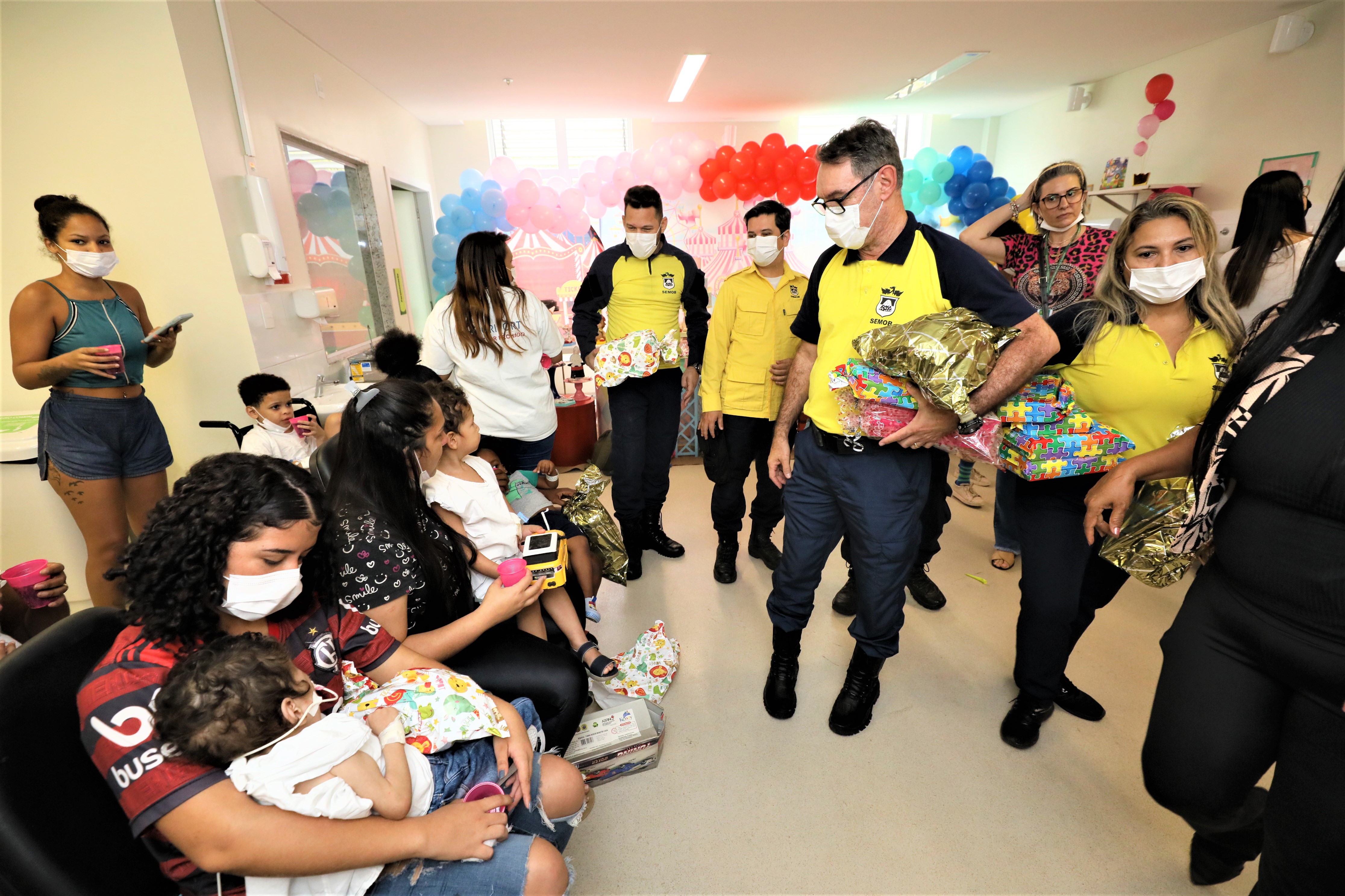 Os agentes de trânsito da Secretaria de Mobilidade Urbana (Semob), da Prefeitura de Cuiabá, realizaram na manhã de terça-feira (11), a entrega de brinquedos para crianças e adolescentes internados no Hospital Municipal de Cuiabá Dr. Leony Palma de Carvalho (HMC) e também para alunos da Escola Municipal Irmã Maria Betty, no bairro Novo Mato Grosso. Os atos de solidariedade integram a semana de atividades comemorativas ao 'Dia das Crianças', celebrado nesta quarta-feira, 12 de outubro. Bolas, bonecas, carrinhos e fones de ouvido foram distribuídos.