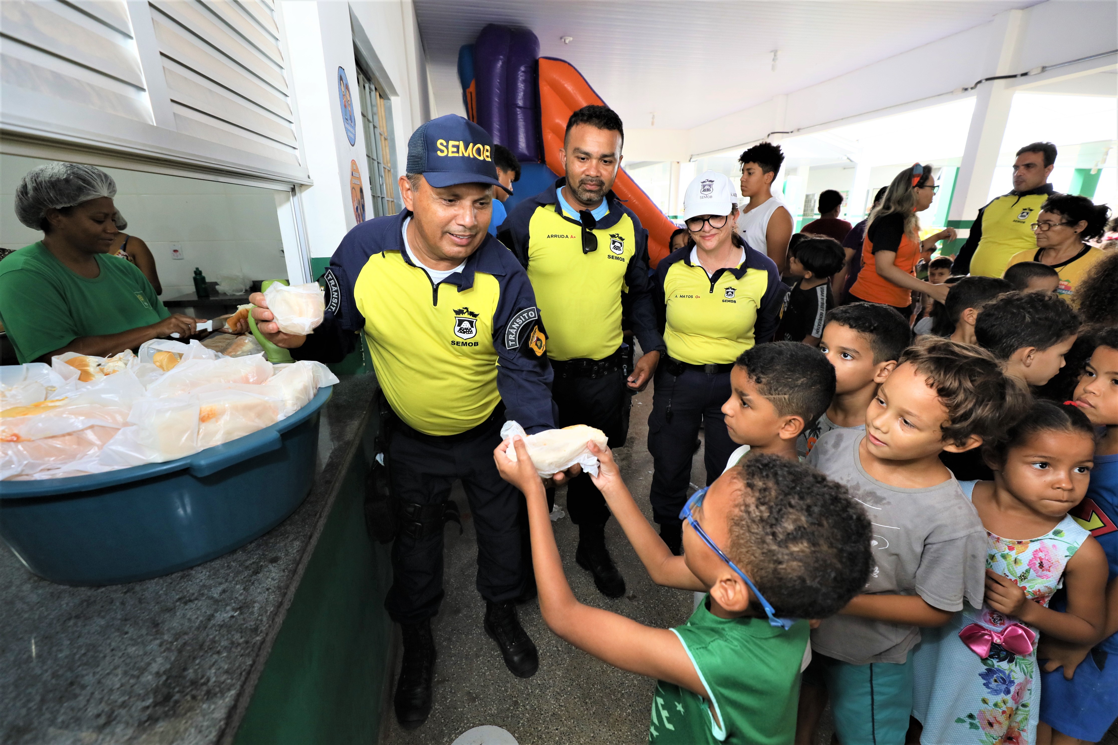 Agentes da Semob doam brinquedos para crianças e adolescentes no HMC e em escola do município